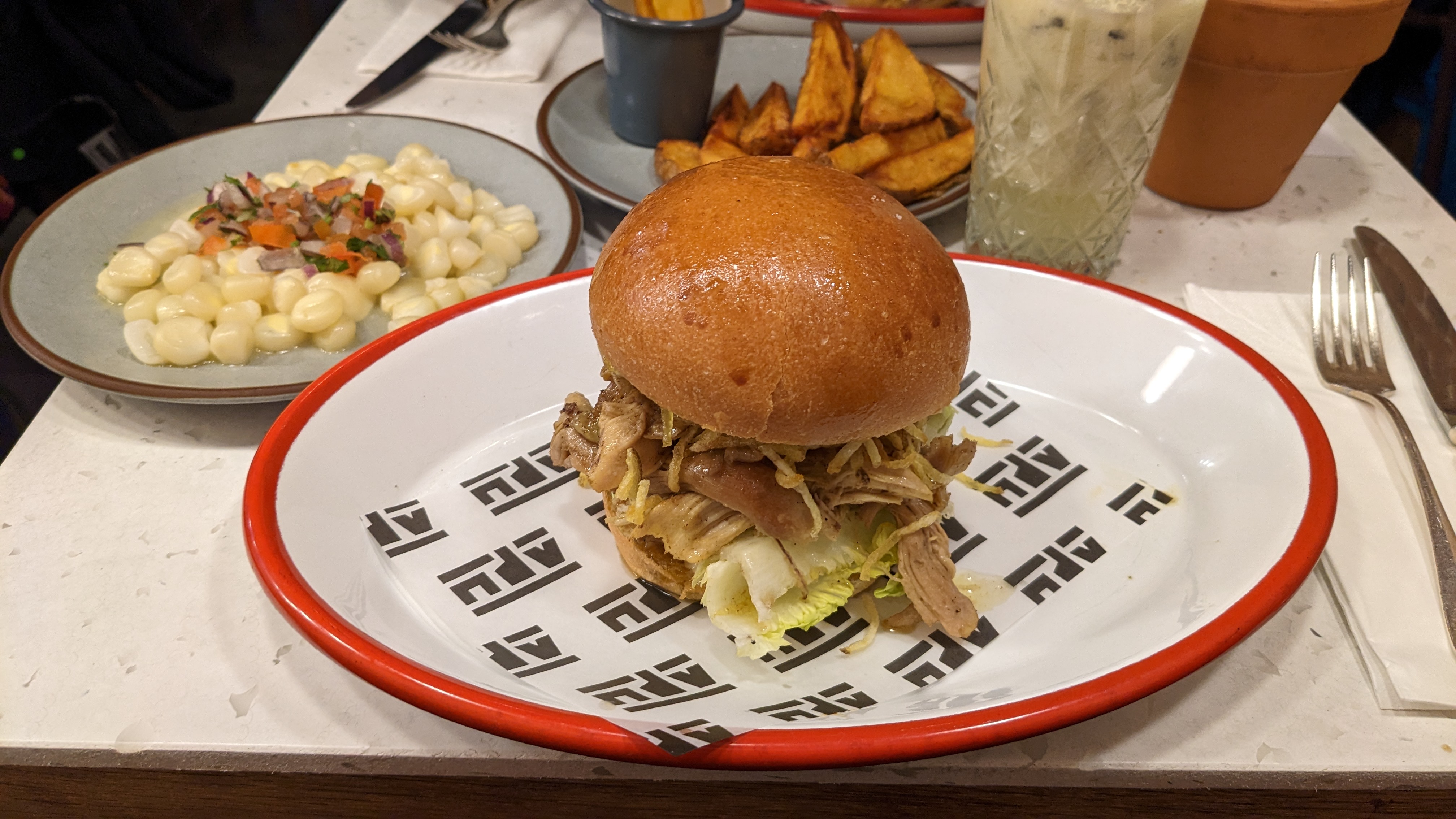 Burger péruvien au porc confit, très bien garni, très bien épicé et assaisonné. Coca maison très frais et agréable, potatoes croquantes et fondantes comme il faut. Propose d'autres plats péruviens en dehors des burgers. Tout à l'air appétissant. Mais choisir c'est renoncer.