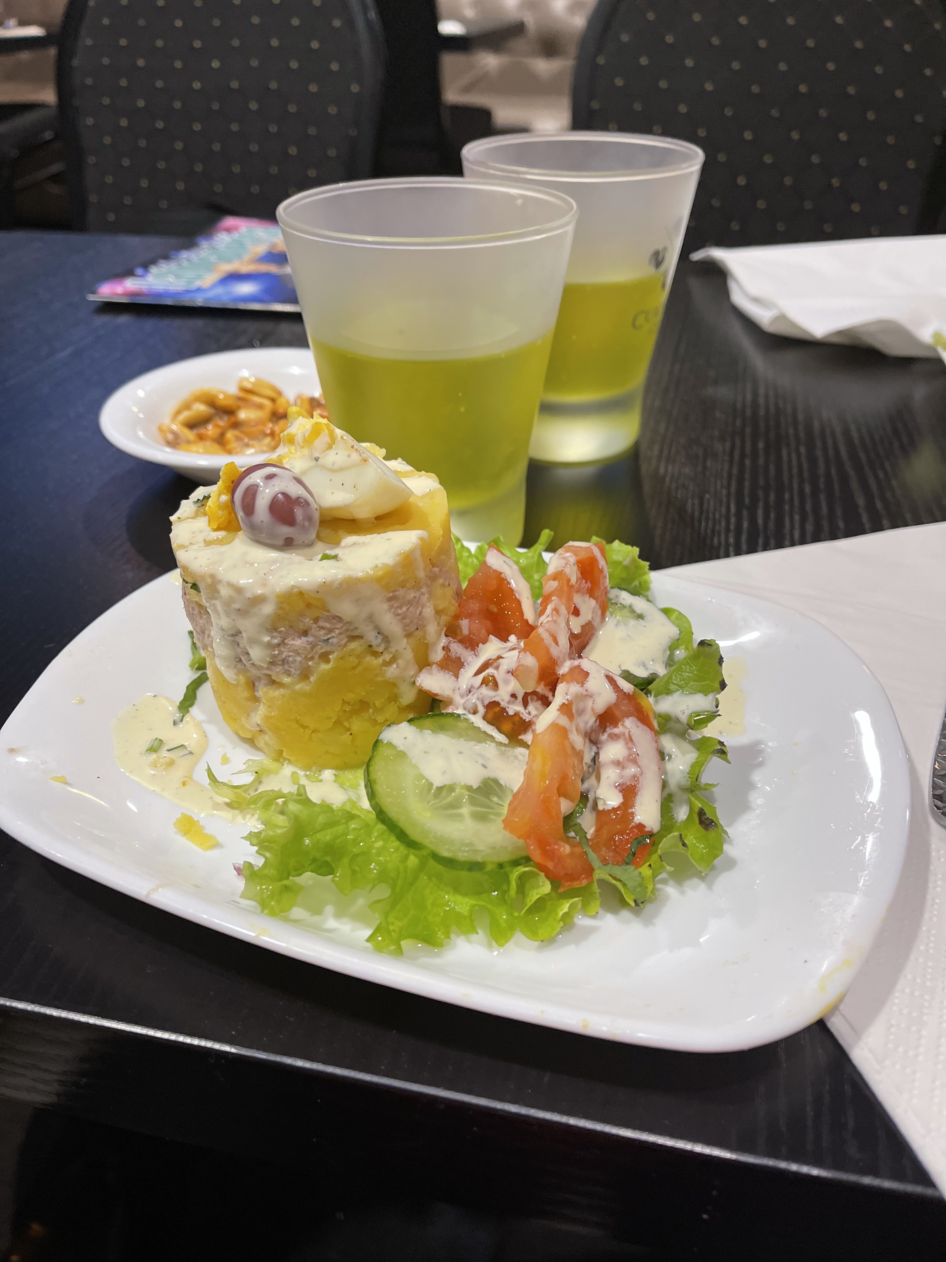 Le ceviche et l'arroz chaufa ça allait encore mais en entrée j'ai pris une causa qui n'était vraiment pas bonne. Le thon et avocat casiment inexistants (la limeña c'est plus avec du poulet d'ailleurs) et beaucoup d'oignons. Pas du tout agréable en goût (pire causa que j'ai pu goûter tout pays confondu).