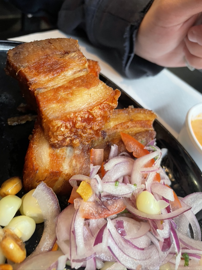 Cela faisait un moment que j'avais envie d'y aller parce que je voyais toujours que c'était un endroit plein de Péruviens et je me suis dit : ça doit être délicieux et authentique. La vérité TOP. Du Pisco Sauer... À mon assiette de couennes de porc... ils étaient 10. Les entrées avaient l'air très bonnes et nous avons partagé une sorte de salade de thon entre purée de pommes de terre et avocat... Cela nous a rappelé les pommes de terre assaisonnées de mon terroir, puis nous sommes passés au ceviche de poisson - pas celui mélangé - et au chicharron. J'ai beaucoup aimé le fait que ce soient des plats très basiques et traditionnels... Mais très bien présentés et la nourriture était très bonne... Et le garçon qui nous a servi était très correct. L'endroit n'est pas très joli (à mon goût... et selon les couleurs)... Mais c'est propre et les tables sont grandes... donc... Tutti benne Dans ce monde, il faut avoir l'envie et ce restaurant l'a.