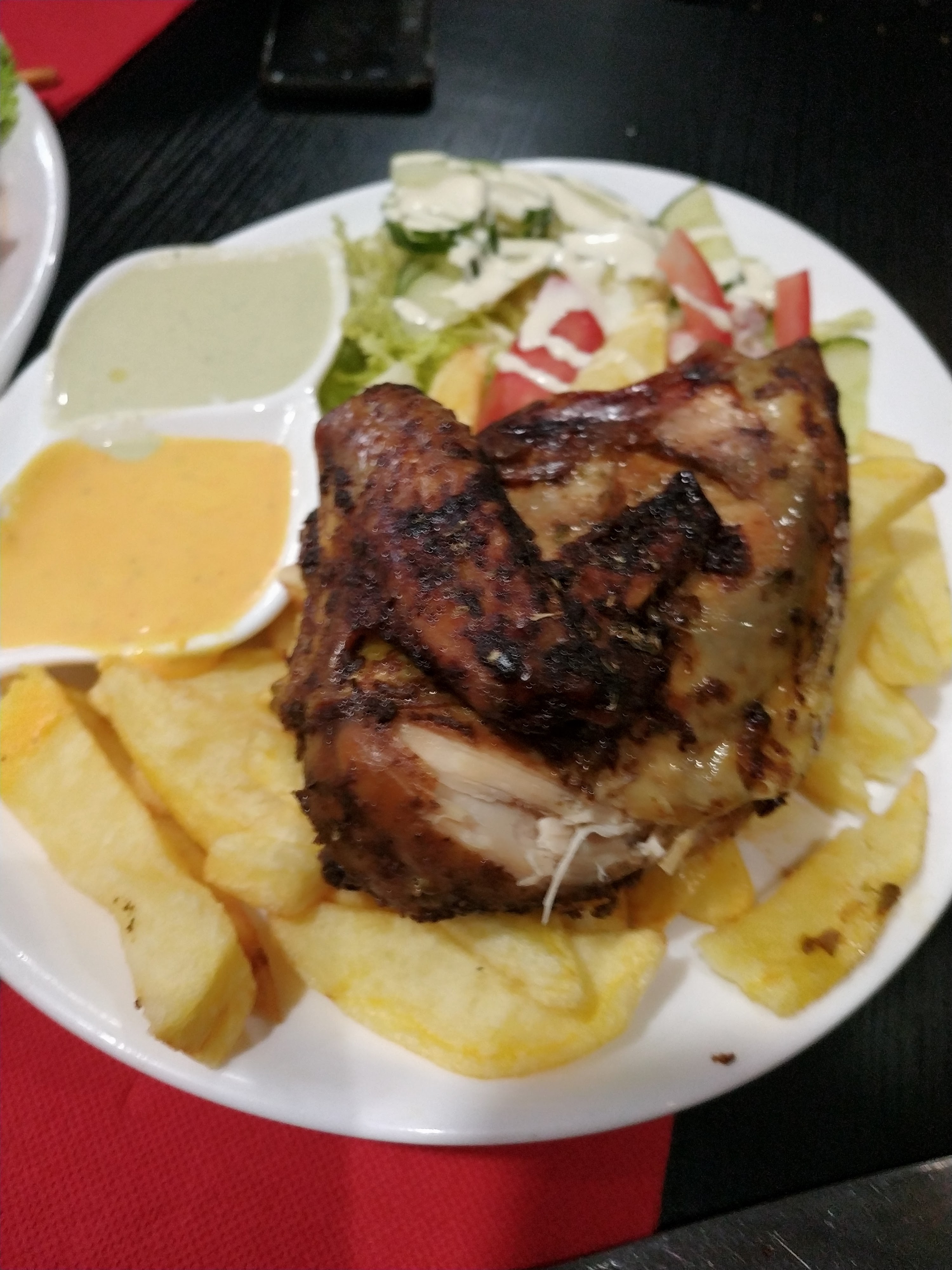 Bonjour nous sommes passés pour le déjeuner cette jour là nous avons commandé un lèche de tigré ils avait mis trop du sel plus un arroz chaufa mis trop du sel nous allons commandé un poulet à la brasa ils ont tout mélanger salade et frites 🍟 je suis une client mais cette fois je suis dégoûtée....