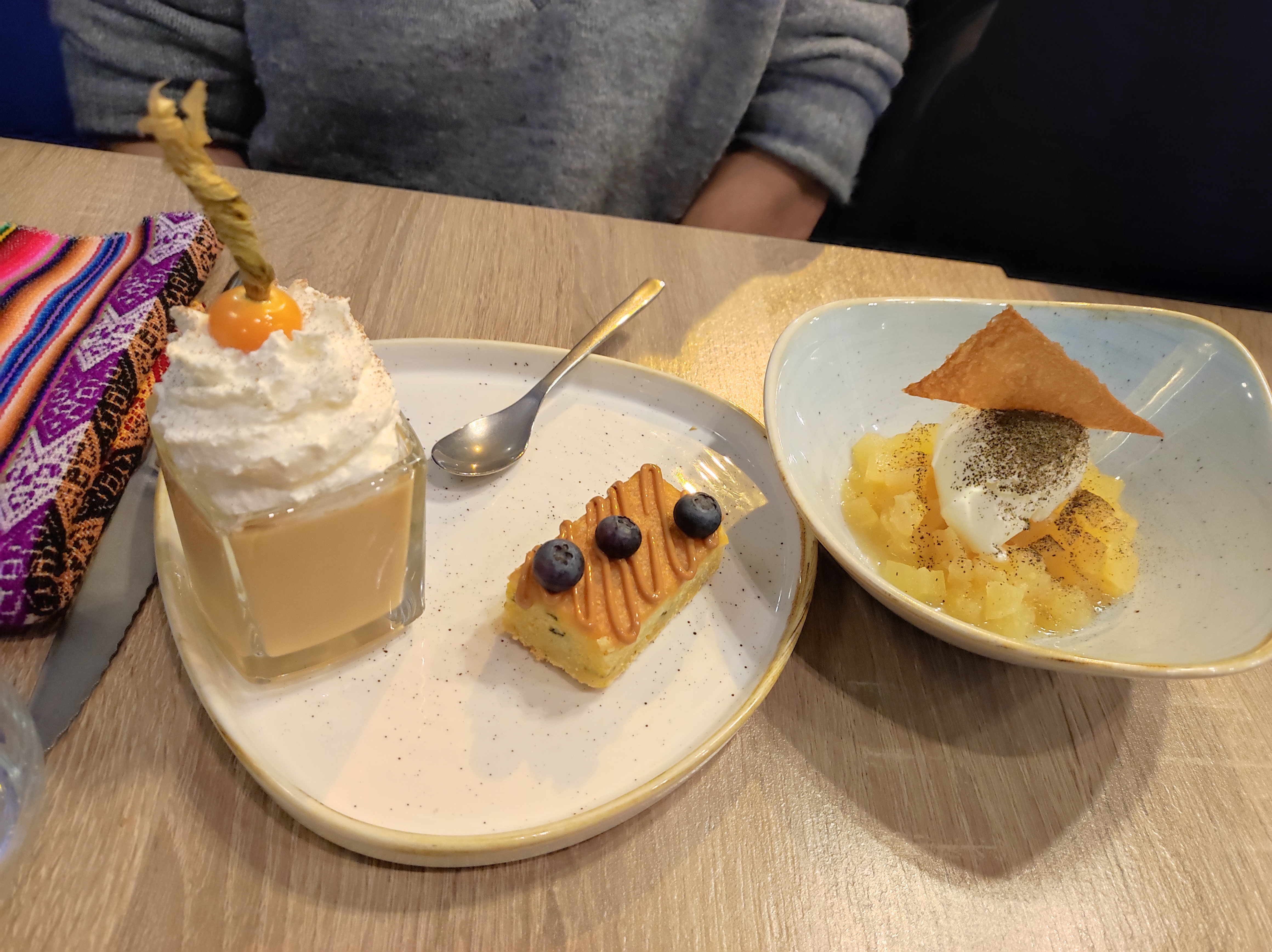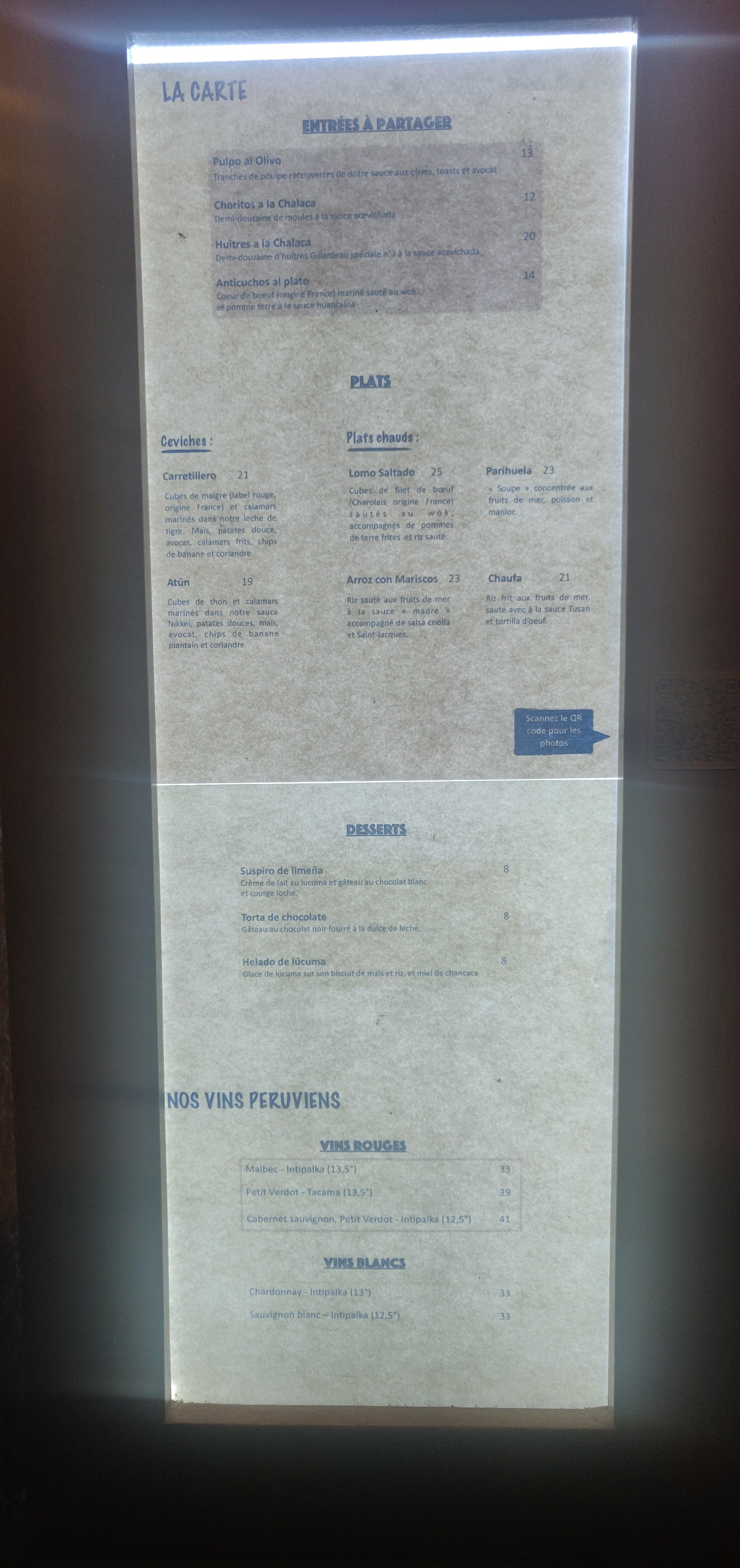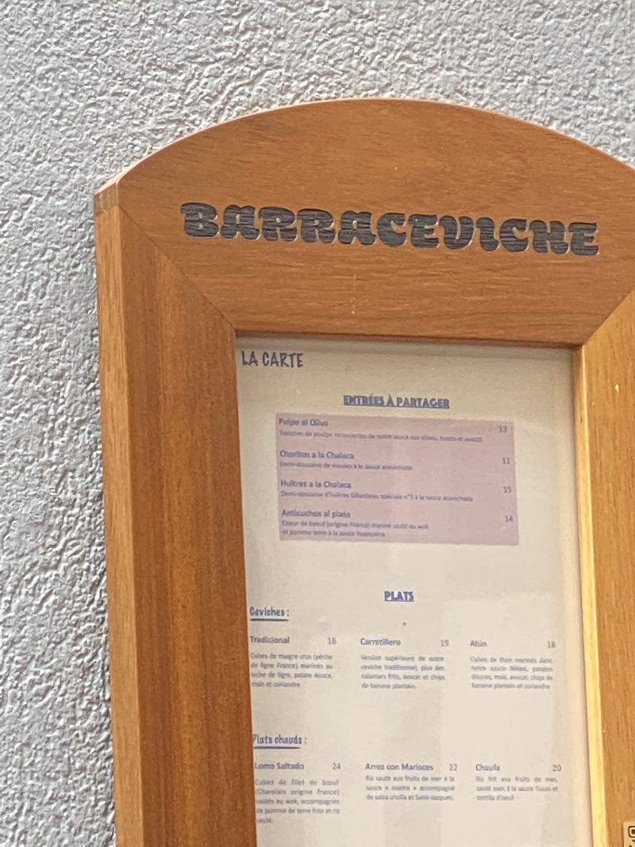 J'hésitais entre 3 et 4 étoiles. Points positifs : Apéritif servi rapidement, serveuse très attentive et rapide. Bonne présentation des plats, beau service. Serveuse aimable. Plats frais, maisons, bien assaisonnés. En tant que français, j'ai trouvé le ceviche très bon, ma femme péruvienne un peu moins. Prend la carte restaurant. Points négatifs : Améliorer la communication sur les réseaux. J'avais demandé de faire une réservation en terrasse depuis messenger et j'avais l'impression de déranger. On aurait aimé que le poisson soit légèrement plus cuit dans le citron. Le prix. La crème de lait au lucuma est trop sucrée.
