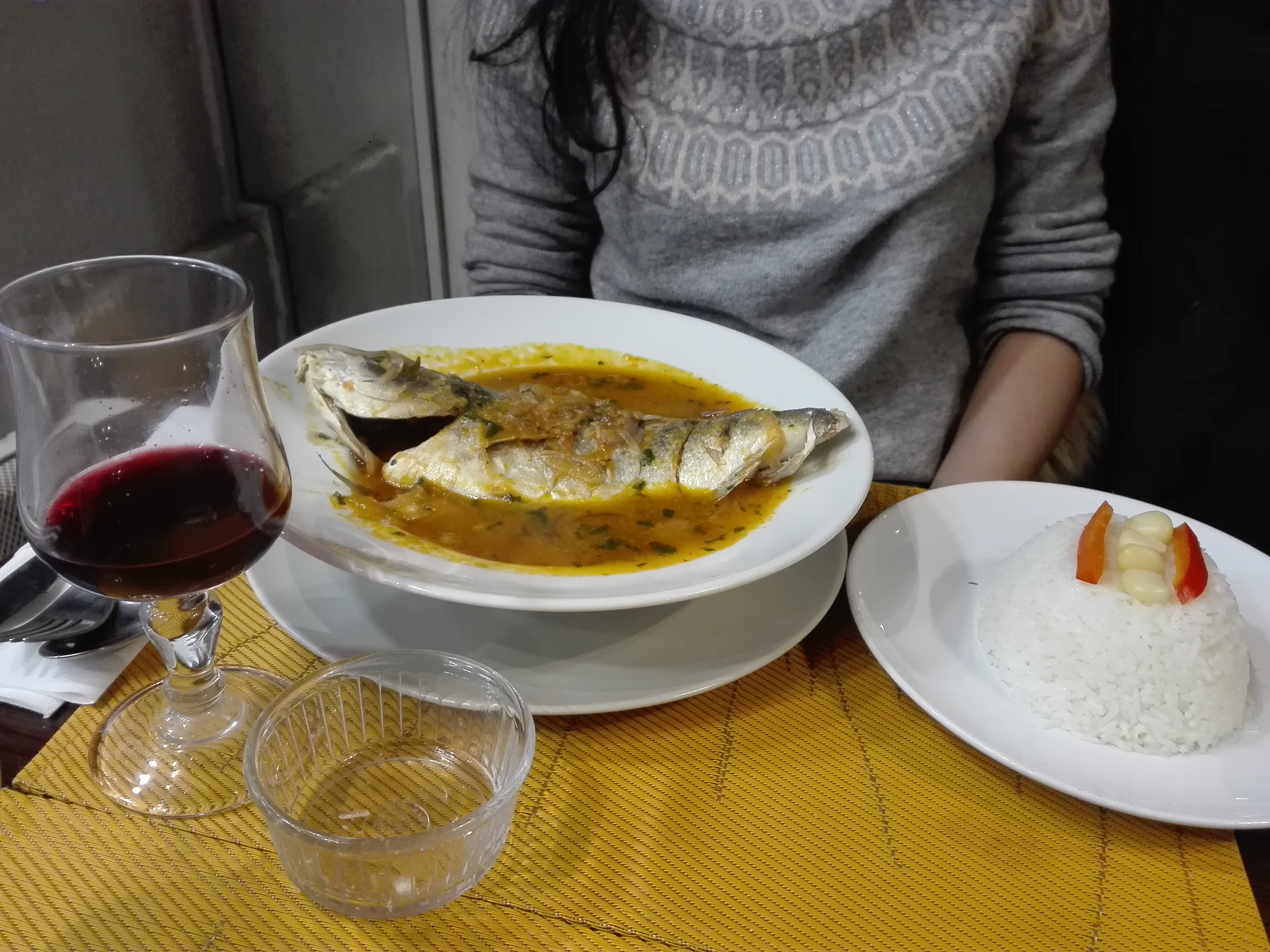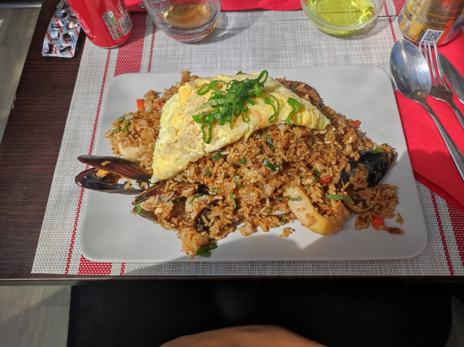 Tres bien ! Personnel tres sympa et accueillant. En entree des cacahuètes offertes. J'ai pris une boissons a base de maïs violet. C'était bon. Comme plat j'ai pris un bon plat fait de riz avec un mélange de fruits de mer (moules, crevettes, poulpes, calamar,...) le tout avec de la sauce soja. Par dessus une omelette (Chaufa de mariscos). Quant à mon amie, elle a pris une très bonne dorade grillée avec une excellente salade et de tres bonnes frites de manioc (Dorada frita). En dessert, nous en avons pris deux à base de maïs violet uniquement et un autre mélangé avec du riz au lait. Par dessus de la cannelle. C'était très bon mais à prendre en petite quantité. Désolé jai oublié quelques noms. En tout cas je recommande.