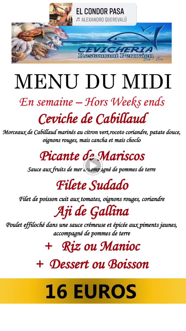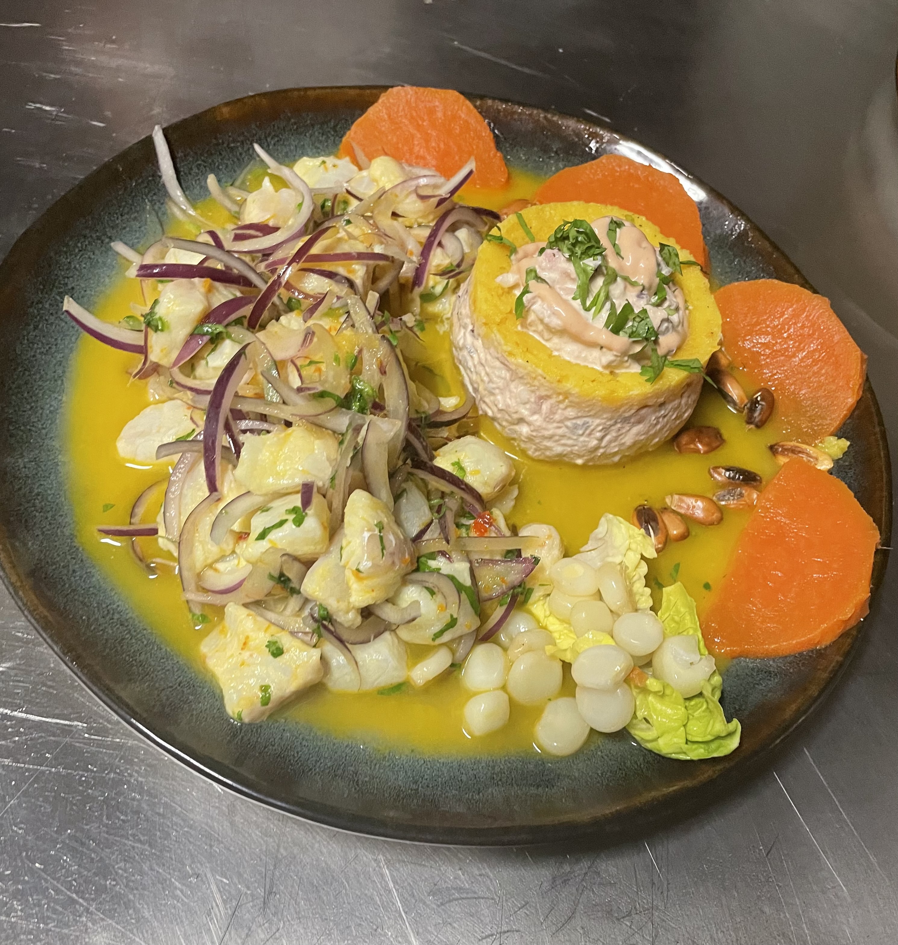 Très bon ceviche! 🐟 Le restaurant propose des spécialités péruviennes délicieuses La plupart des plats propose sont à base de poisson ou de fruits de mer Nous avons pris une formule du midi à 16€ pour un plat, un accompagnement et un dessert La serveuse est adorable et professionnelle
