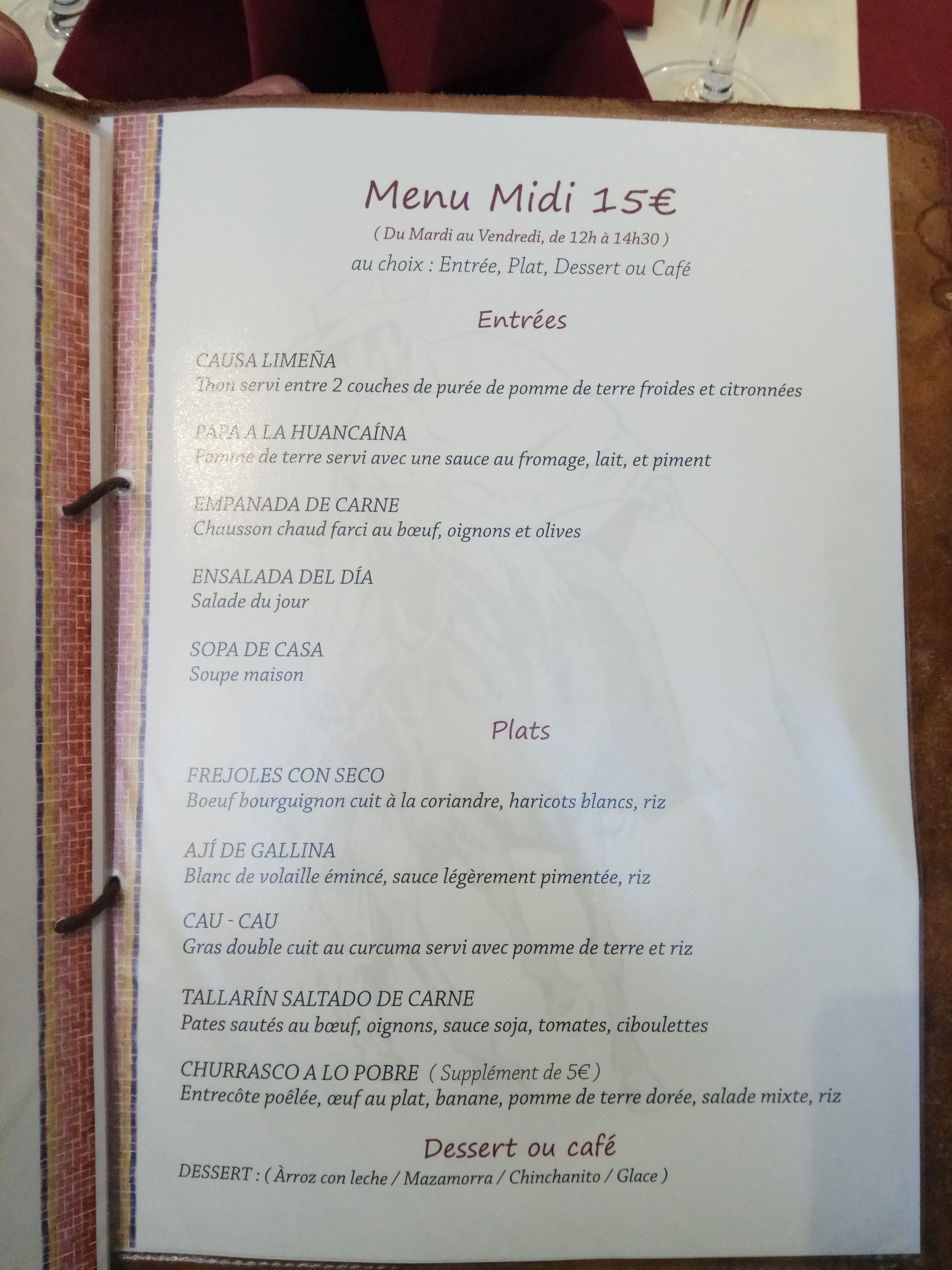 Menu de midi pas cher et copieux, plat bien présentés et la vielle musique pop latina, un petit voyage au Pérou