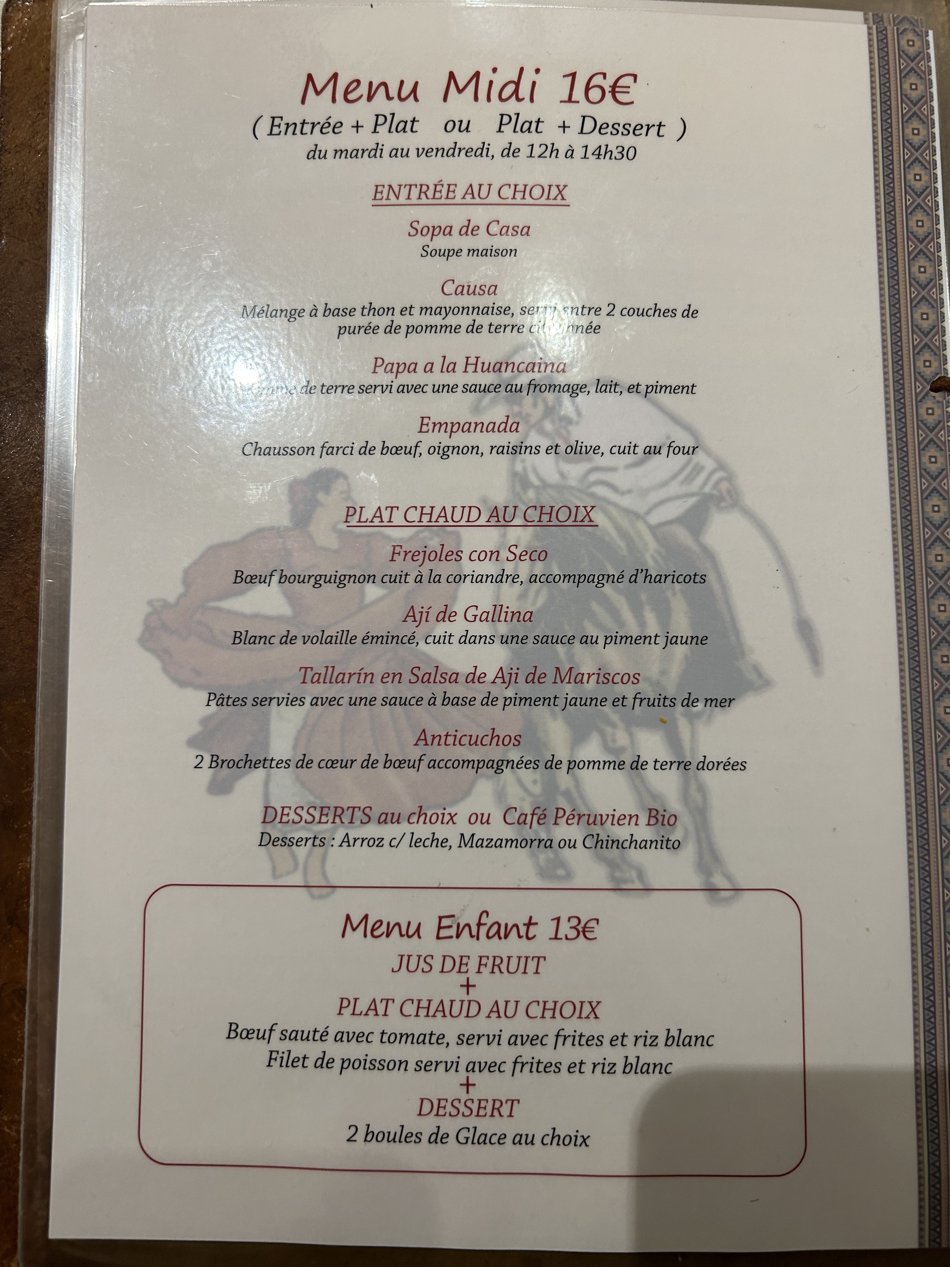 Deçu moi qui me voyait manger dans un bon restaurant Peruvien suivant les avis google qui avait l air positif. Je soupçonne un changement récent en cuisine car j ai mangé le pire aji de gallina et anticucho de mi vida. On aurait dit que l anticucho etait du foie en lieu du traditionnel coeur de boeuf mariné et que la sauce de mon aji de gallina était faite de crème fraiche + curry (aucun gout d aji amarillo) je suis adepte de la cuisine peruvienne et la j ai vraiment été déçu, le lomo du menu enfznt en l'occurrence était délicieux, perzonnel agréable mais il existe de meilleurs adresses sur Paris