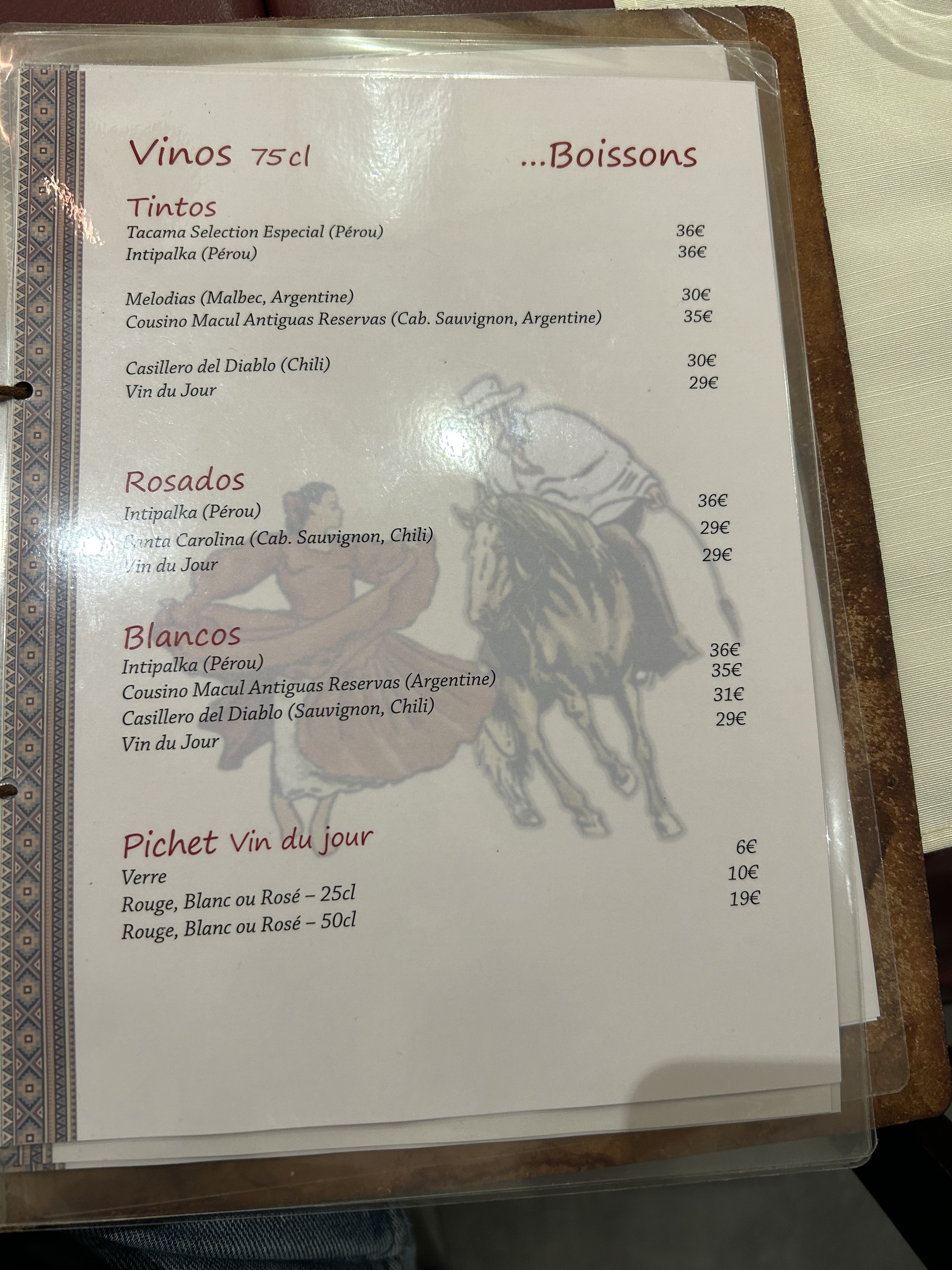 Nous sommes allés à 4 le 17 avril 2019. On a pris le menu à 26€ (E+P+D) tout est vraiment délicieux. J'ai fait plusieurs restaurants péruviens à Paris mais c'est le seul où l'on met pas 1 kilo de sel dans chaque assiette, ici tout est très très bon.