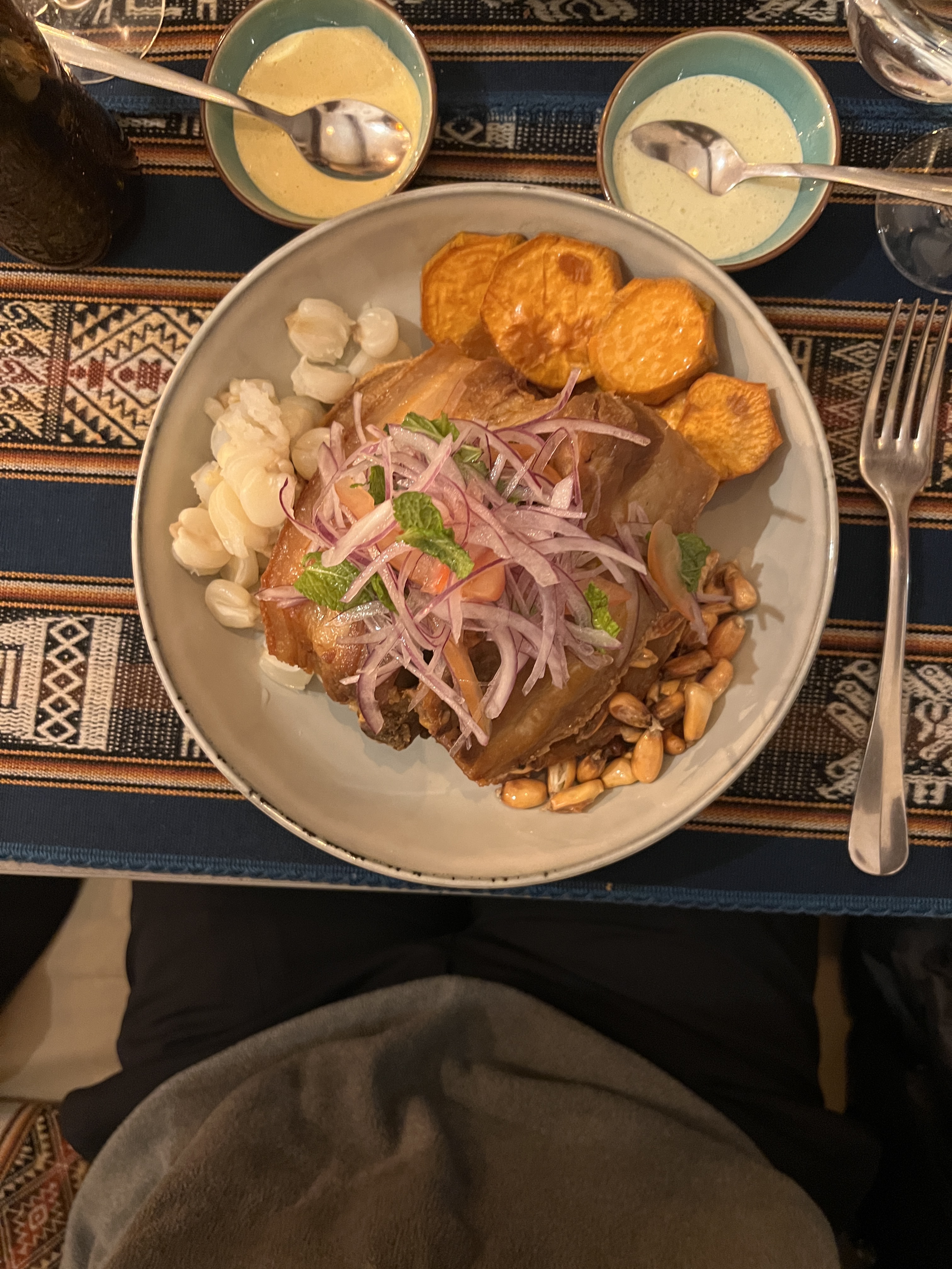 Les craquelins de porc contenaient plus de gras que de viande, en morceaux trop gros. La crème huancaina était bonne, mais pas parfaite, manquant d'une touche de piquant. Le lomo saltado avec des pommes de terre était bon en assaisonnement, mais la viande n'était pas aussi molle que d'habitude.