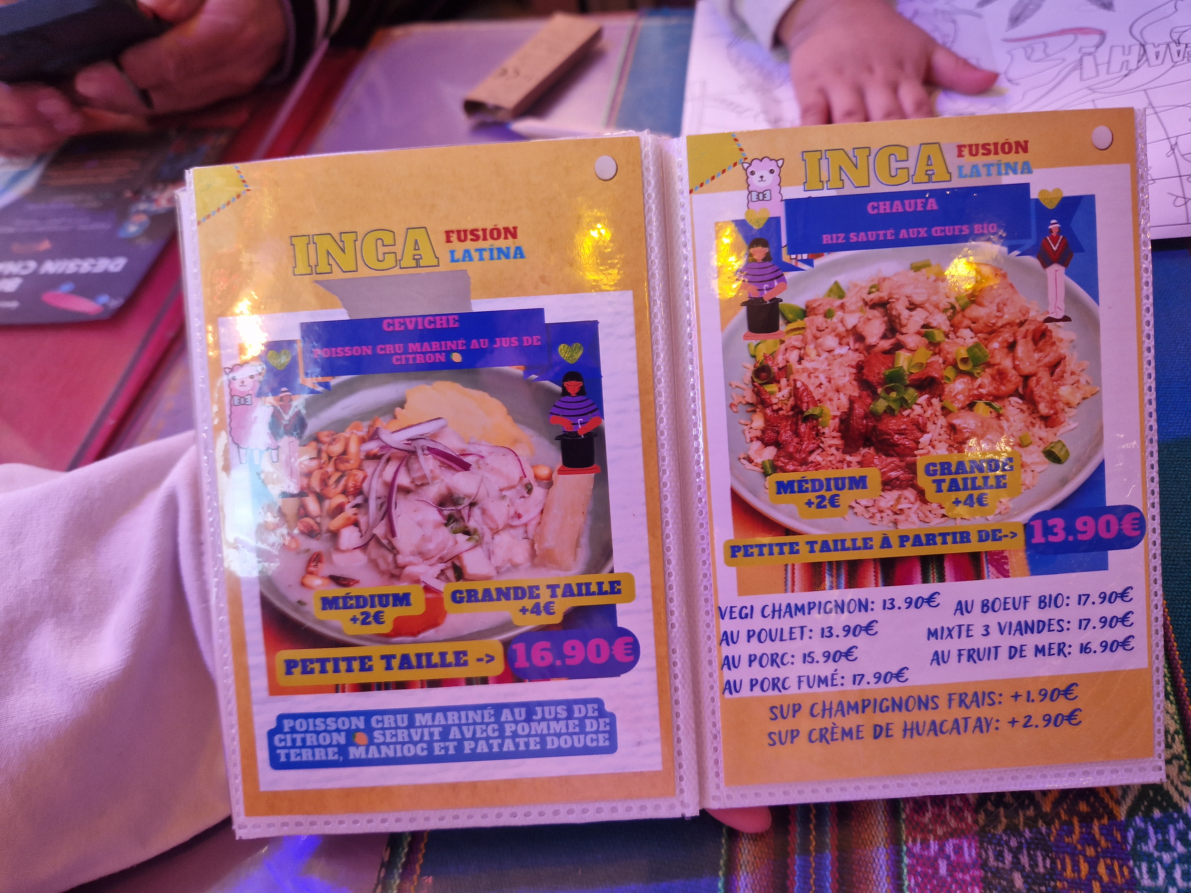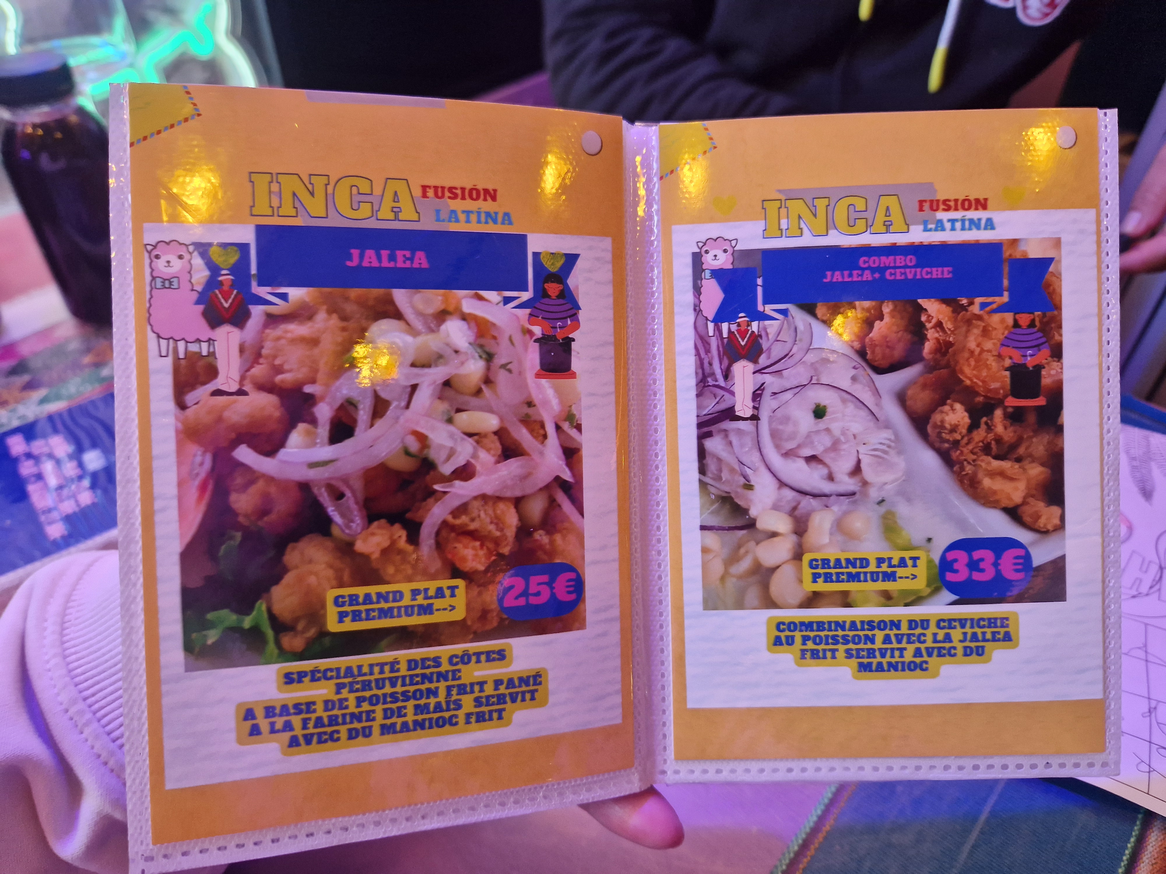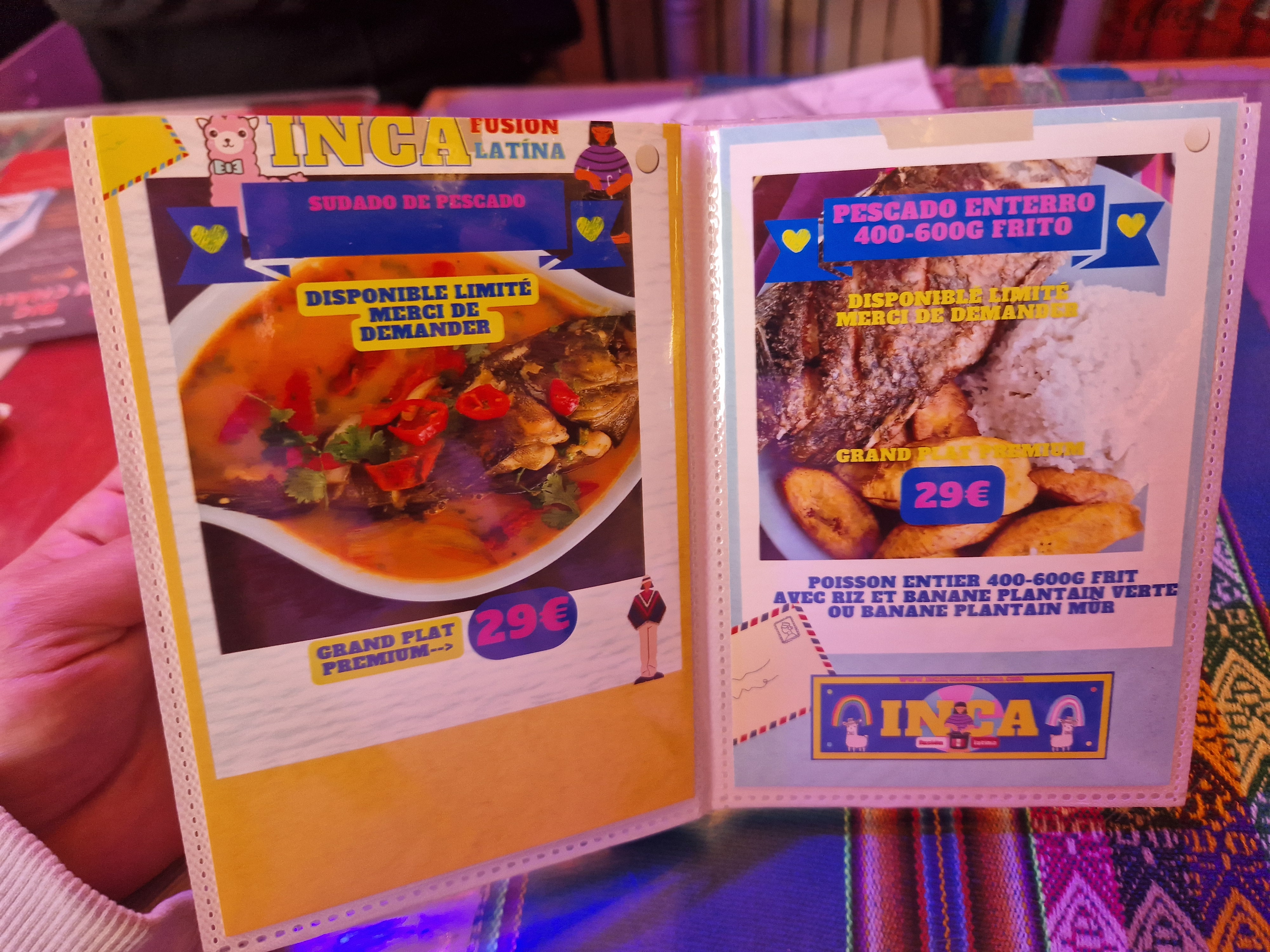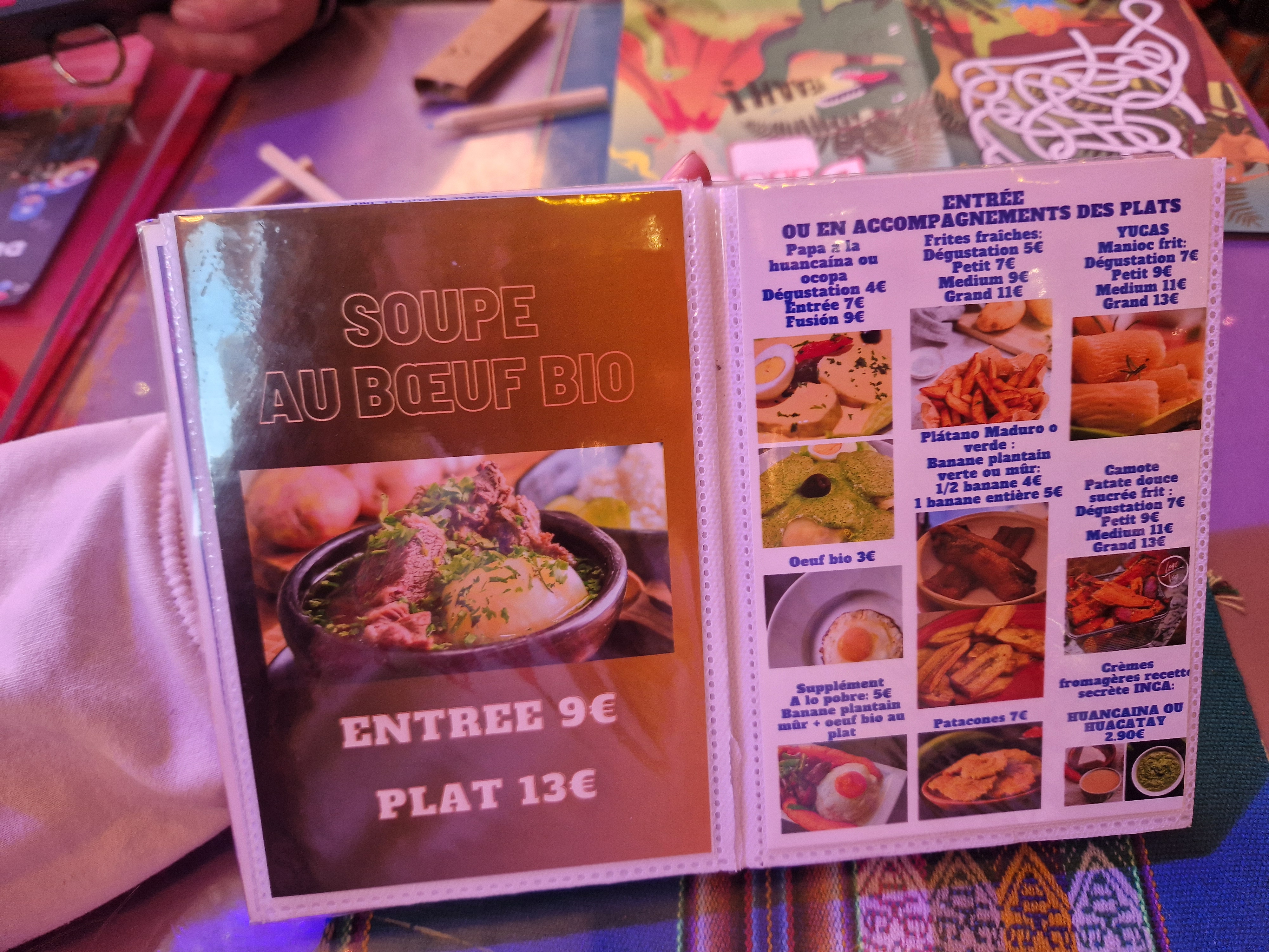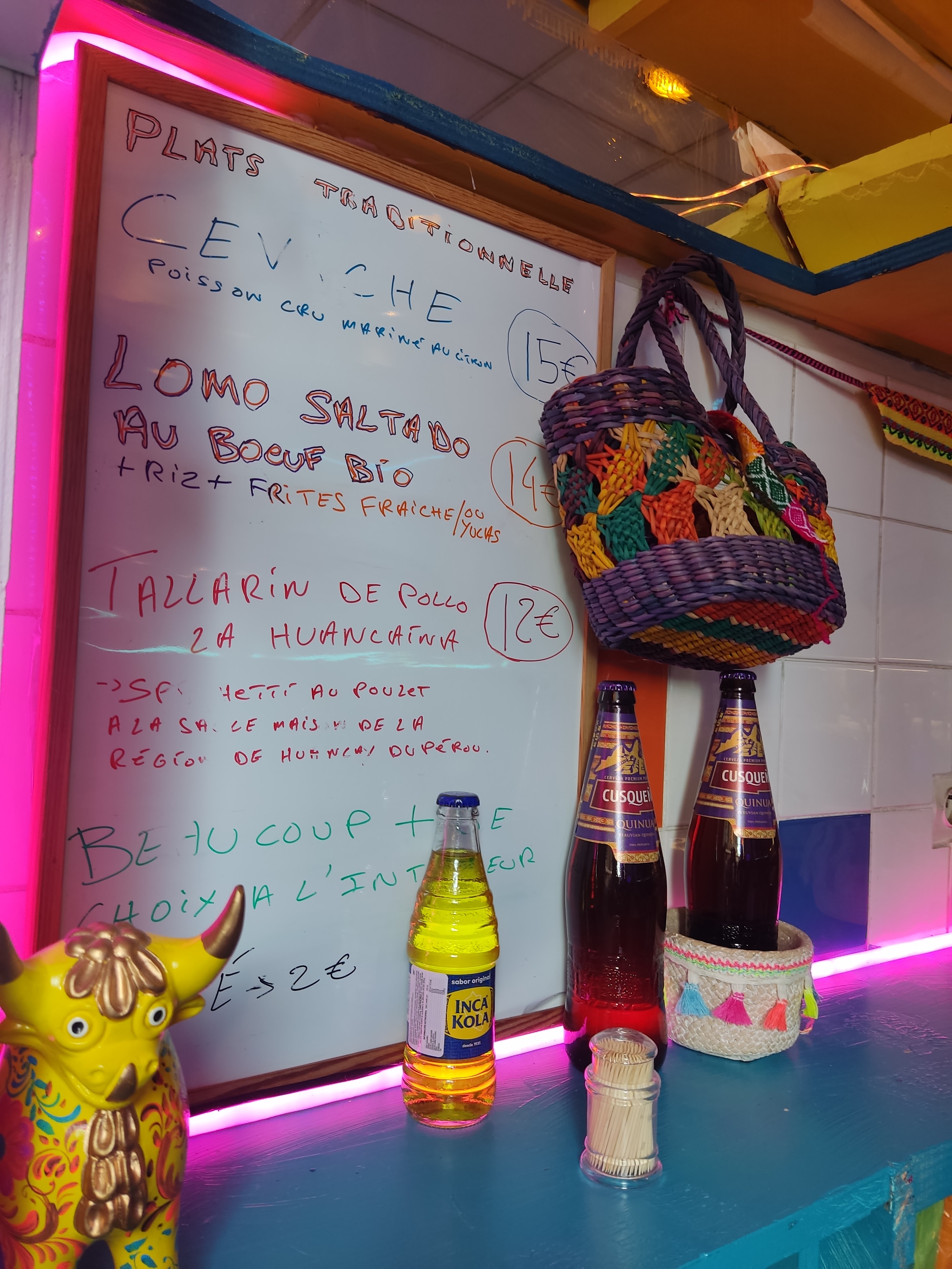 Bonsoir, Je suis actuellement sur place. Petit restaurant convivial Péruvien. Ambiance au rendez-vous. 10 places sur place à l'intérieur Peut être possible à l'extérieur Service agréable Restauration Typiquement Péruvien A tester. Différentes tailles de plats Petit / Médium/ Grand. Les entrée et plats sont énormes !!! J'ai pas testé les desserts ça j'ai plus de place. Quelques Boissons Typiques du Pérou Je reviendrai
