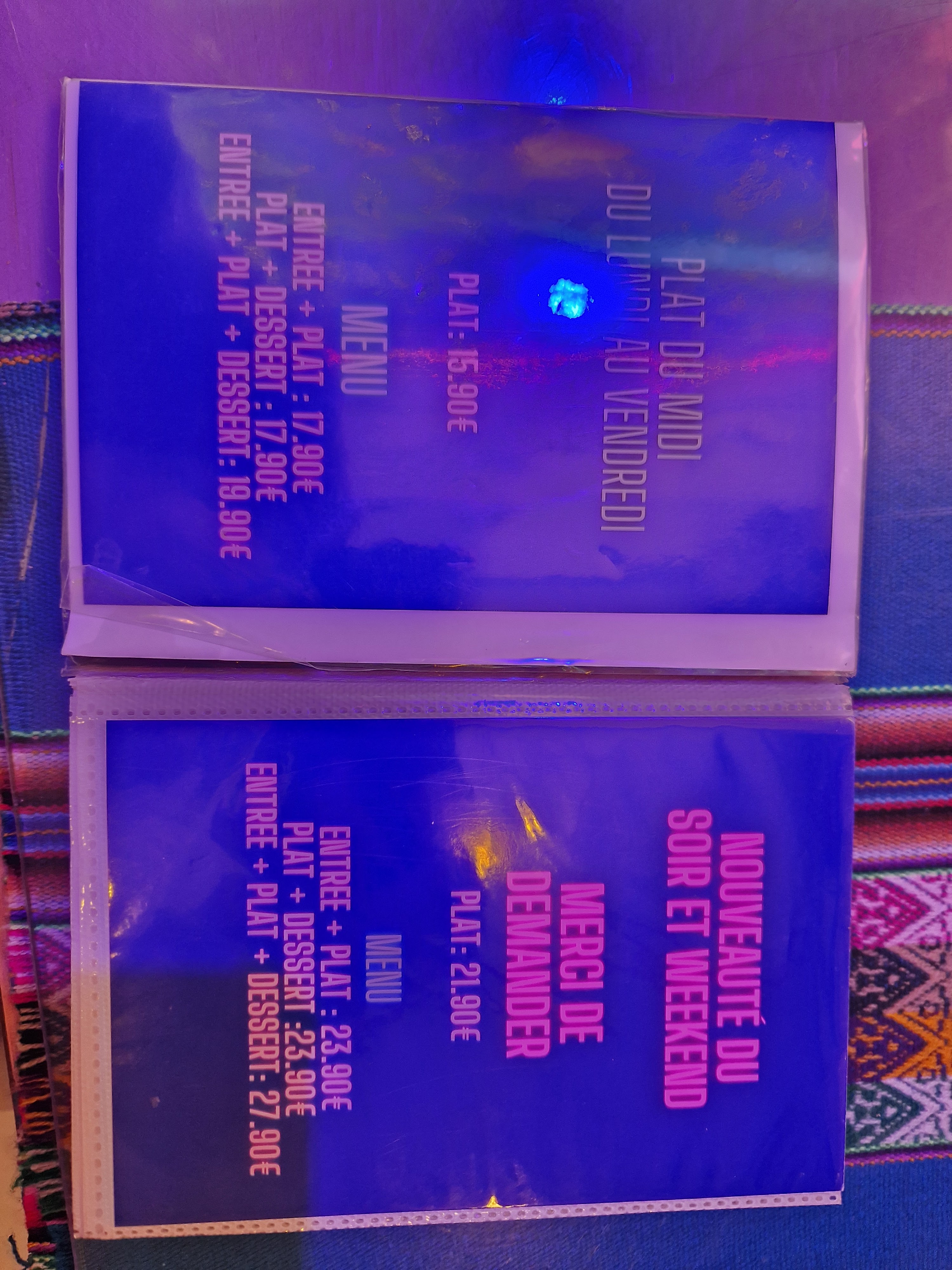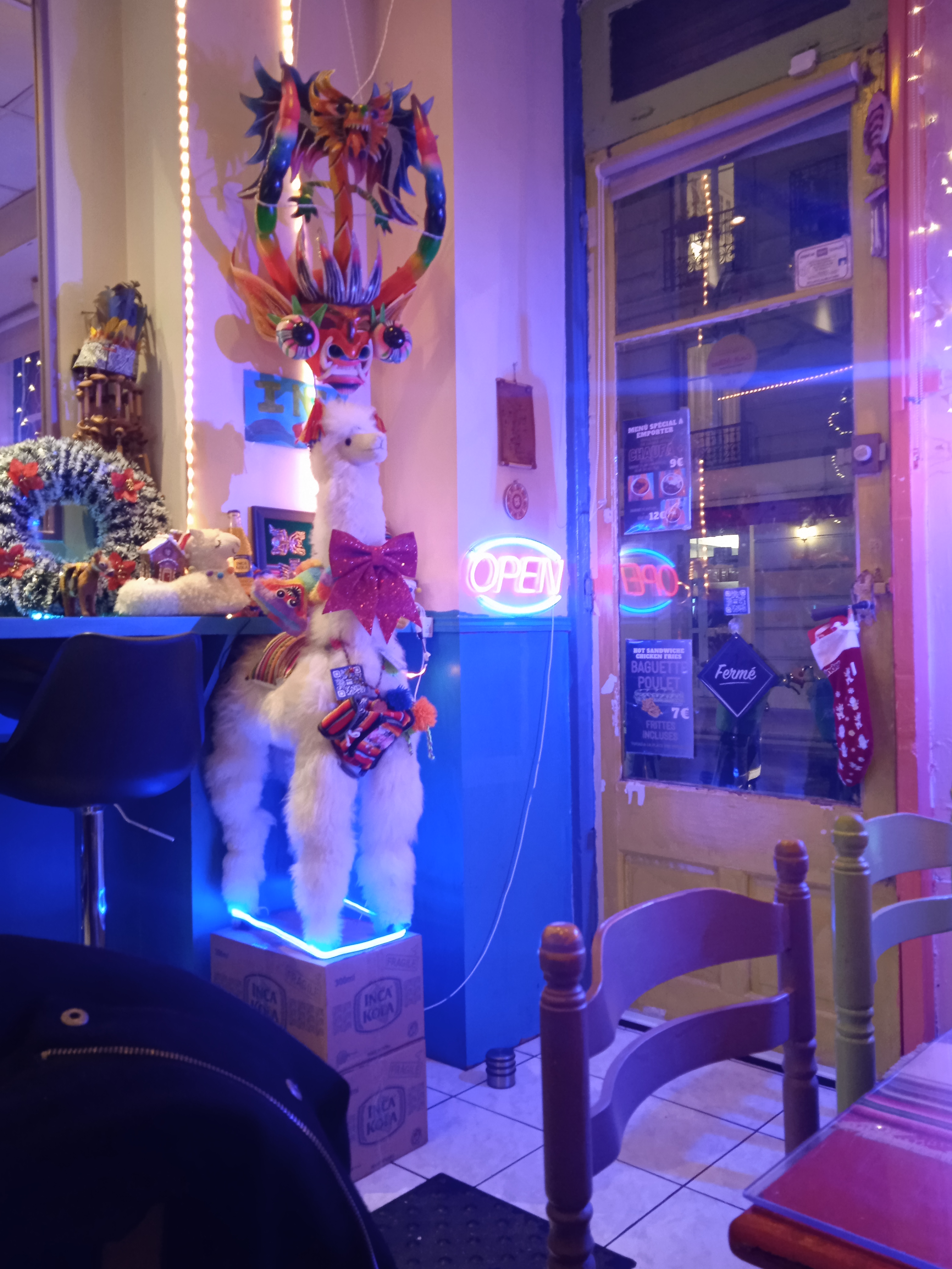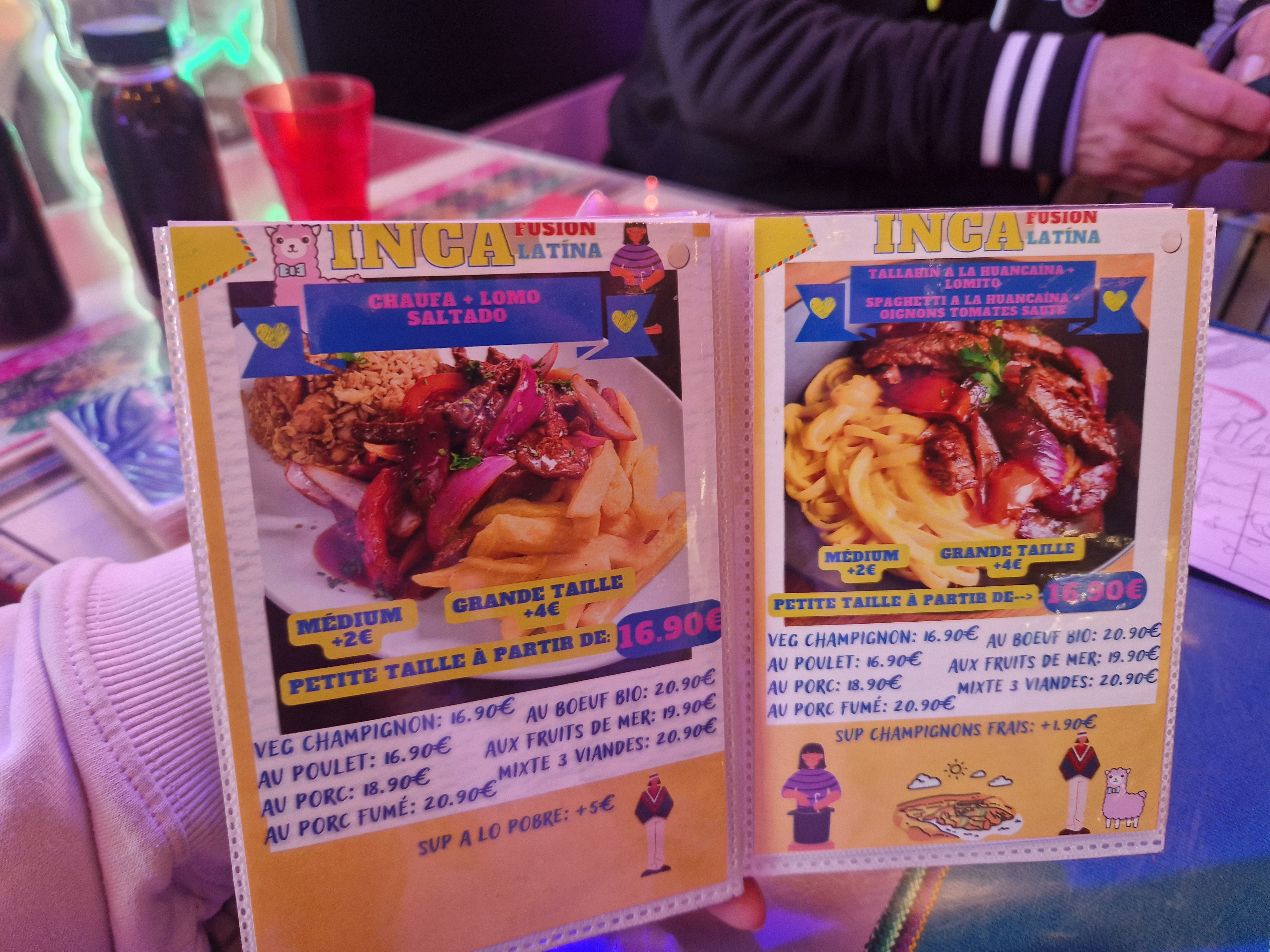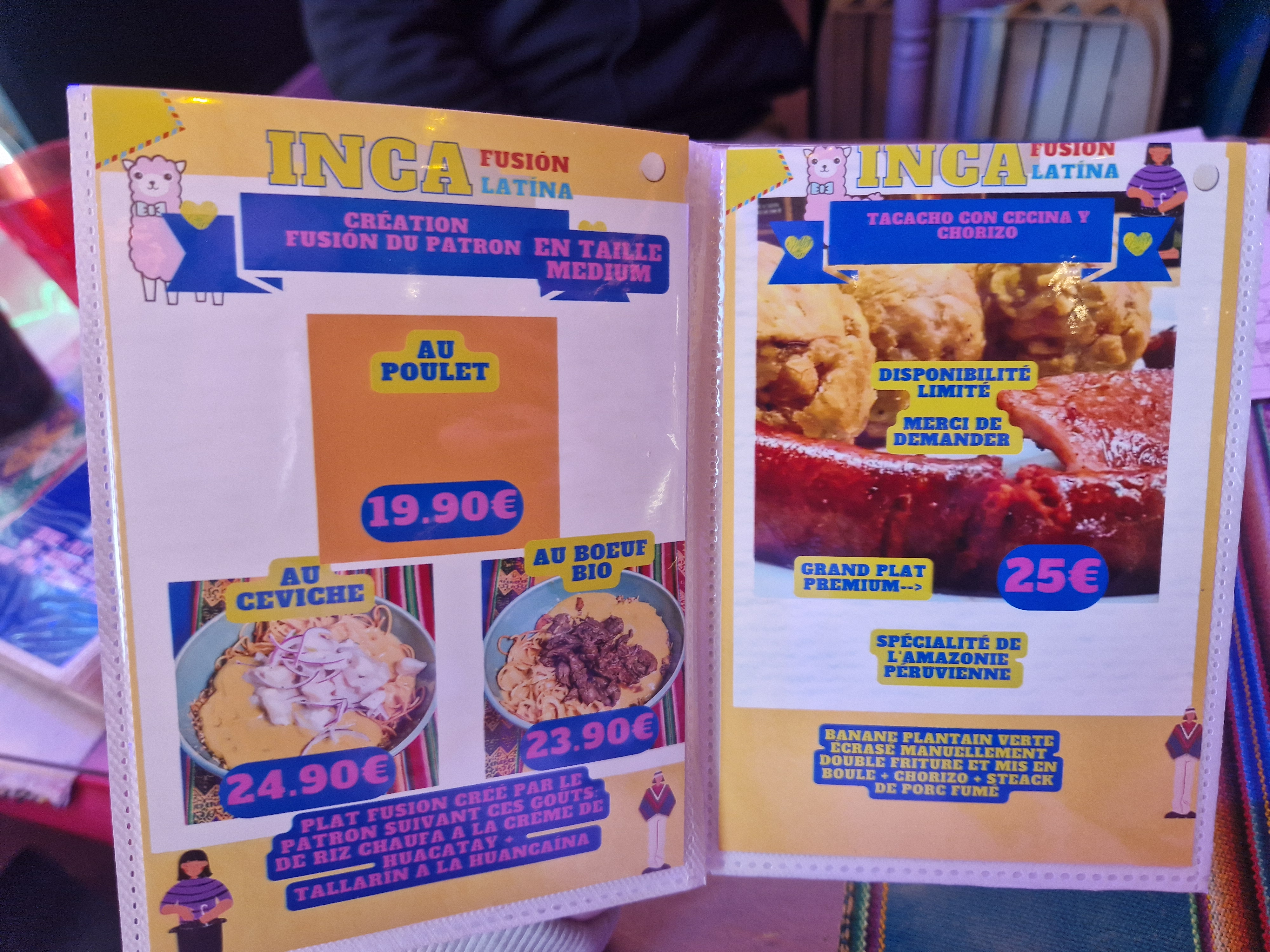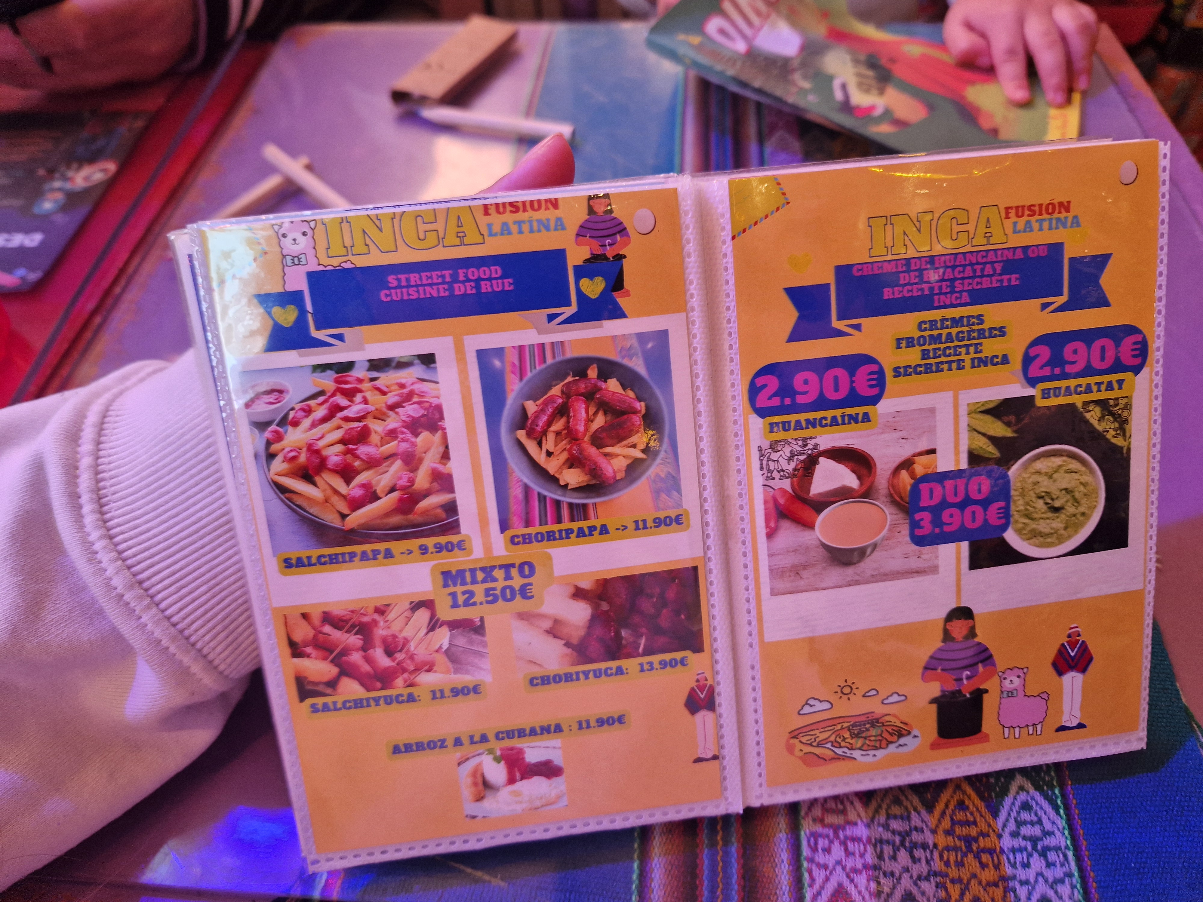 Bonsoir, Je suis actuellement sur place. Petit restaurant convivial Péruvien. Ambiance au rendez-vous. 10 places sur place à l'intérieur Peut être possible à l'extérieur Service agréable Restauration Typiquement Péruvien A tester. Différentes tailles de plats Petit / Médium/ Grand. Les entrée et plats sont énormes !!! J'ai pas testé les desserts ça j'ai plus de place. Quelques Boissons Typiques du Pérou Je reviendrai