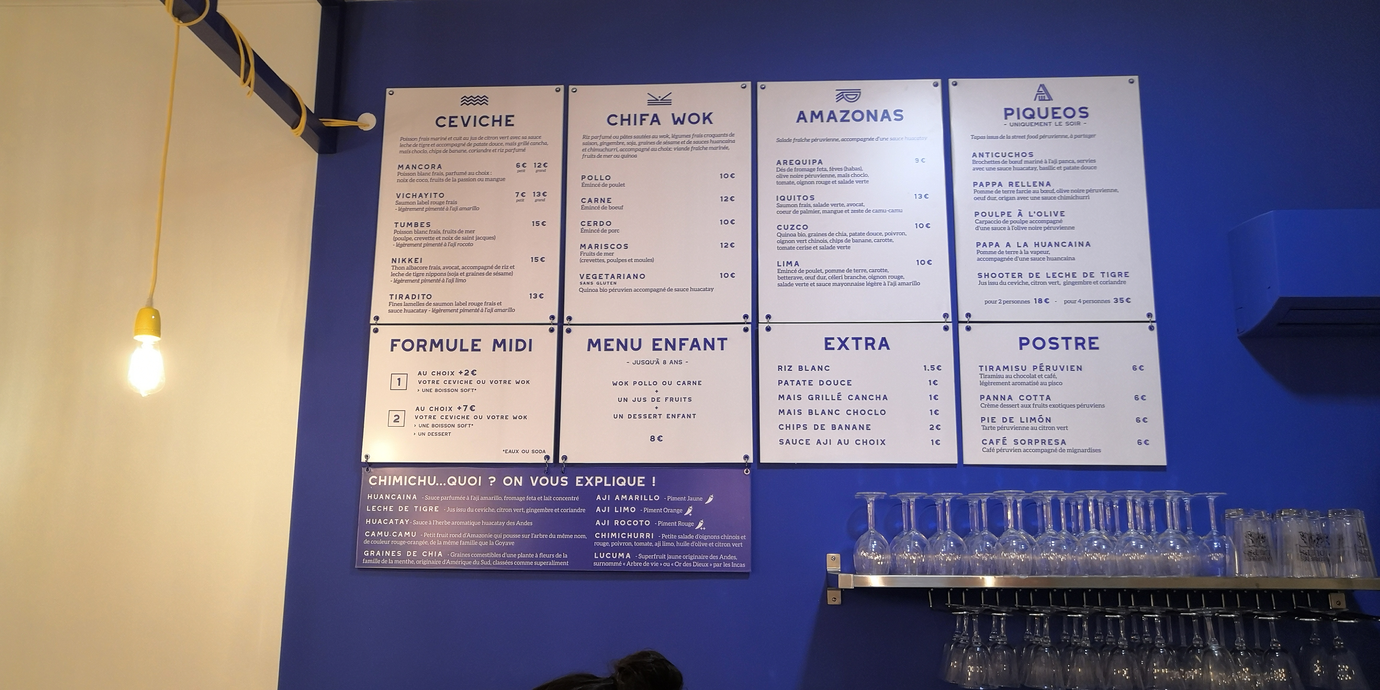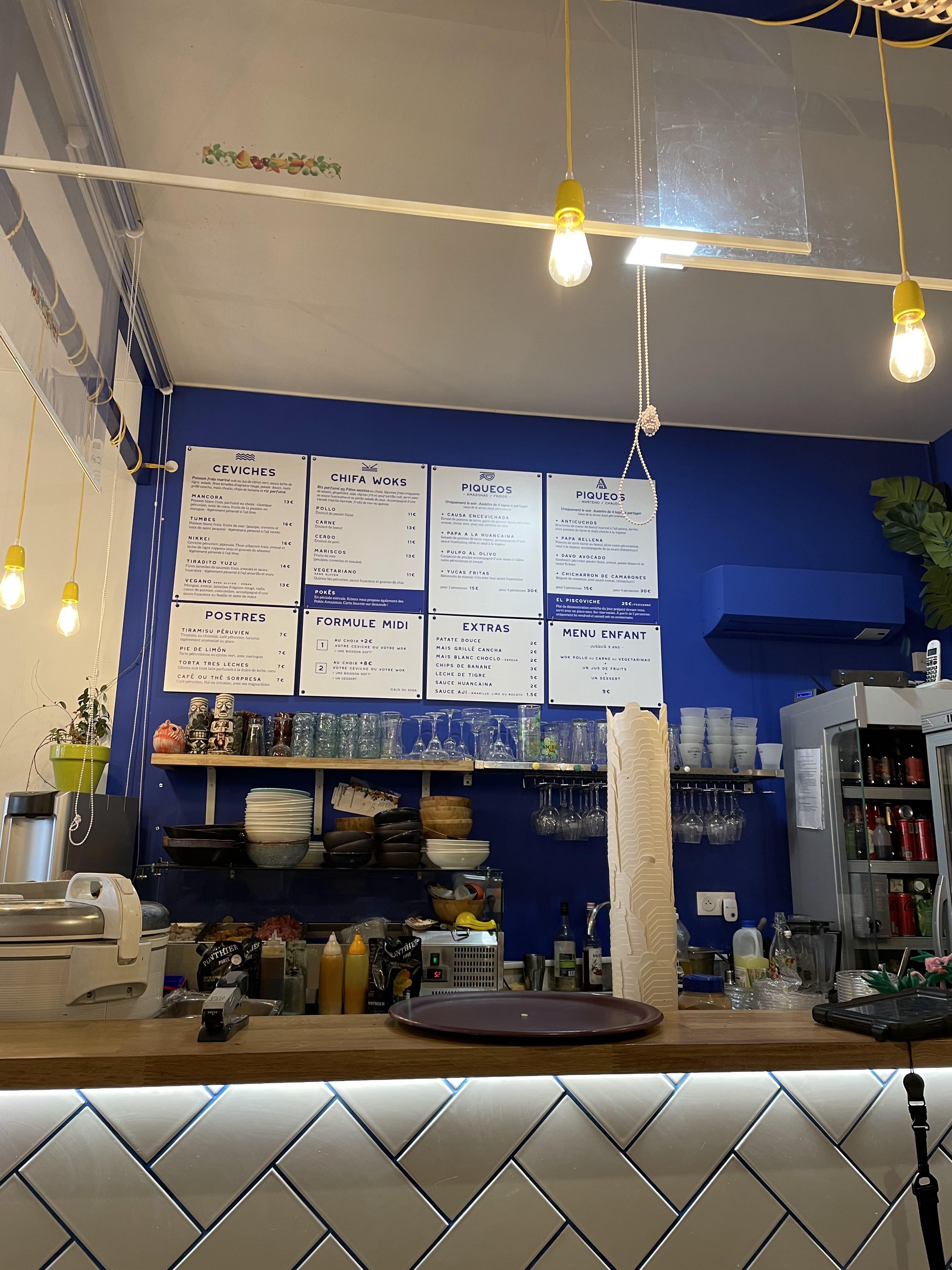 Cadre sympathique, serveurs souriants. La spécialité du restaurant est les ceviche, à base de poisson cru mariné. Si vous n’aimez pas cela, il proposent des woks délicieux, et de bons desserts. Je recommande !