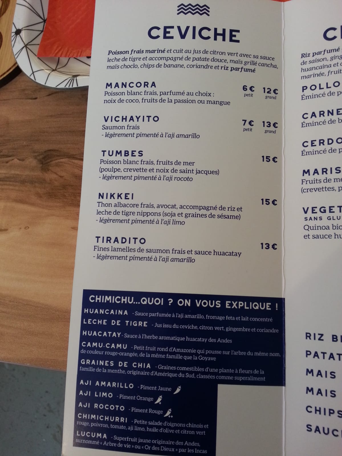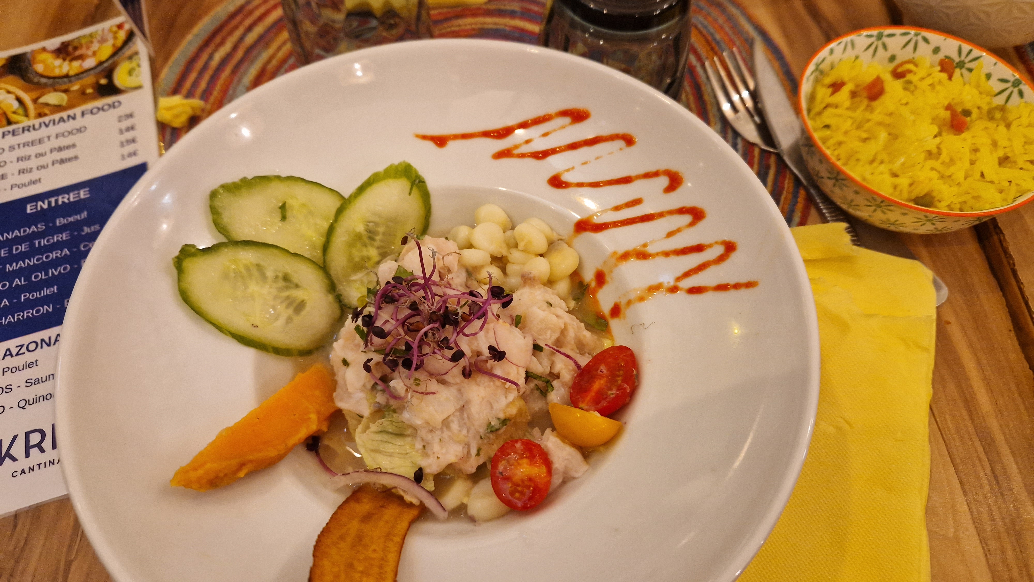 faute d etre parti cette annee en vacance. Veronica nous a fait voyager avec ses ceviches, tres bon et rafraichissant pour la saison! accueil chaleureux, ambiance peruvienne garantie et tres bon rapport qualité prix. on reviendra pour gouter le reste des plats😉