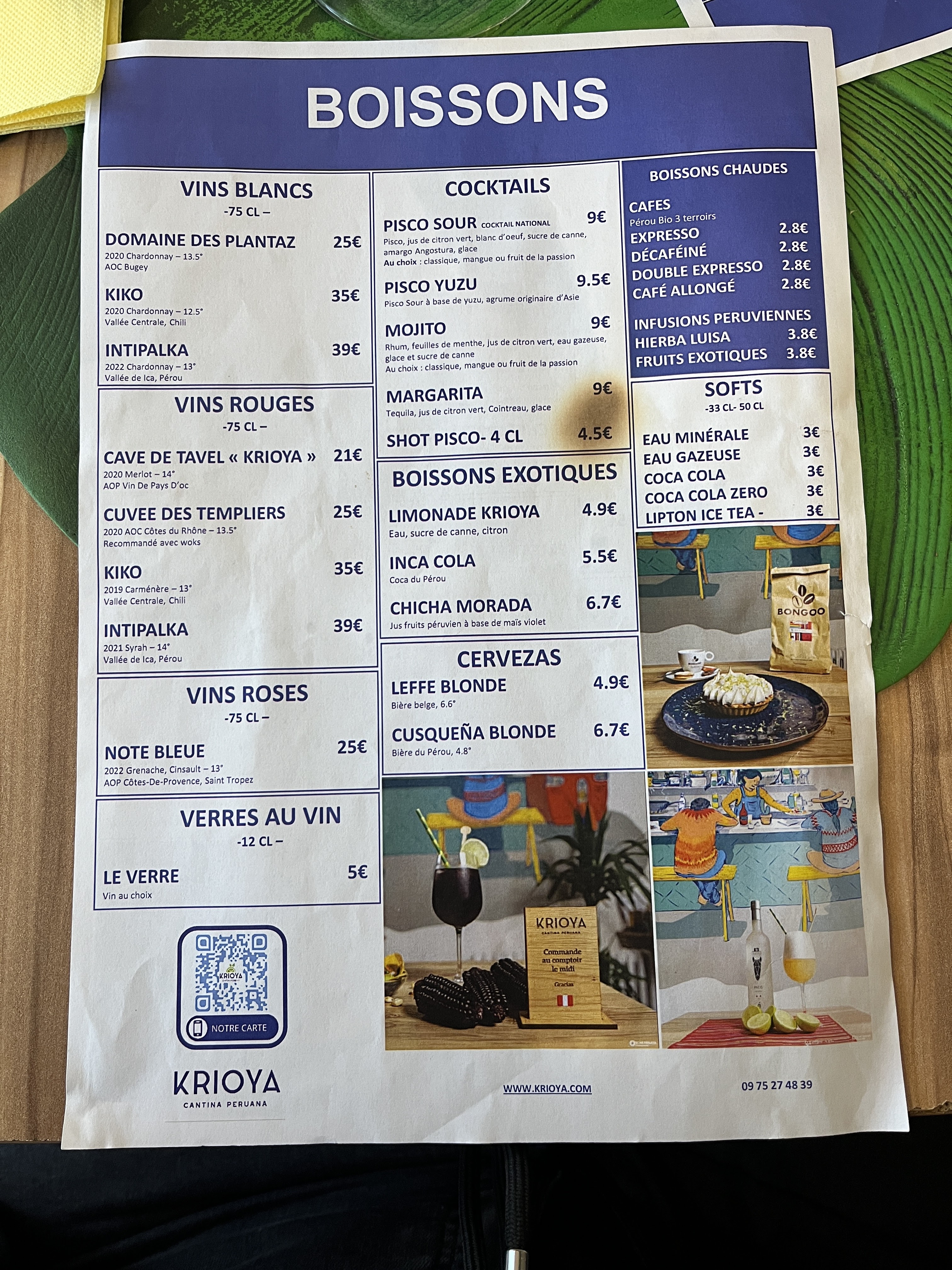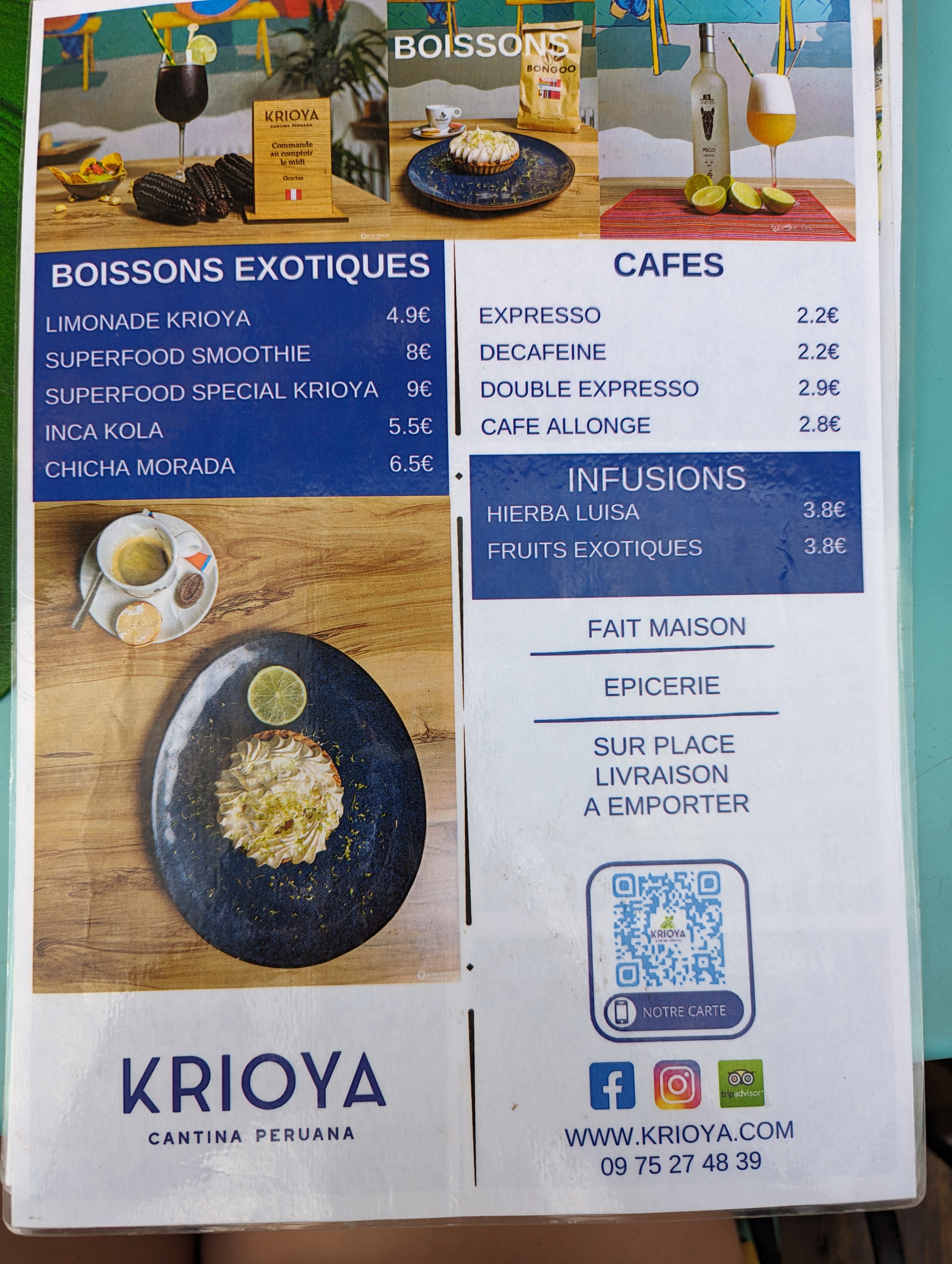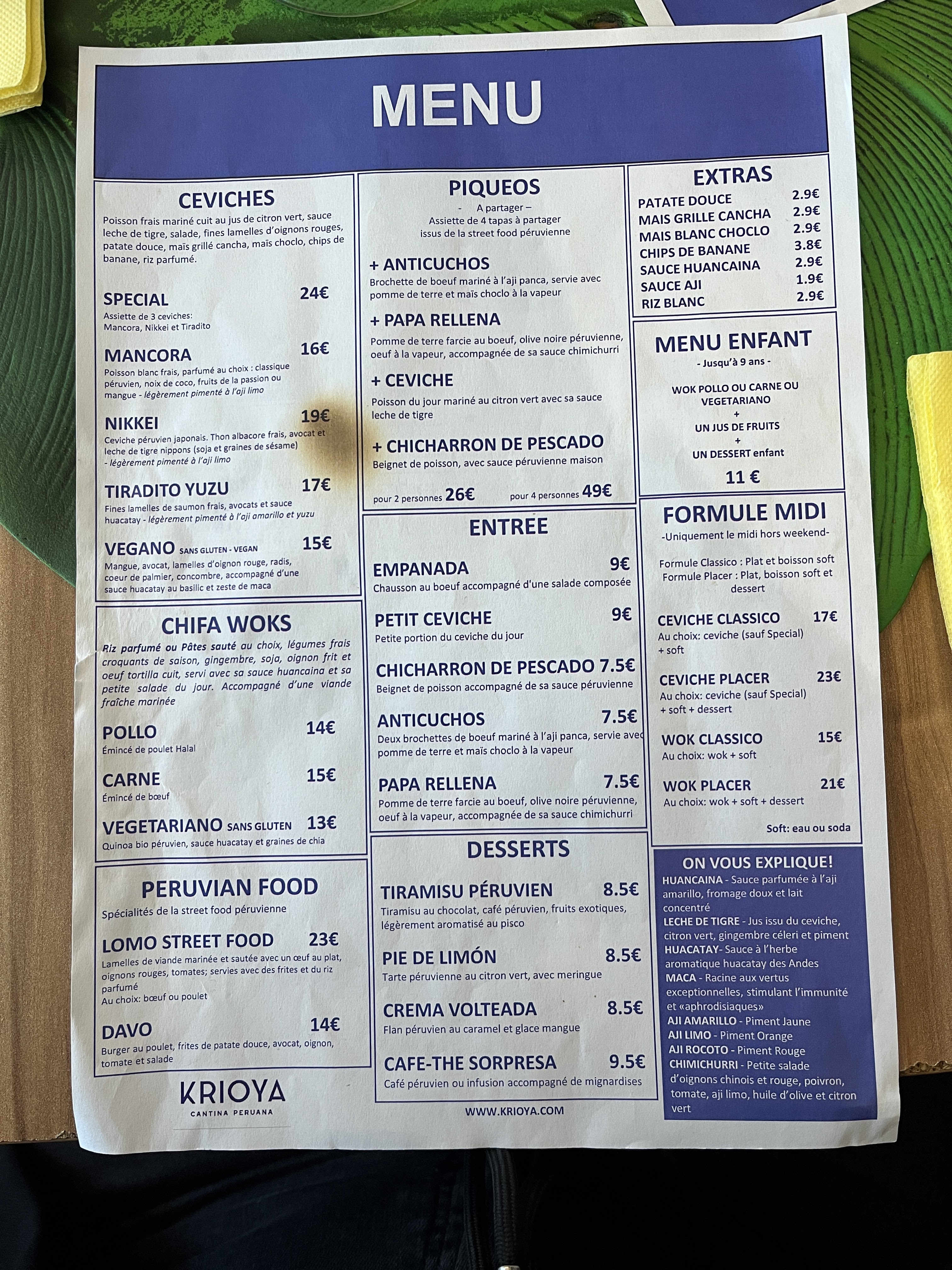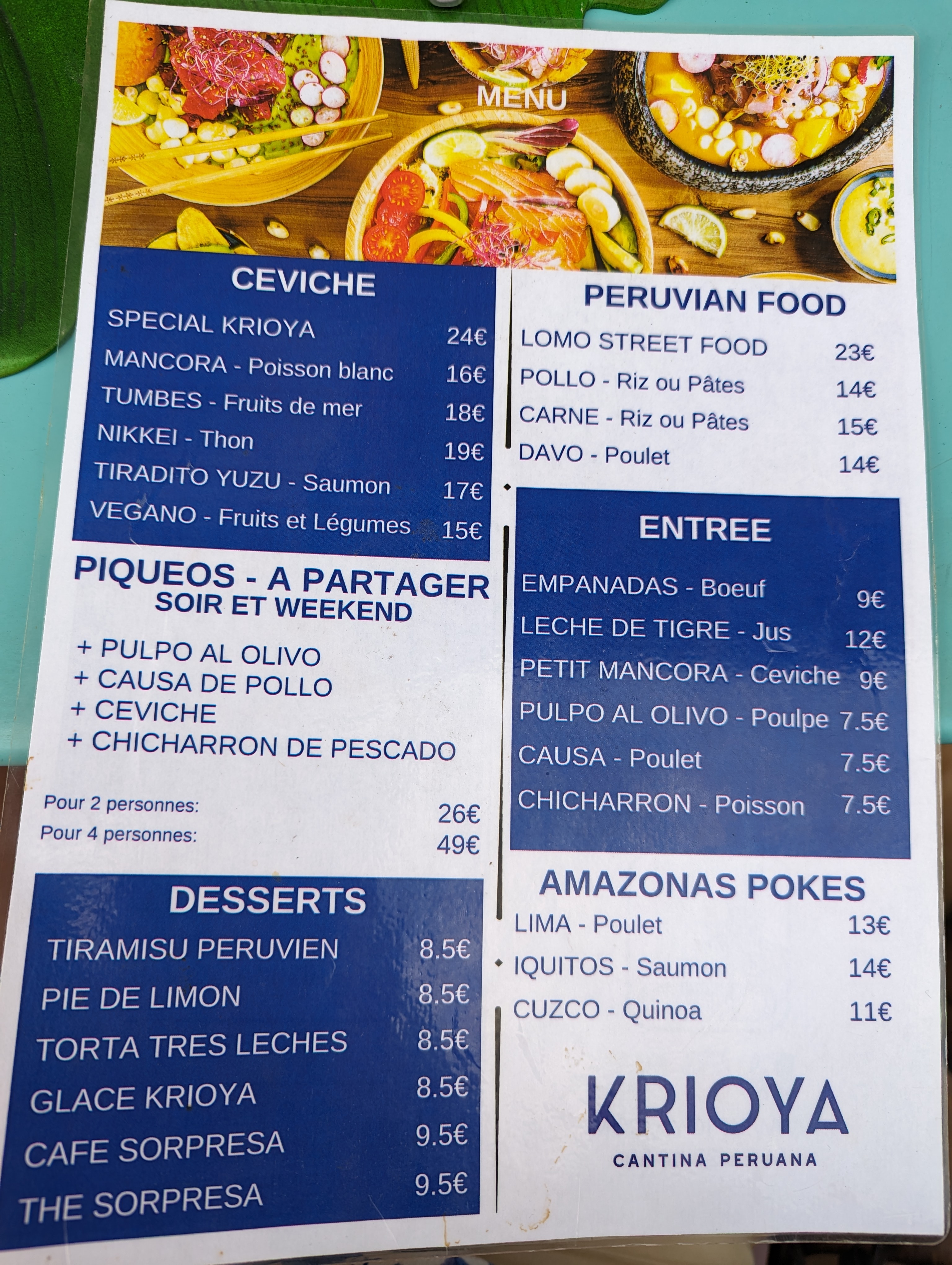 GROS COUP DE ♥️ ! Krioya Sert une cuisine fraîche et savoureuse, avec une équipe très sympa. Le ceviche est un poisson cuit au jus de citron ; à la carte aussi : des pâtes à la mode péruvienne délicieuses également.