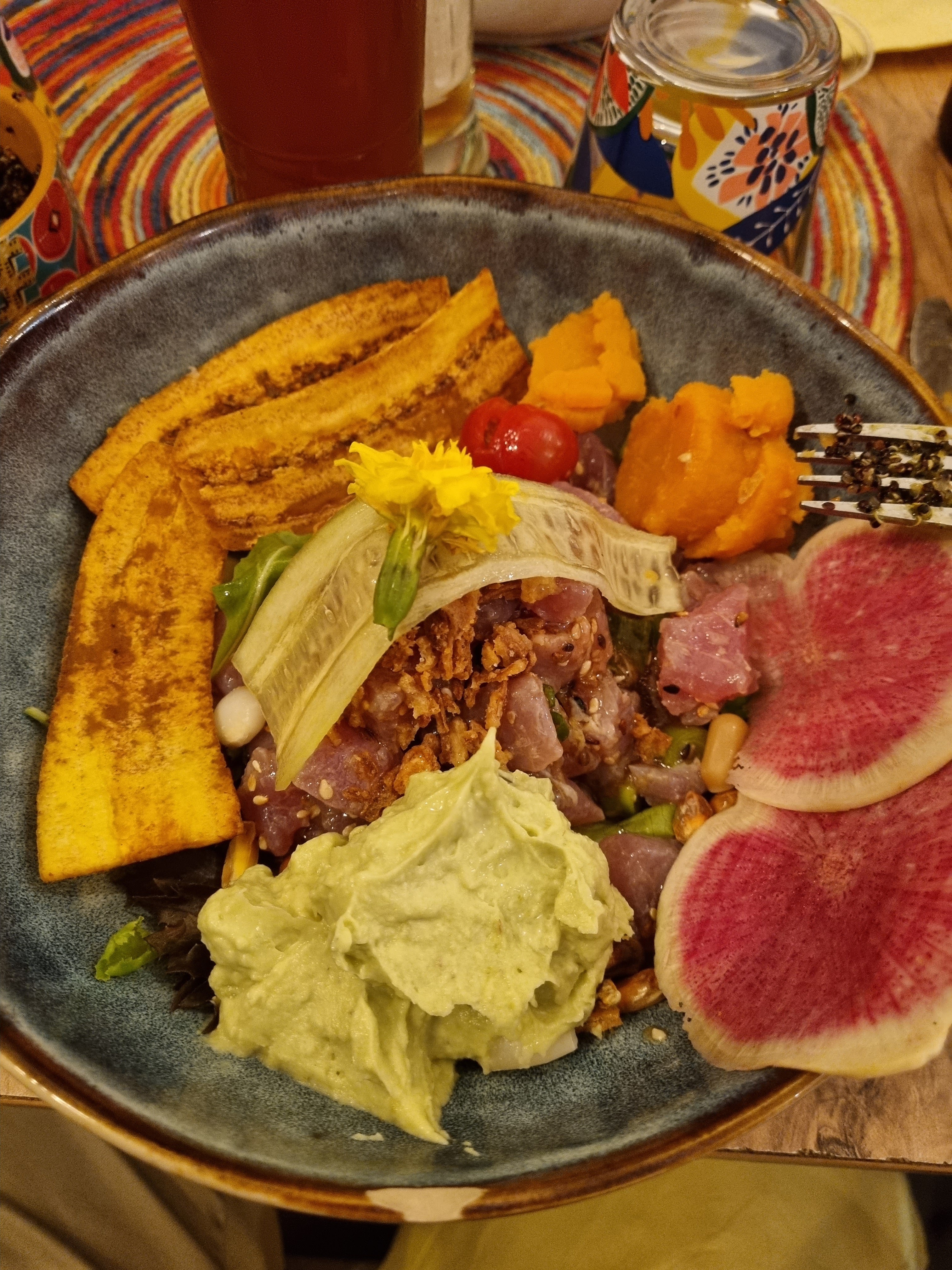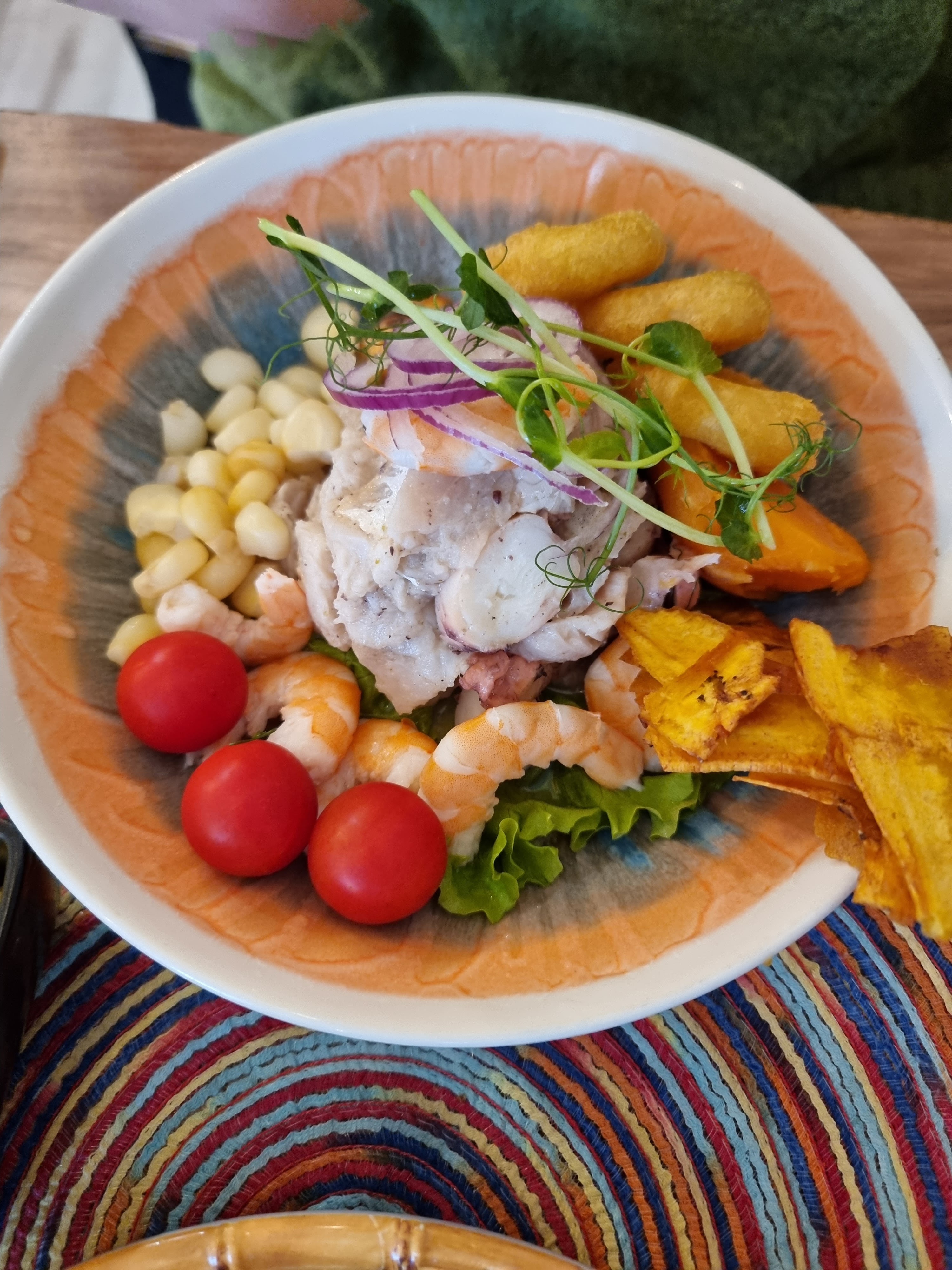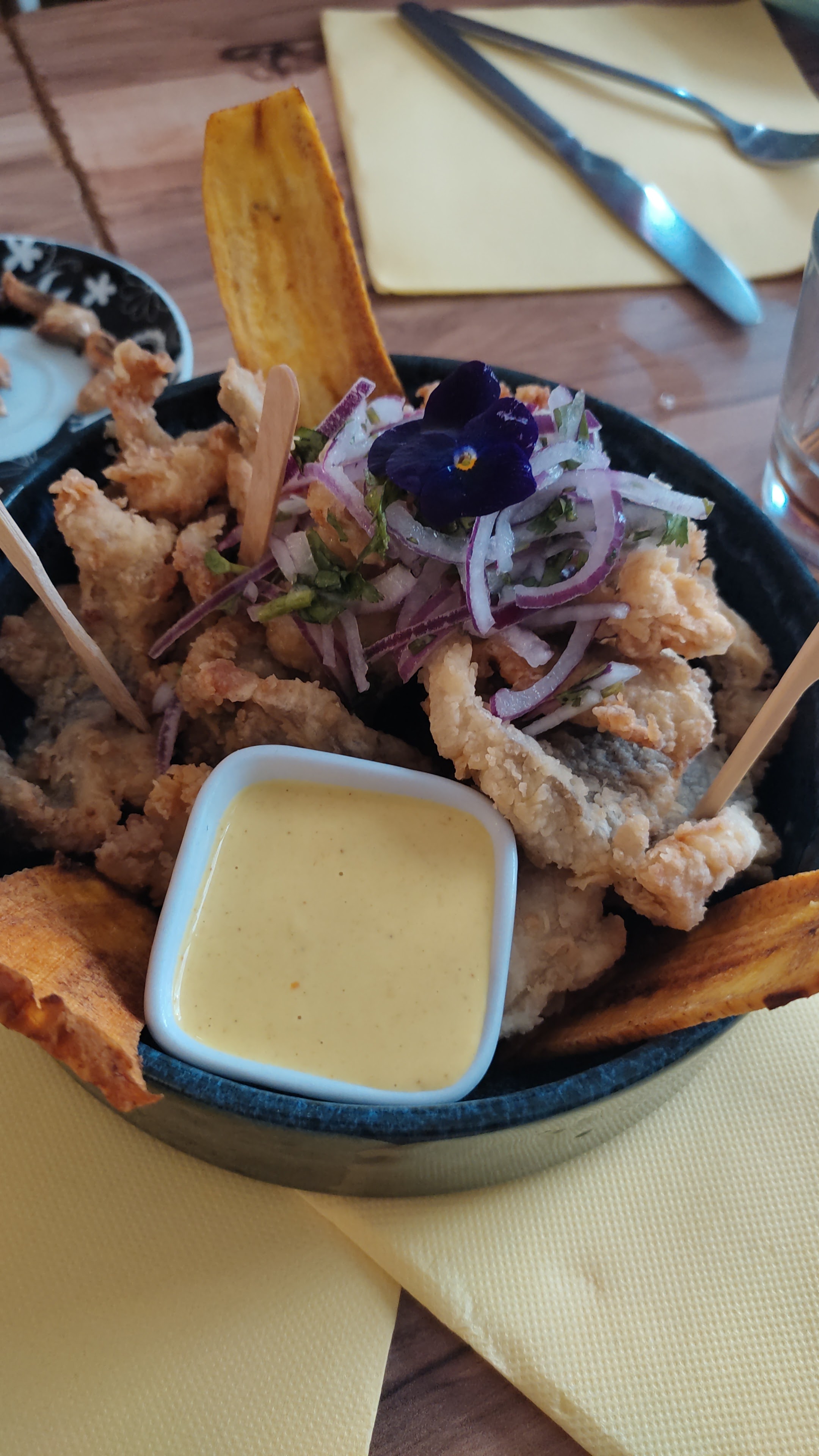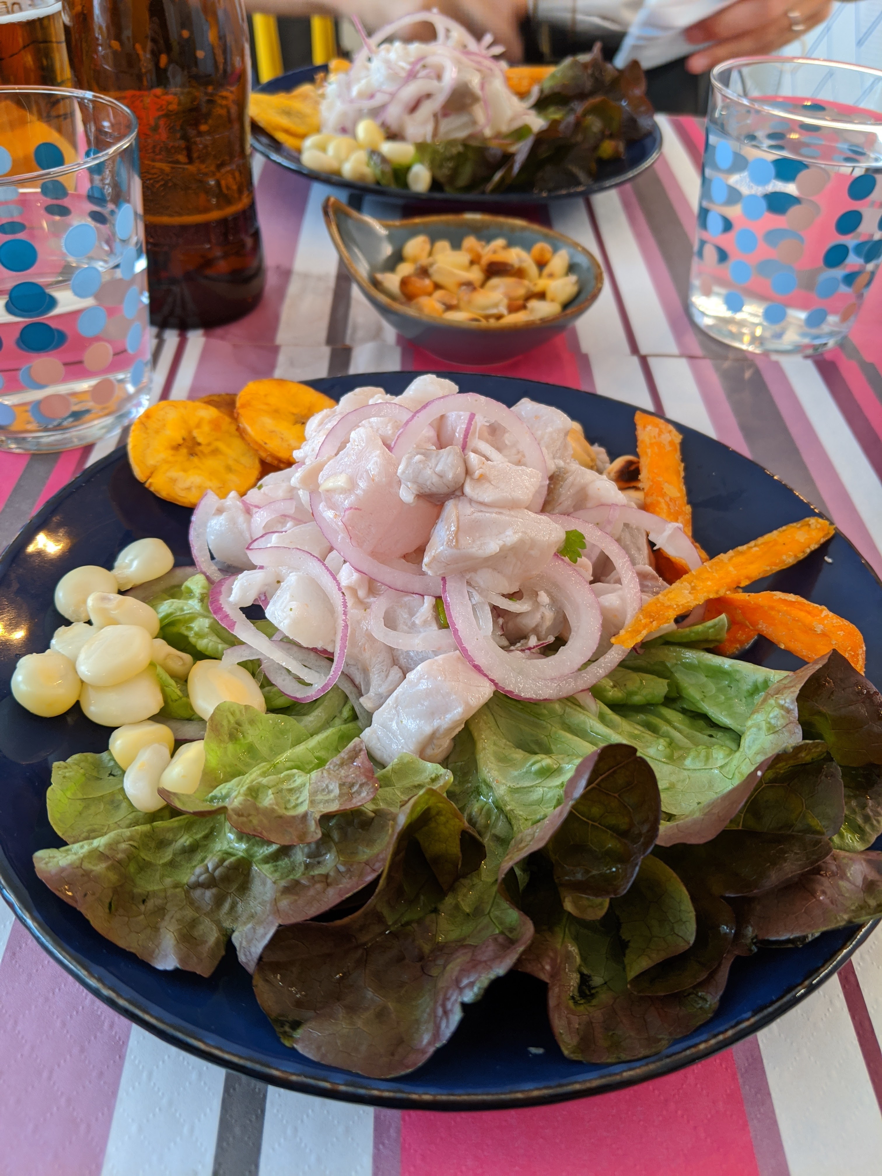 Ceviche bon l ensemble mais pas très copieux. J'ai été déçue par les chips à la banane, 2 euros pour 1/3 du pot.