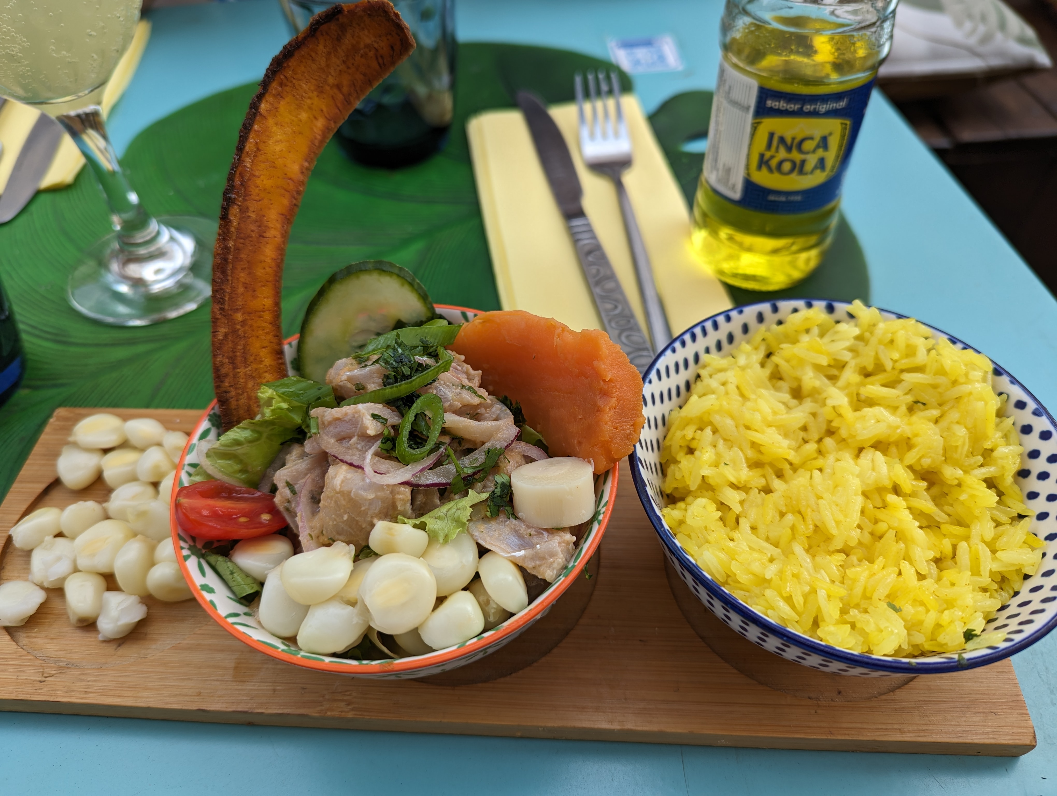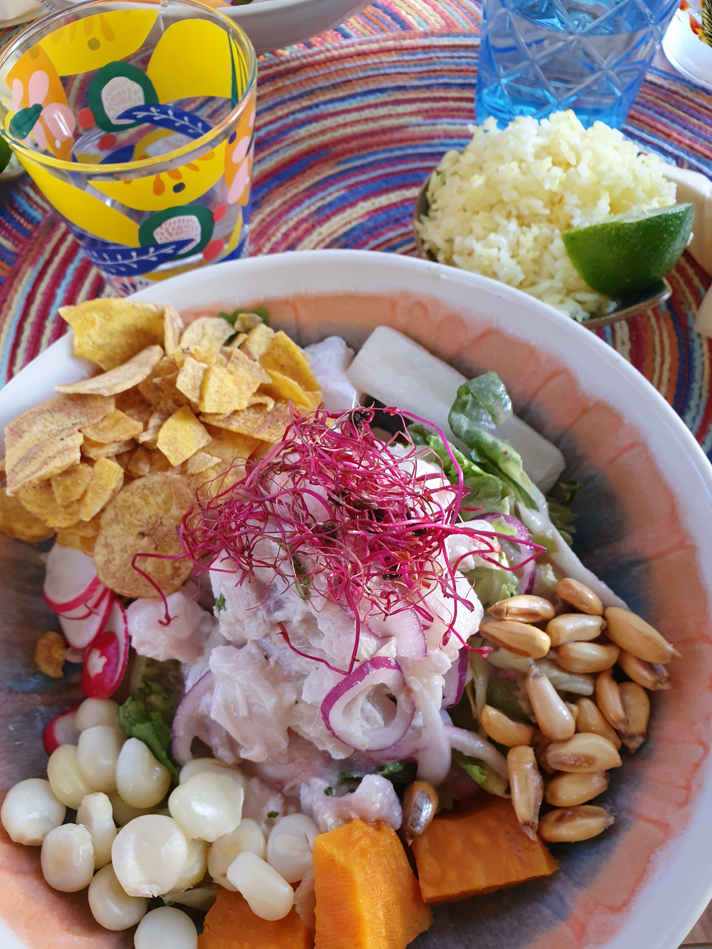 Merci Fiona, pour votre visite et beau commentaire. Le ceviche est le Mancora, la boisson au maïs violet est la Chicha Morada, faîte maison et enfin l’assiette de tapas à partager se nomme Piqueos. Au plaisir.
