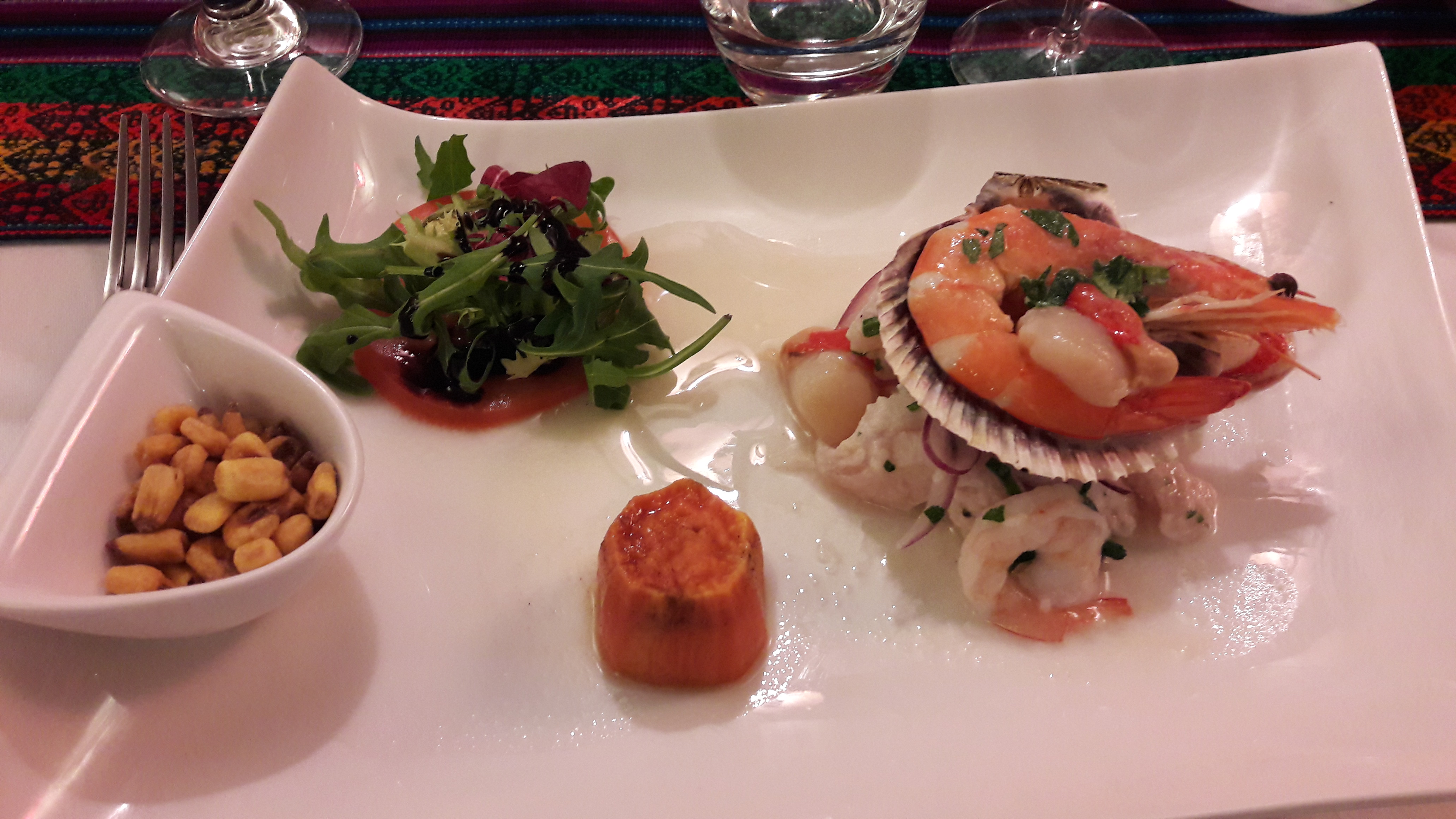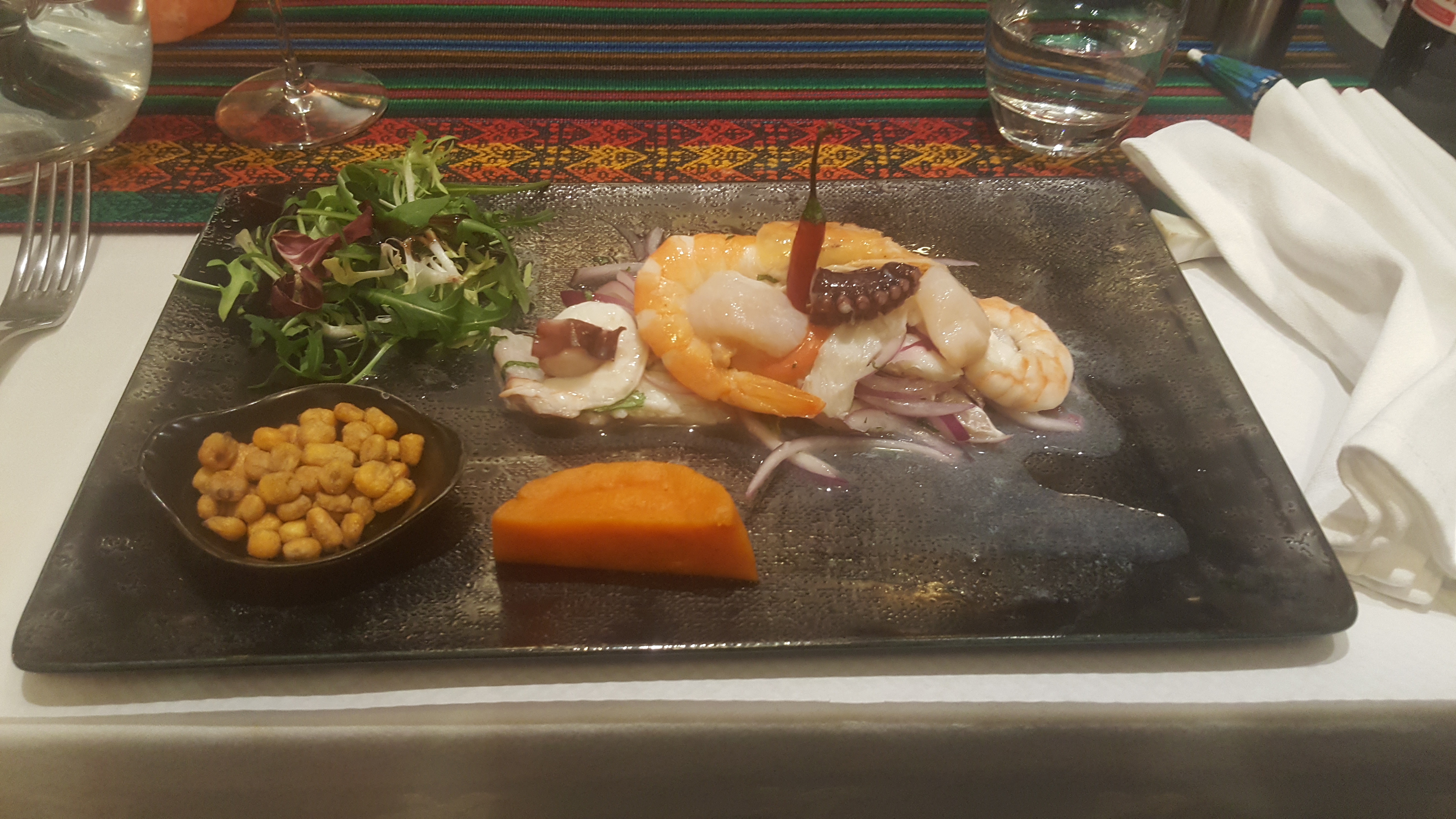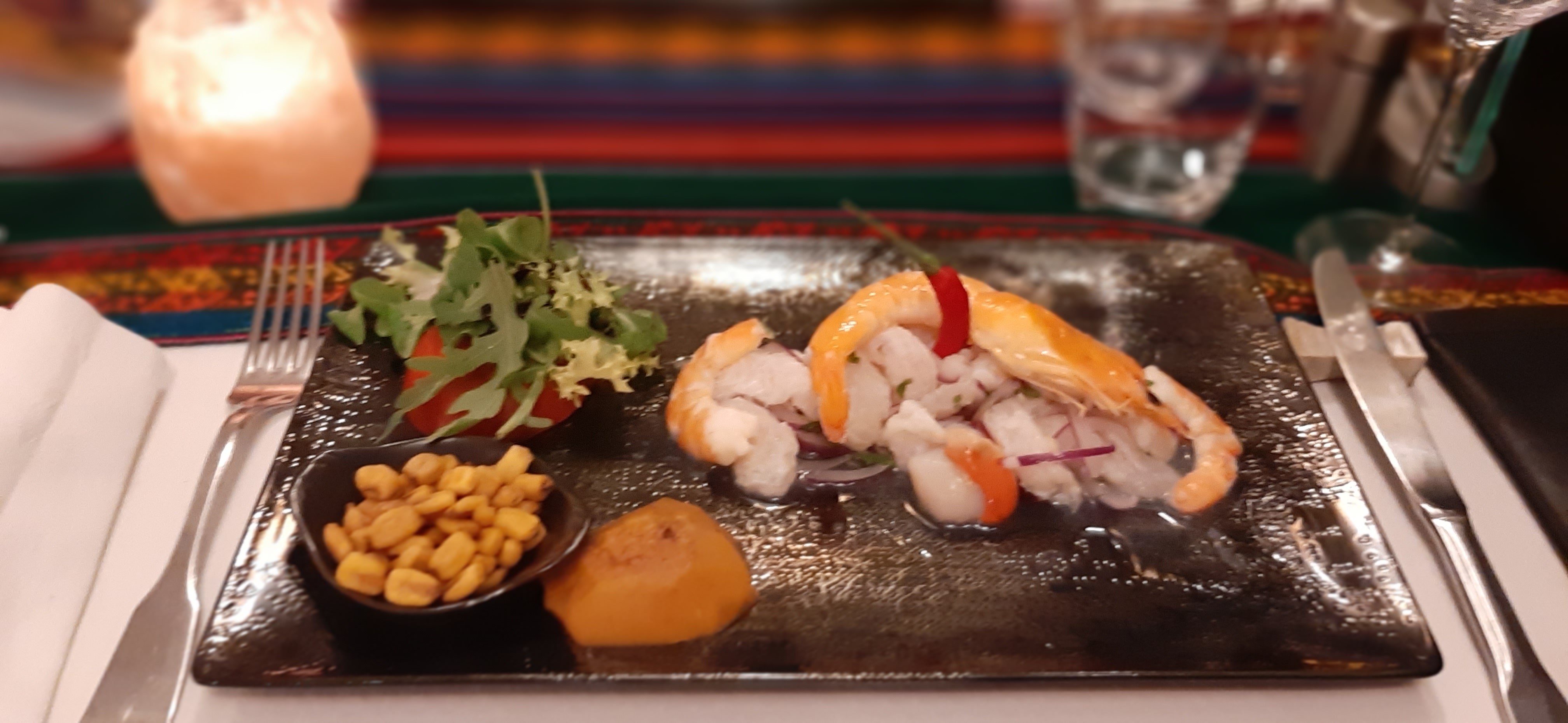 Si on vient dans un restaurant péruvien, c'est avant tout pour goûter aux plats et aux boissons du Pérou. Et quand on découvre que son ceviche de crevettes est fait de crevettes cuites entières, on est un peu perplexe. Pour ce qui est des plats, le seul qui fait penser au Pérou s'avère ne pas l'être du tout, et n'être là que par nécessité d'avoir un plat végétarien. Sur la table, on a placé une publicité pour une bière du Pérou, mais il n'y en a plus. On vous propose alors en remplacement un verre de vin chilien, dont vous ne verrez jamais l'étiquette. Et le ponpon arrive au moment de payer, où on vous annonce que la CB est en panne...