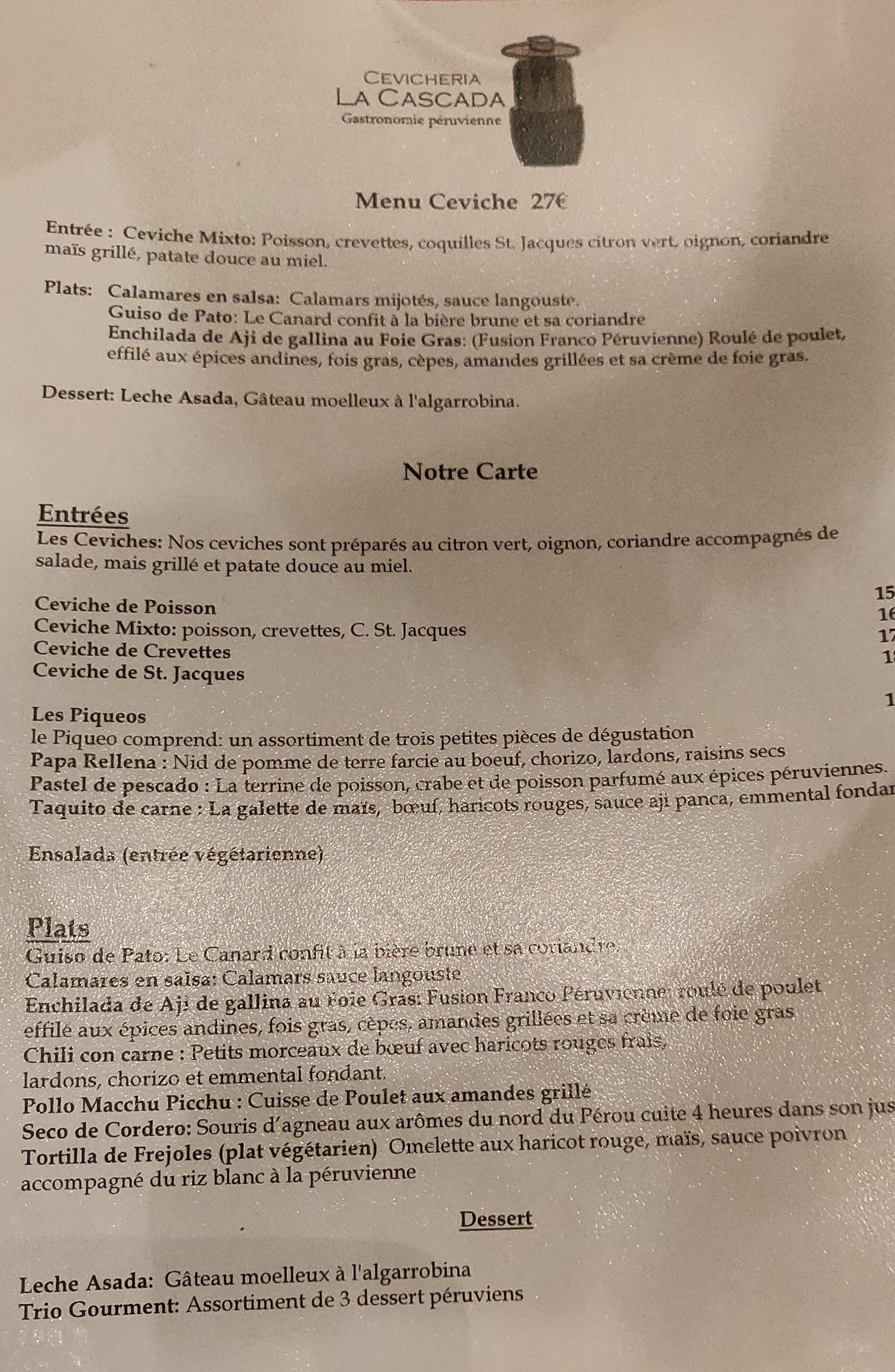 Moins cher que d'aller au Pérou. Des plats exceptionnels, très équilibrés dans les arômes et les saveurs. Menu à 27 euros très copieux, le dessert est absolument divin, on en a repris en plus par pure gourmandise.. Même pas honte c'est justifié. Le cadre est également incroyable, prenez le temps de discuter avec le patron vous ne serez pas déçus. Service très agréable, serveuse sympathique et efficace, merci encore pour cette soirée !