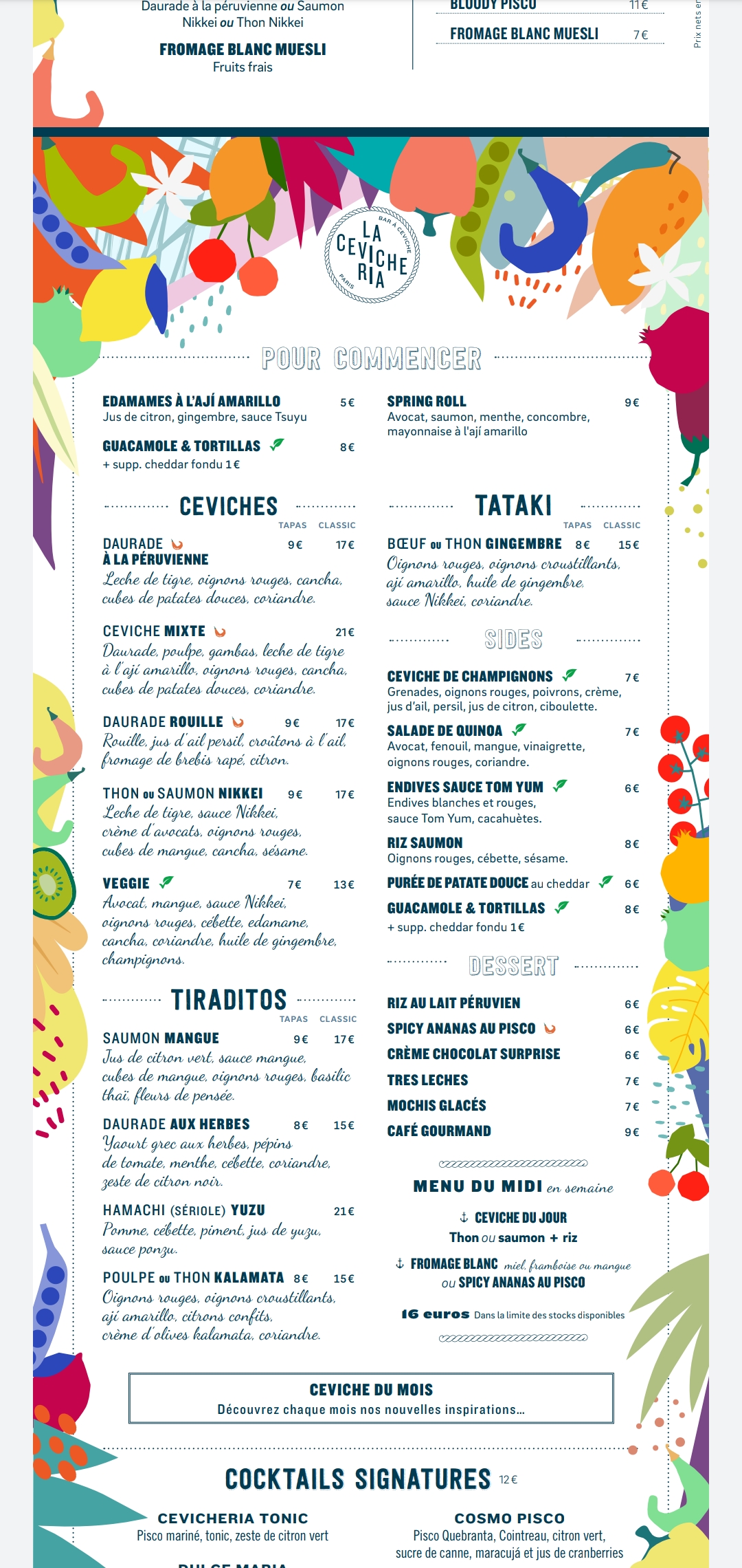 Bonne adresse parisienne pour les ceviches. Pas de réservation et très bruyant à midi. Venir à 13h30. Bien vérifier la note car nous avons eu une erreur de plus de 20 euros.