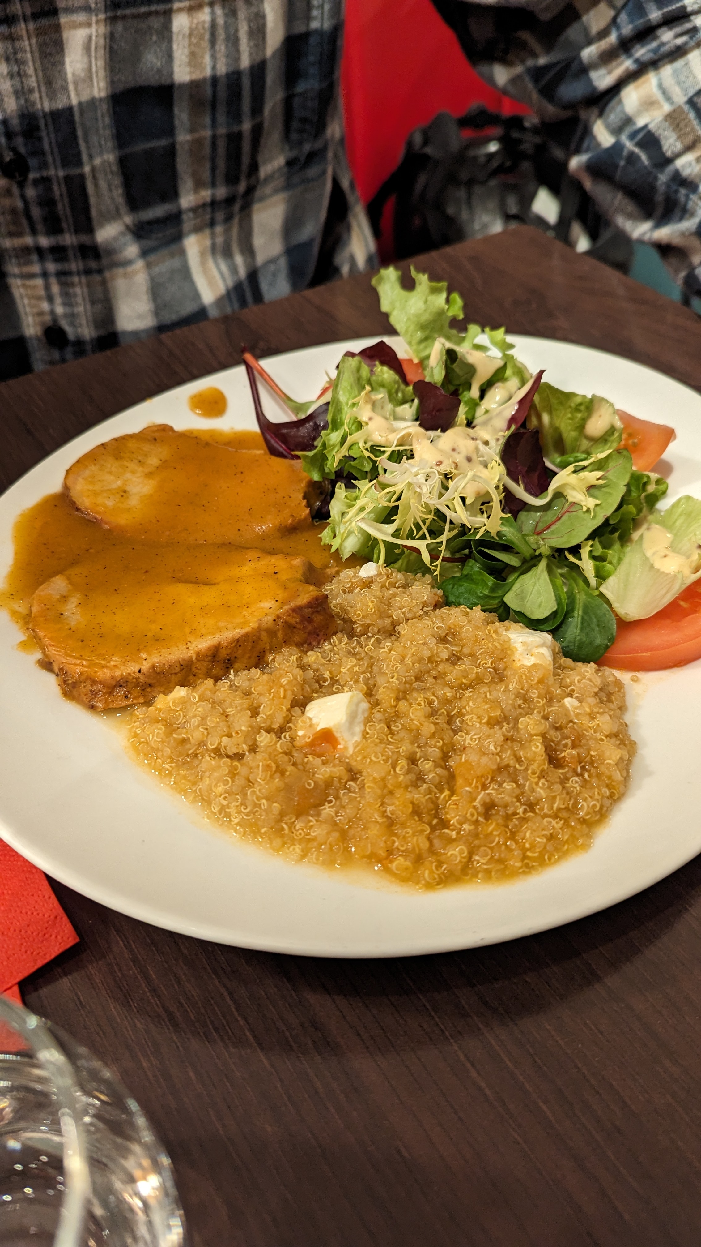 C'était bon, menu midi à 14€ (entrée plat dessert) avec du choix et très copieux. Ce n'est pas un très grand restaurant mais on peut quand même venir en groupe (nous étions 7). Le service était efficace, le timing était parfait entre les plats et les gérants très gentils. Vous pouvez même commander en espagnol.