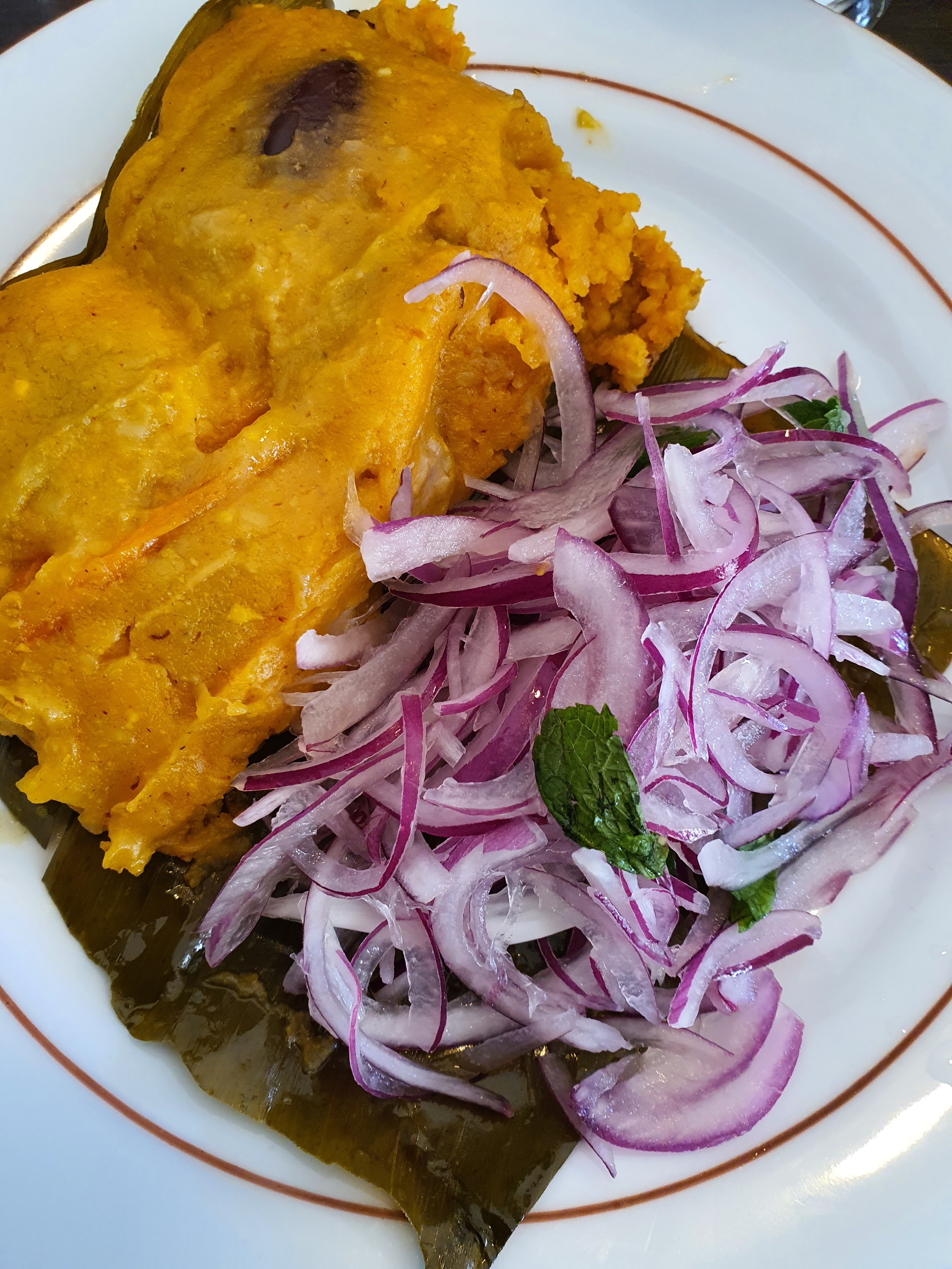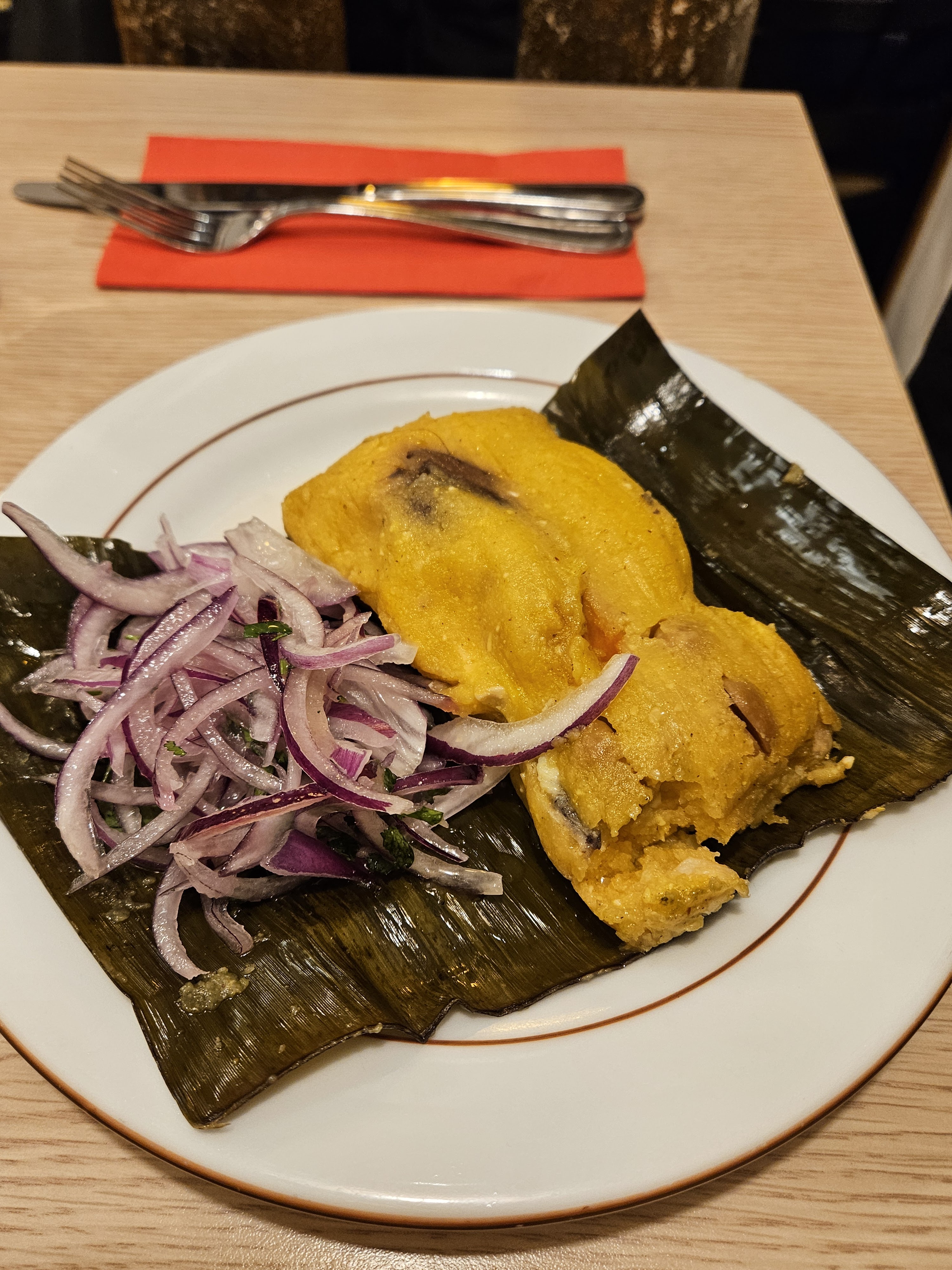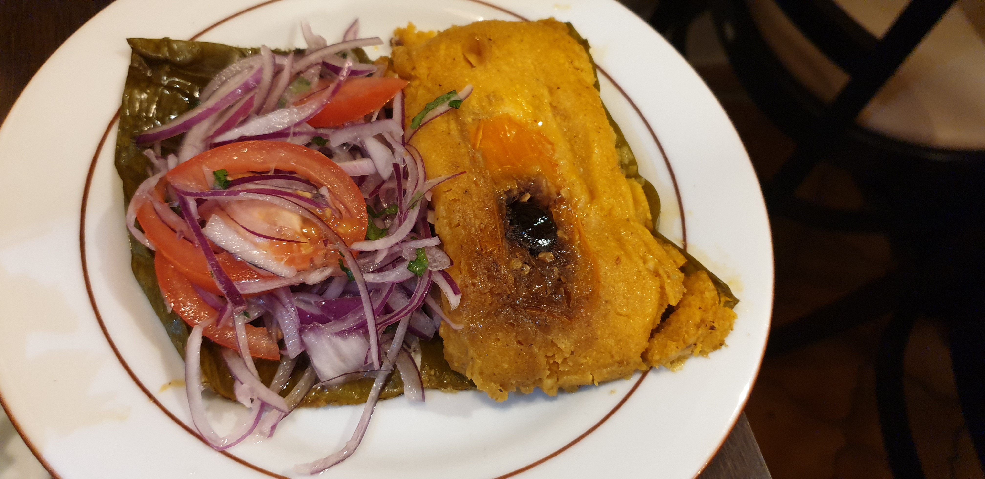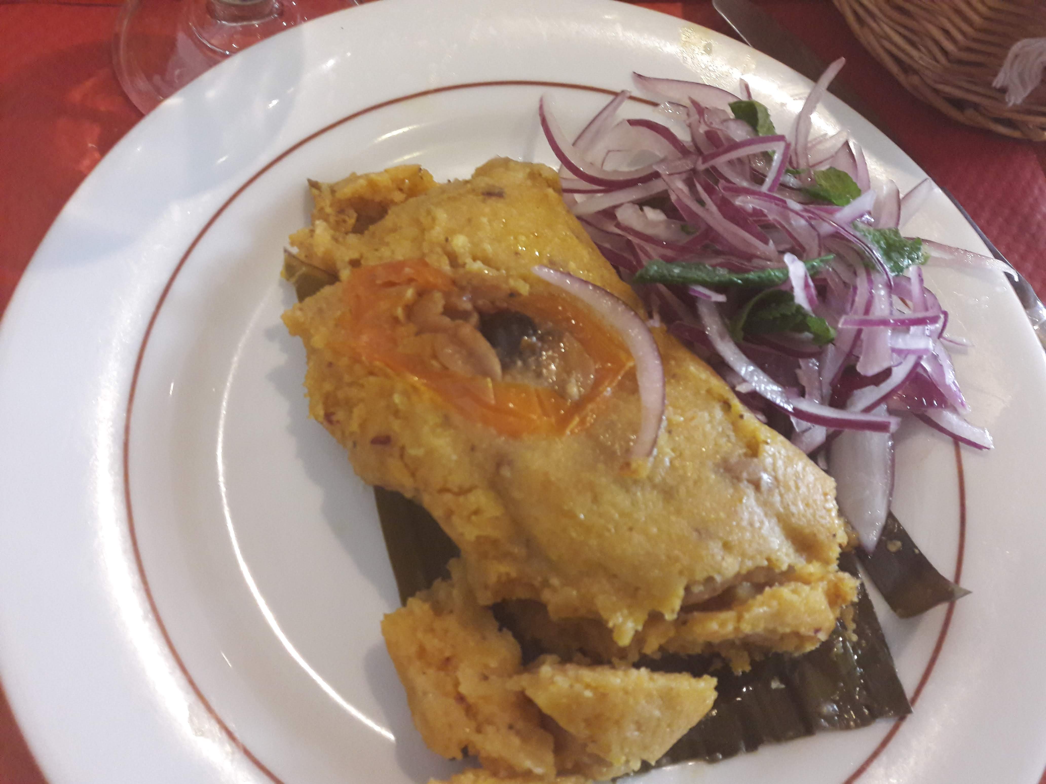 Accueil et service agréables, la déception côté saveur et simplicité de cuisine pour le prix, le pâté de porc est une tranche de porc entourée de purée de maïs dans une feuille de bananier, la tranche de porc du chancho aux amarillos fait à peine 100g, haricots blancs et quinoa fades etc ...