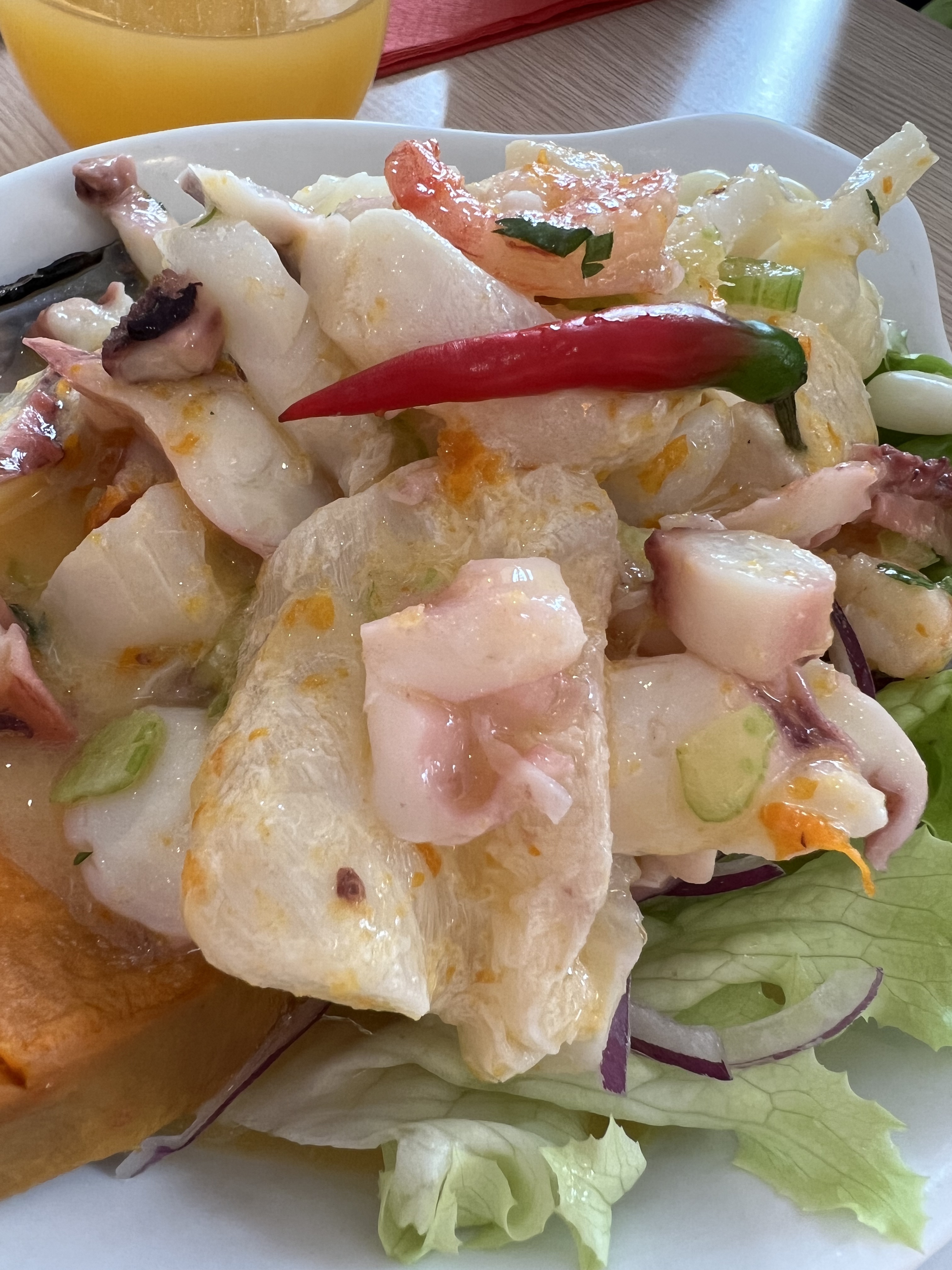 Leche de tigre : plat intéressant et plutôt bon mais beaucoup trop salé Boisson chicha morada : très bon un peu trop sucré Viudo de pescado : bon plat sans fausse note