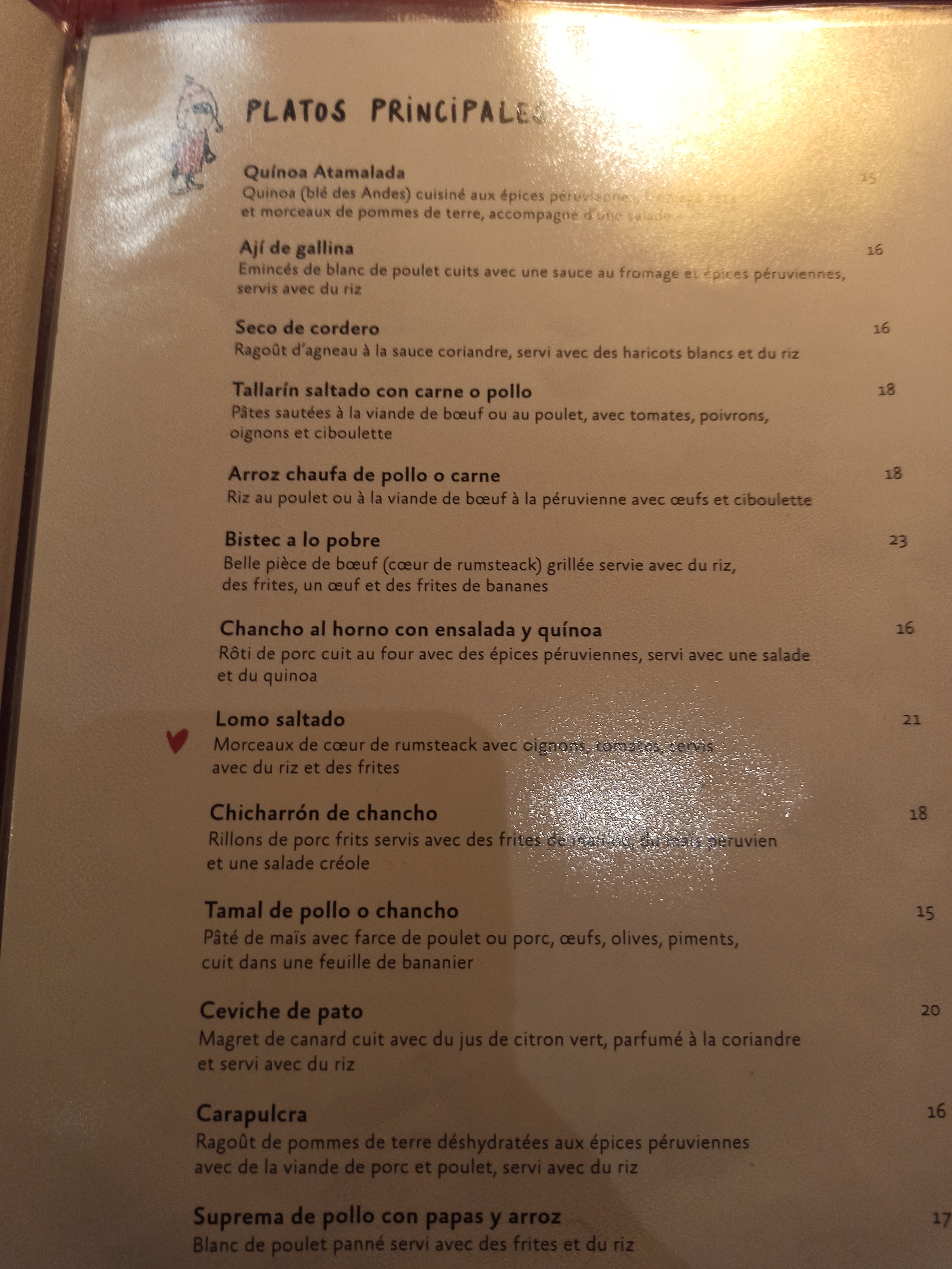 Un menu complet pour 16€ : très bon rapport qualité prix, idéal pour découvrir les saveurs du Pérou ! Les quantités sont parfaites, le service est très agréable et de bons conseils. Merci pour l’accueil et à bientôt