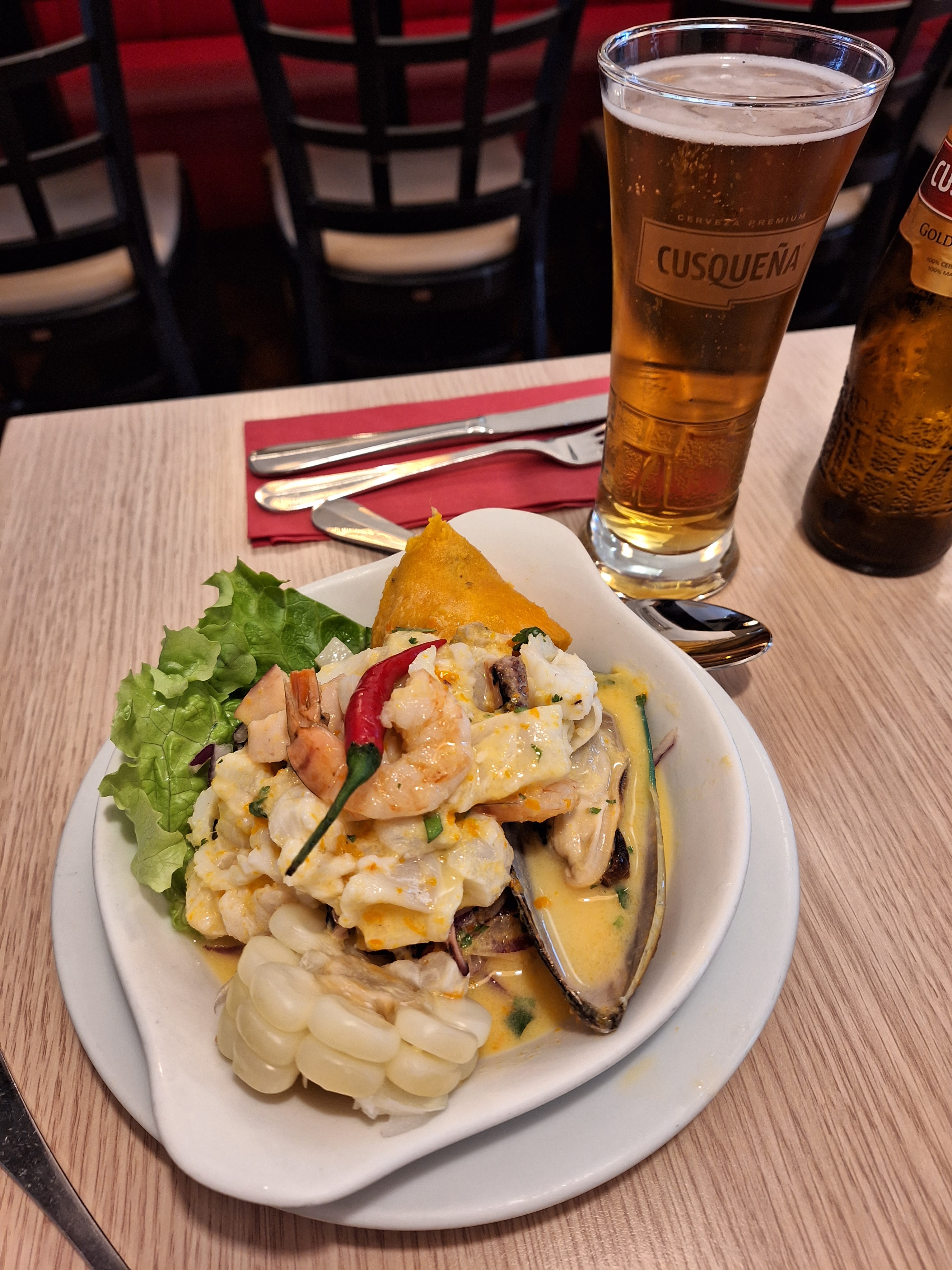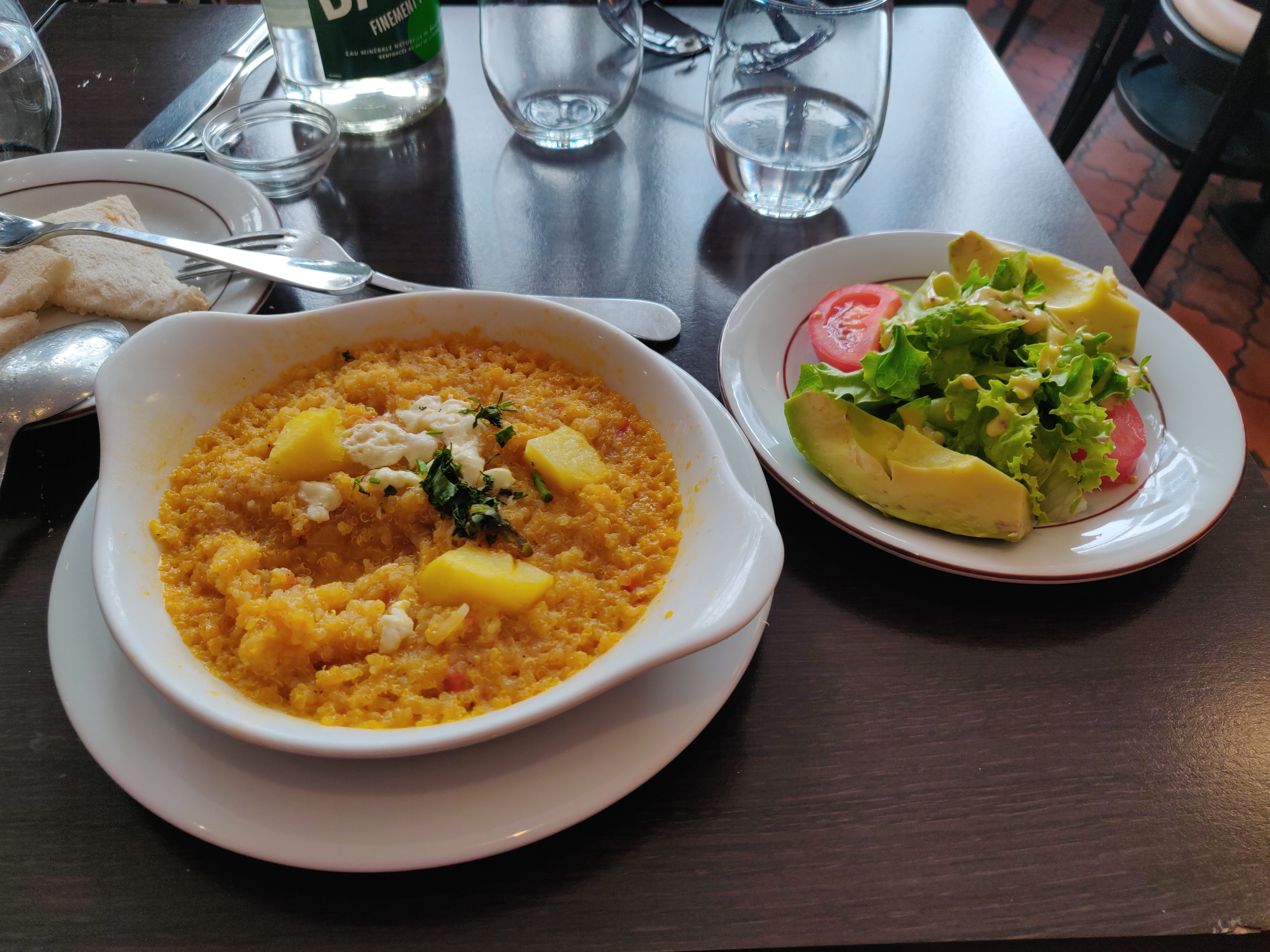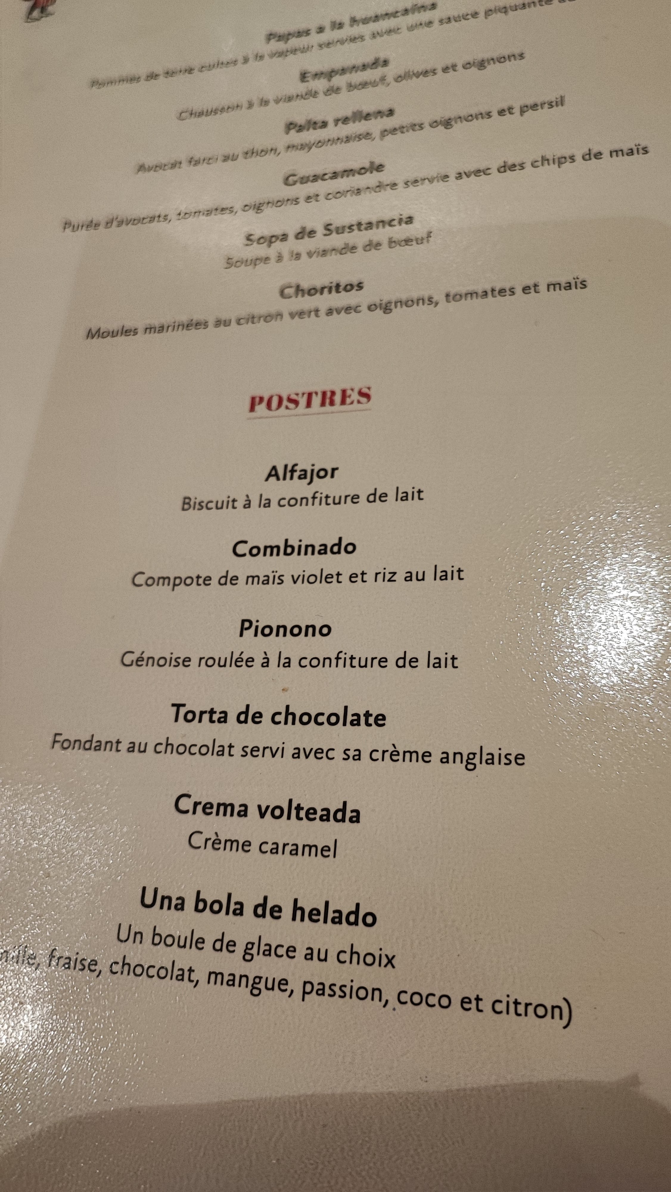 Les plats sont excellents en particulier le Chupe qui remplit bien l'estomac. Le café gourmand est intéressant en goût ! Ne surtout pas prendre la boisson Kola que je pensais être similaire au Coca Cola. C'est en fait un soda jaune au goût de médicament...
