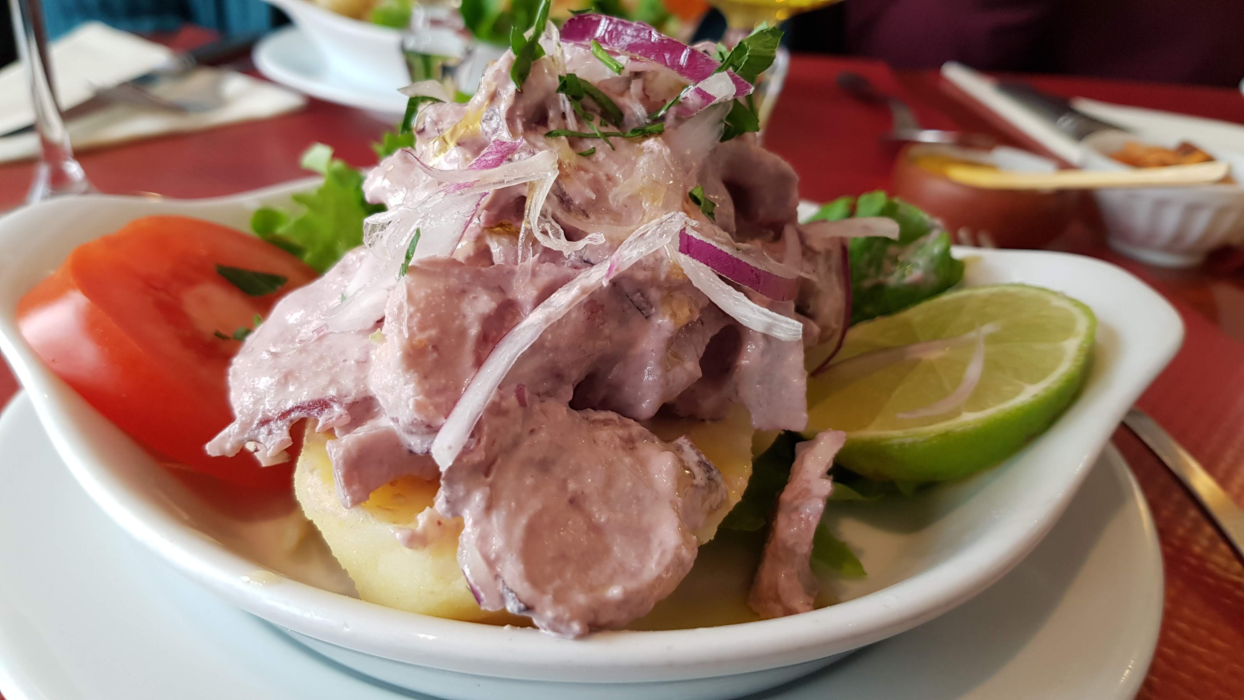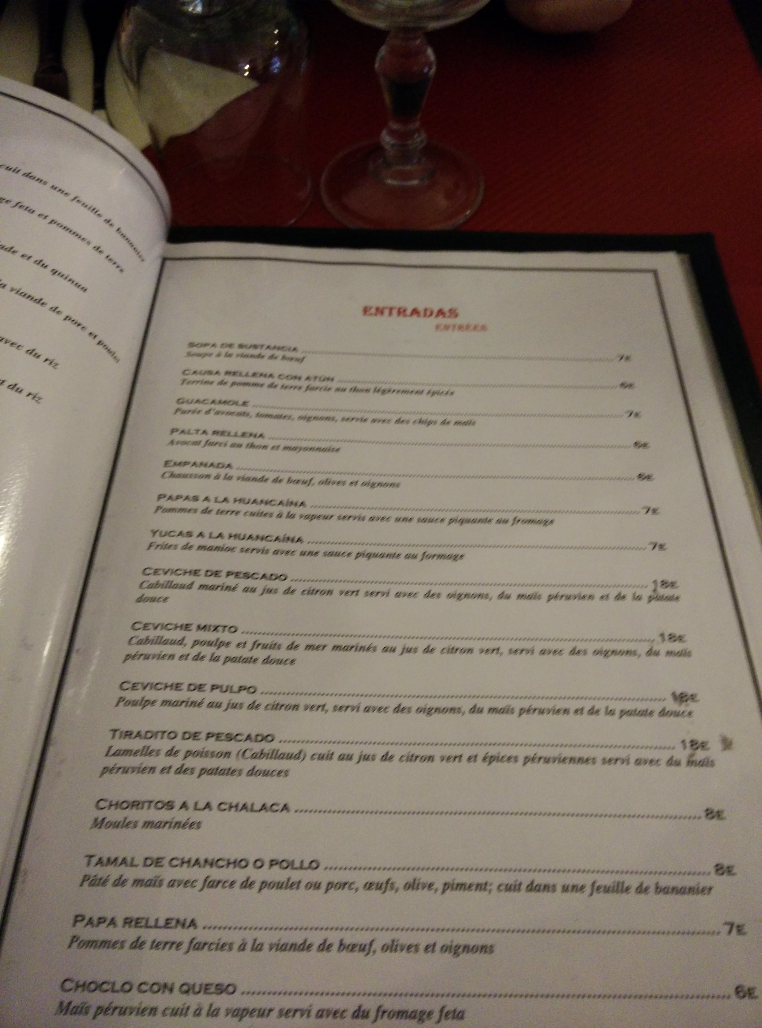 La papa la huancaina, sur et certain qu'elle vient du frigo ! Elle était horrible ! Après le seco elle était bien. Le prix du menu moyenne mais trop cher un petit cafe 2 euros, 16 euros pour un menu et un petit cafe froid encore! Je vais jamais retourner !