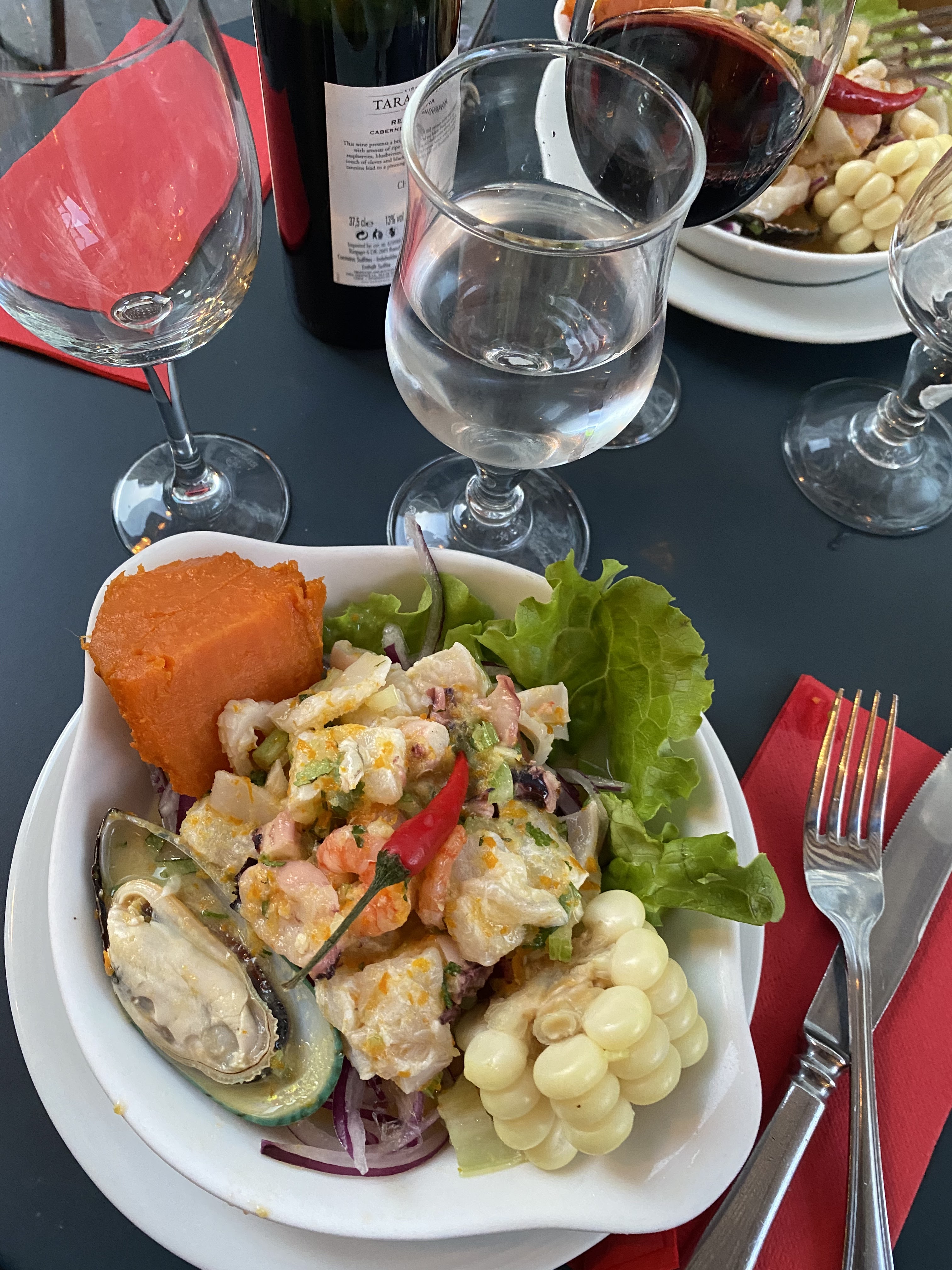 Grande variété de plats originaux et délicieux. Meilleur Ceviche le que j’ai jamais goûté. Vins (blancs) d’Amérique du Sud appréciés variablement.