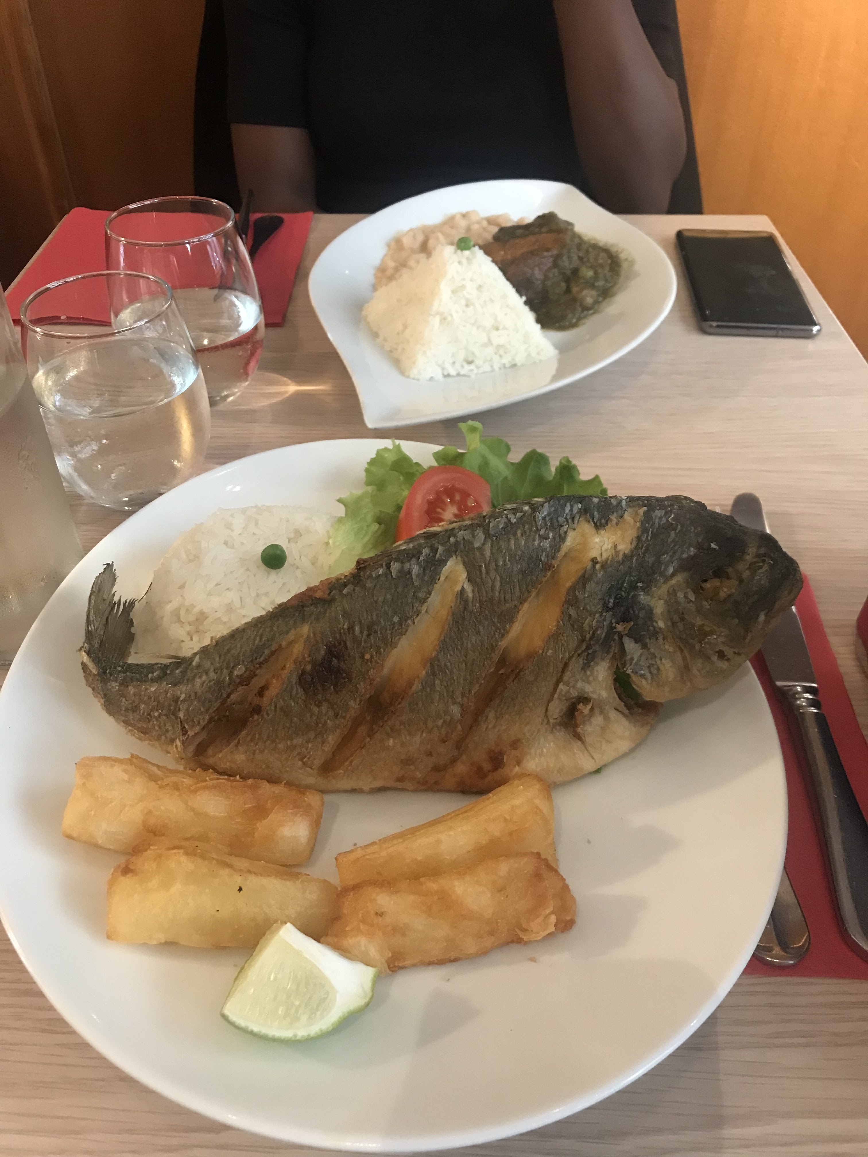 Joli cadre . Carte assez bien fournie et jolie . Plats très bons et prix corrects . Menus midi a 14€ très bien . Service rapide et agréable . Un seul bémol ?! L’accueil à revoir . Meme si on est au téléphone ( serveur ) on peut lever la tête lorsque des clients entrent et leur faire un signe de la tête où les inviter à s’installer d’un signe de la main . Seule chose qui m’a agacée . Ci dessous dorade , frites de manioc ( une première pour moi , très bon ) , riz et salade à 18€. Je recommande ce restaurant. À bientôt !