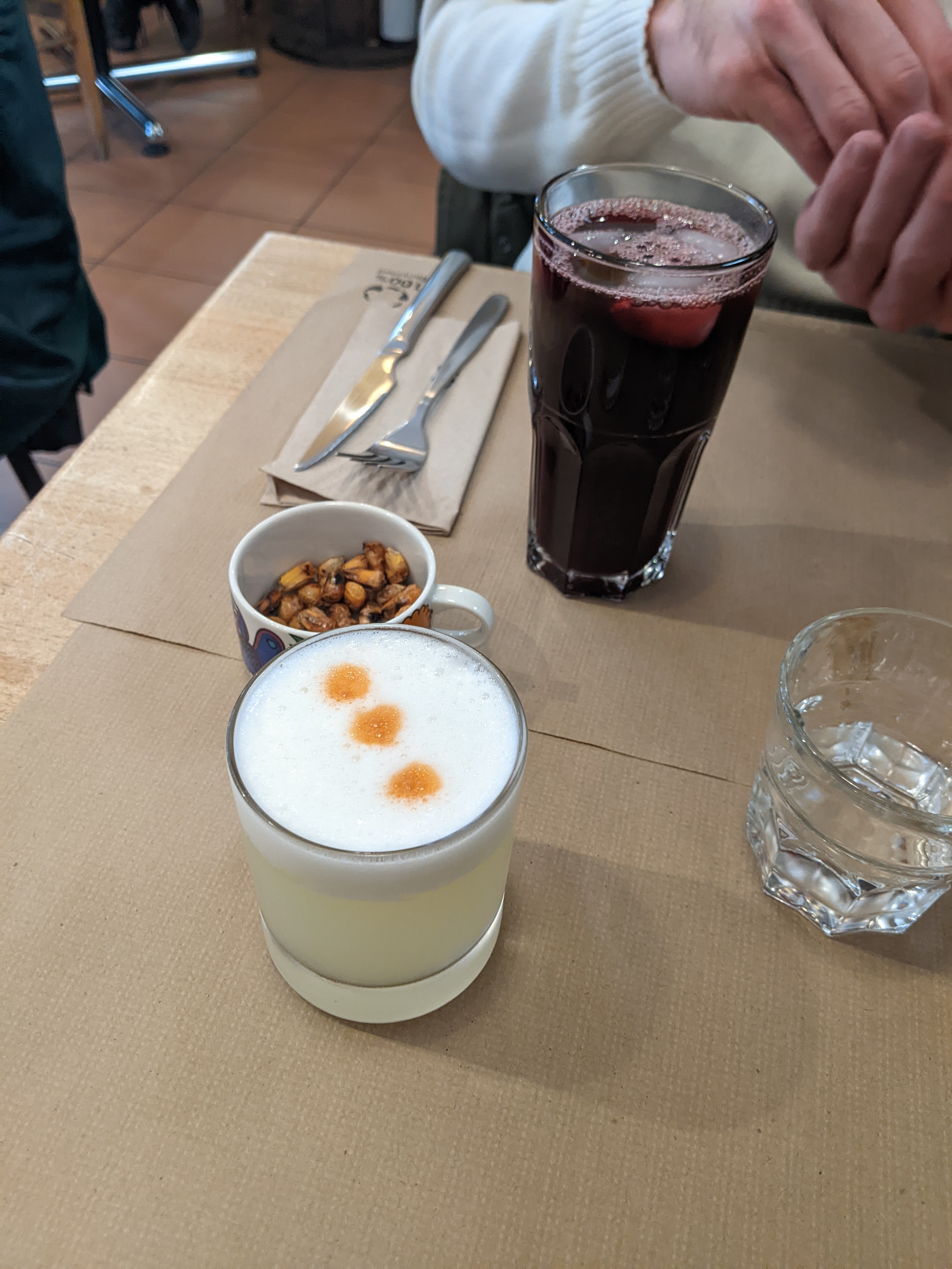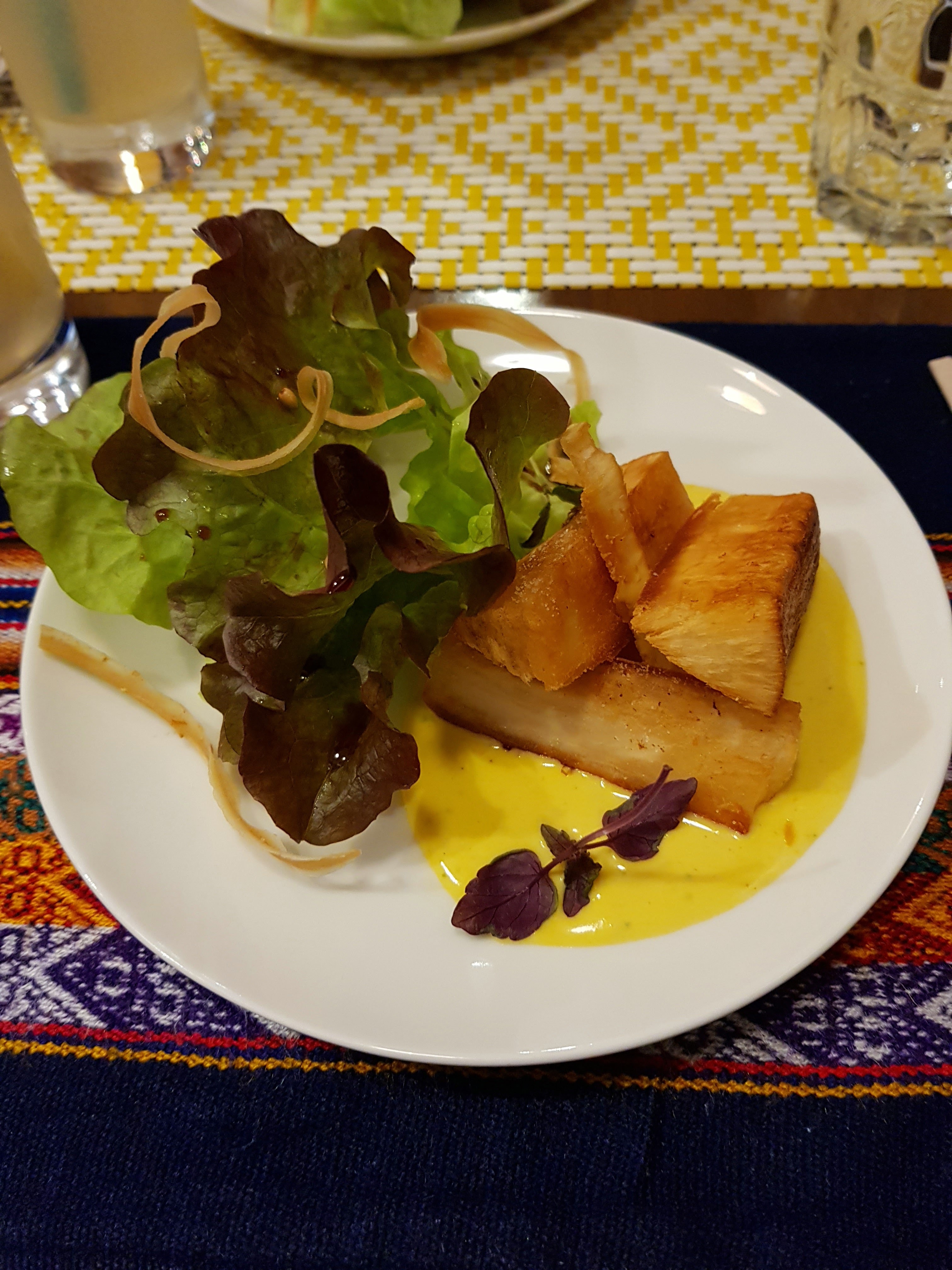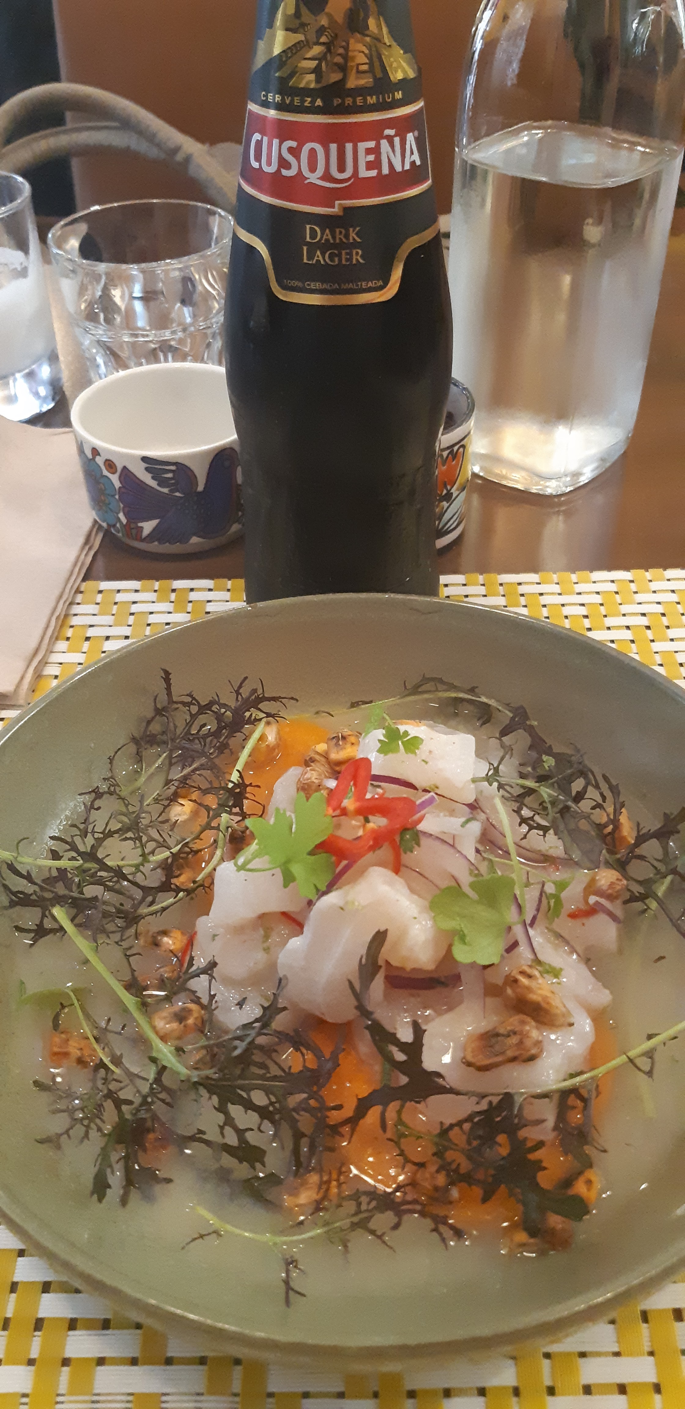 Petit restaurant sympa, trés bon cebiche de poisson (plat marinée avec du citron,coriandre oignon blanc,acompagnée de patate douce,un peu du piment) et la causa vegetarienne comme entrée( comme une purėe de pomme de terre bien assaisonnée bien assaisonnėe avec du citron,et farcie avec des carottes rapés) super bon et produits frais fait maison. Un bon cocktail de Pisco Sauer et une bonne biére de cuzco! Vive le Perou