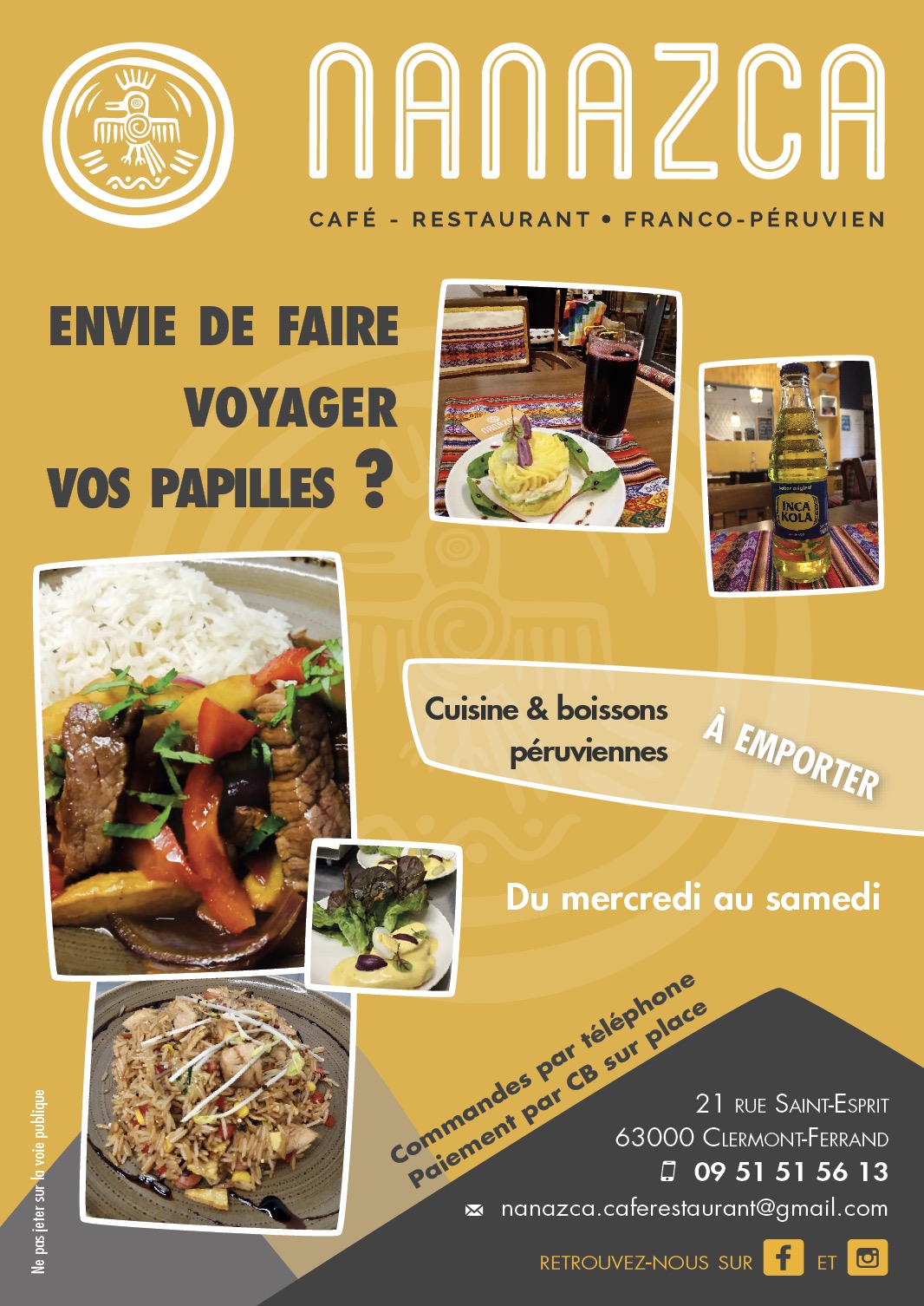Voici toutes les informations sur le Restaurant péruvien Nanazca qui ce trouve au 21 Rue Saint-Esprit, 63000 Clermont-Ferrand (63). Sur cette fiche vous trouverez les photos, l'adresse, les horaires d'ouverture, le numero de téléphone et les avis clients.Vous pouvez églement rédiger un avis si vous le souhaitez en bas de page.