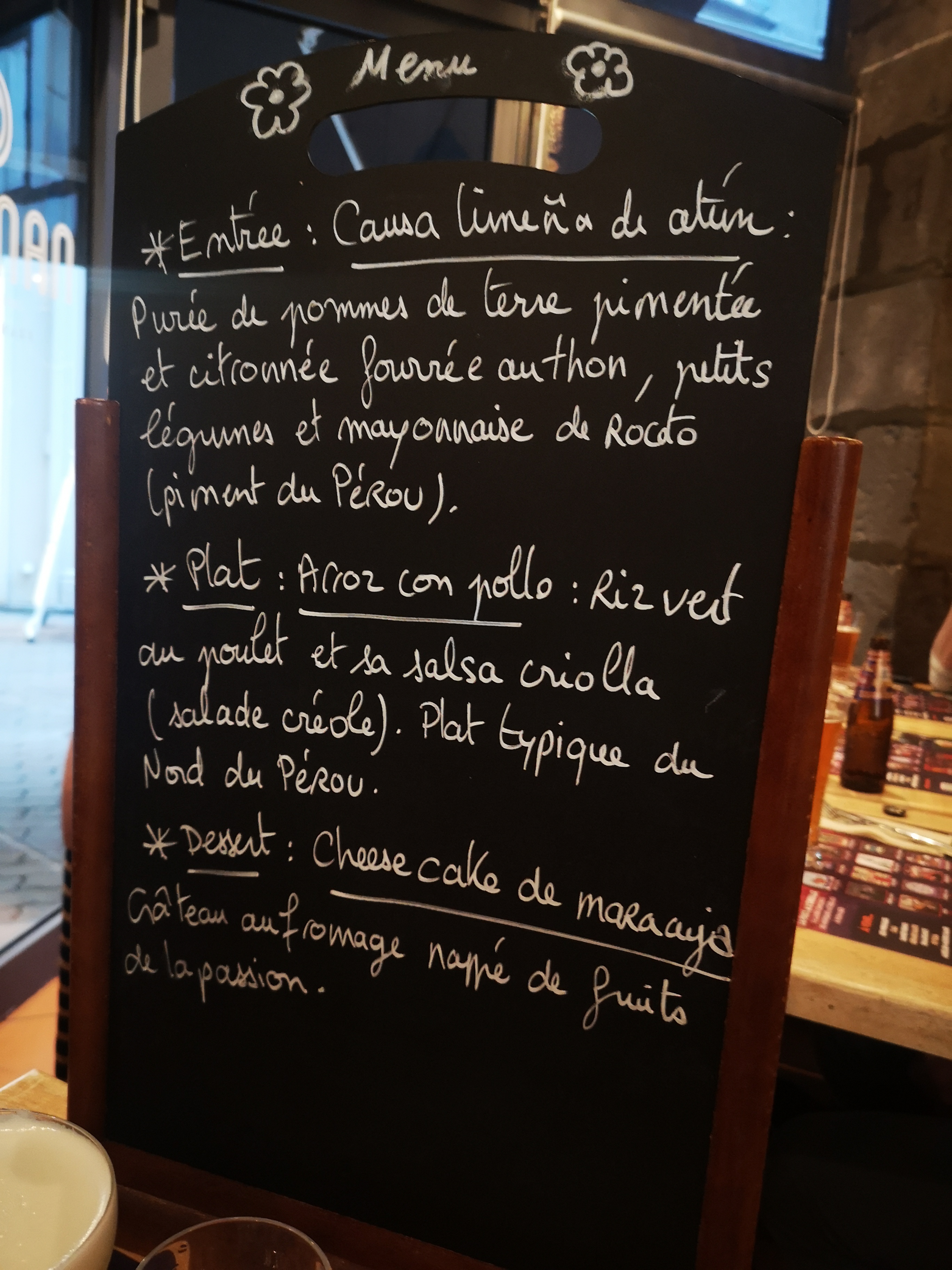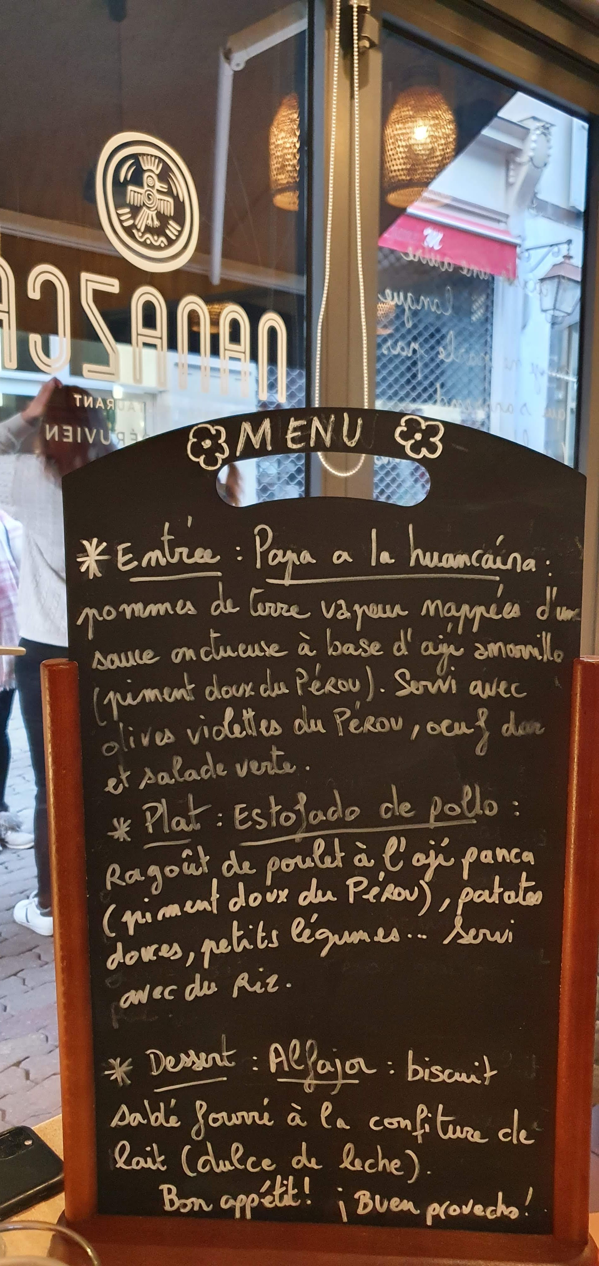 Restaurant qui vous plonge au milieu du Pérou à travers les différentes saveurs des plats. Le chef péruvien vient vous expliquer ses plats. La serveuse peut également venir vous faire rêver du Pérou. Tout est fabriqué maison et pas besoin de s embêter à choisir car c'est plat unique avec de vrais saveurs.