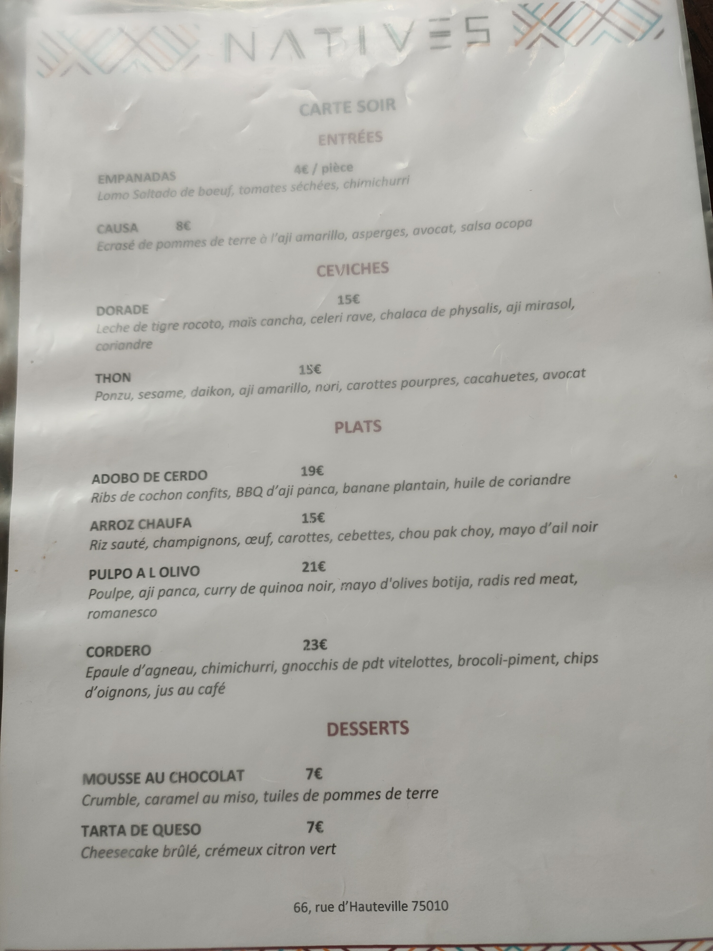 Voici toutes les informations sur le Restaurant péruvien Natives qui ce trouve au 66 Rue d'Hauteville, 75010 Paris (75). Sur cette fiche vous trouverez les photos, l'adresse, les horaires d'ouverture, le numero de téléphone et les avis clients.Vous pouvez églement rédiger un avis si vous le souhaitez en bas de page.