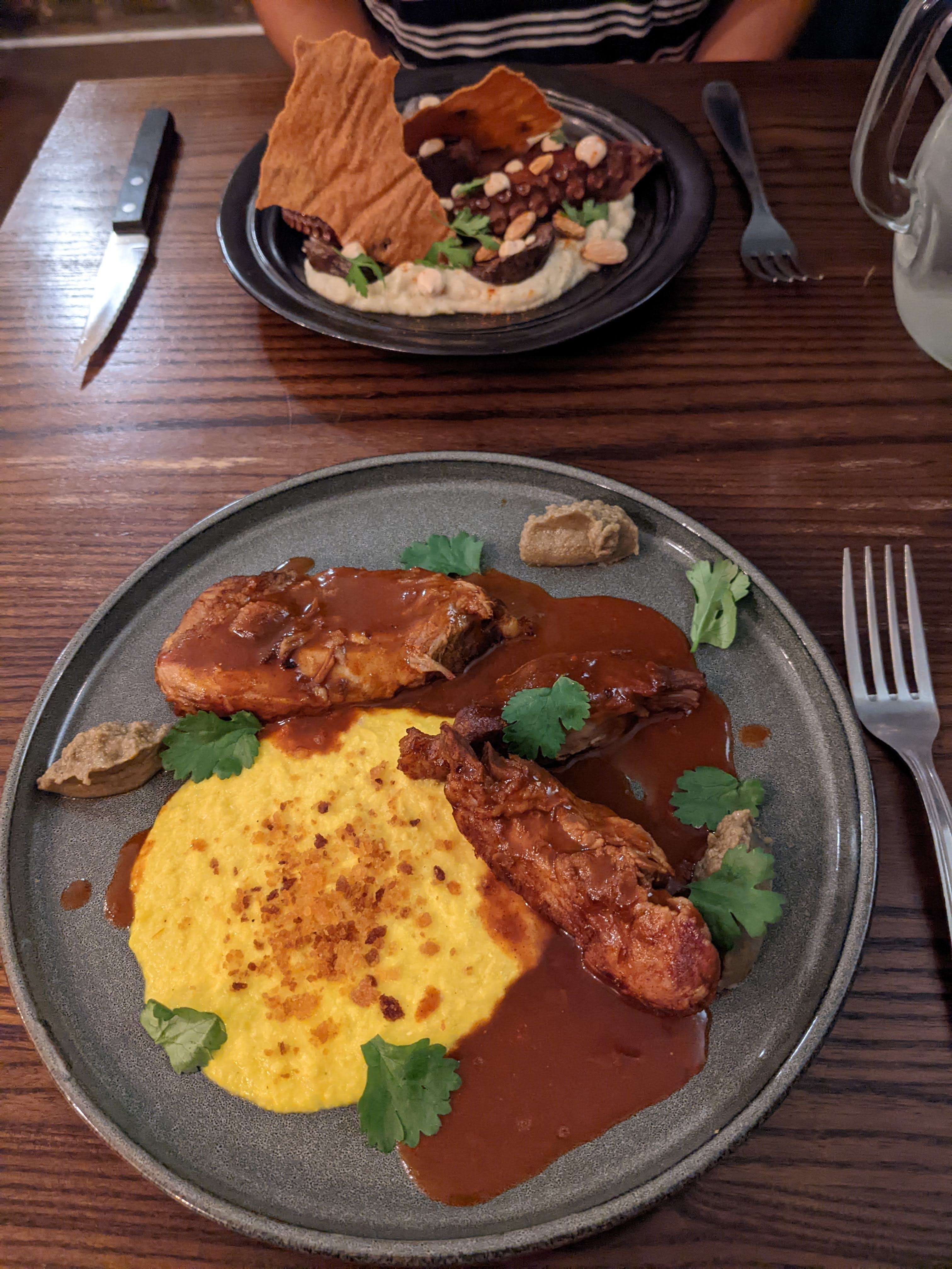 Nous avons pris 1 plat de poulpe à l'olive avec des patates douces et un plat de poulet avec des legumes, c'était très bon mais la quantité est légère. Je recommande de prendre une entrée.