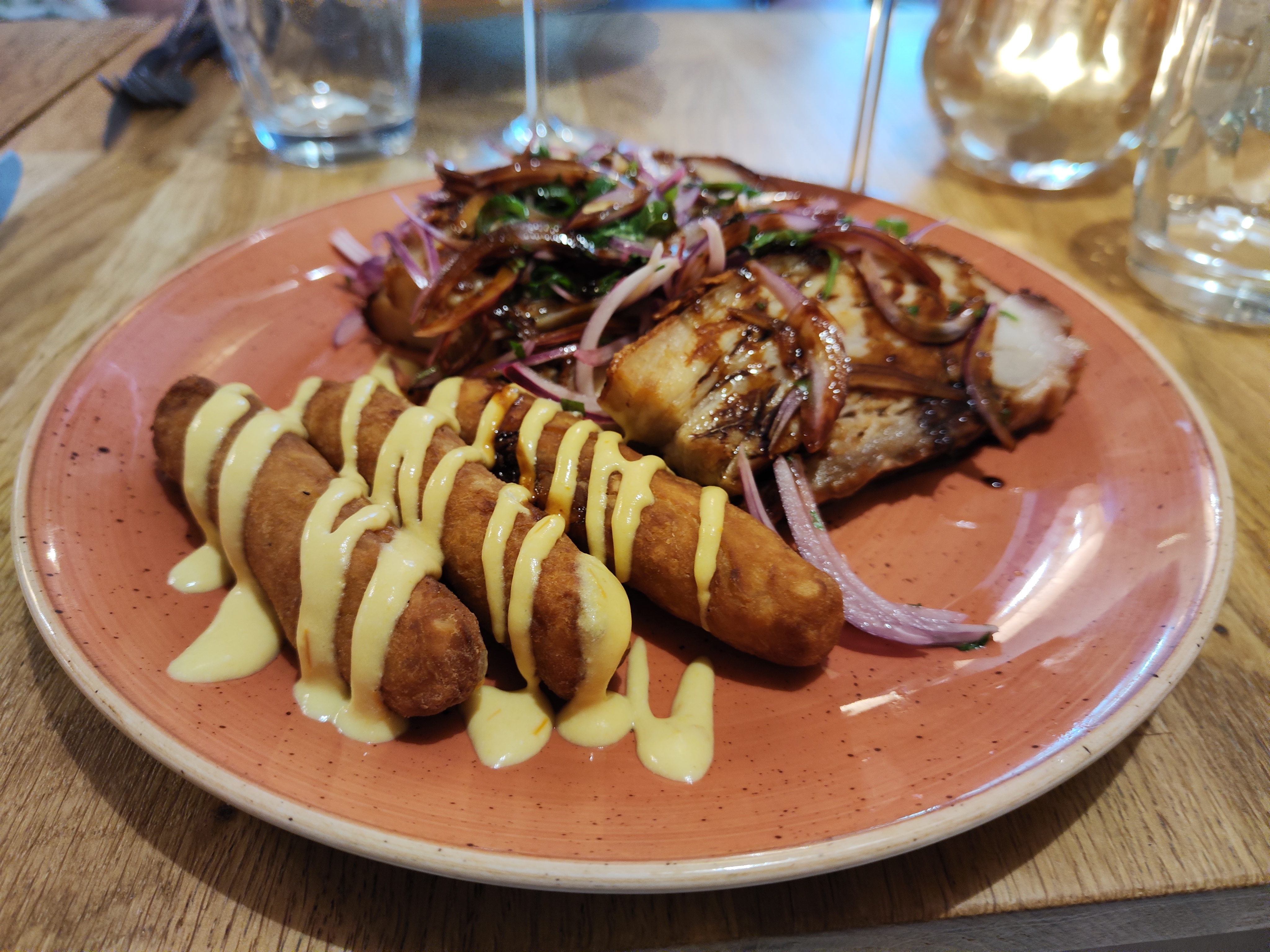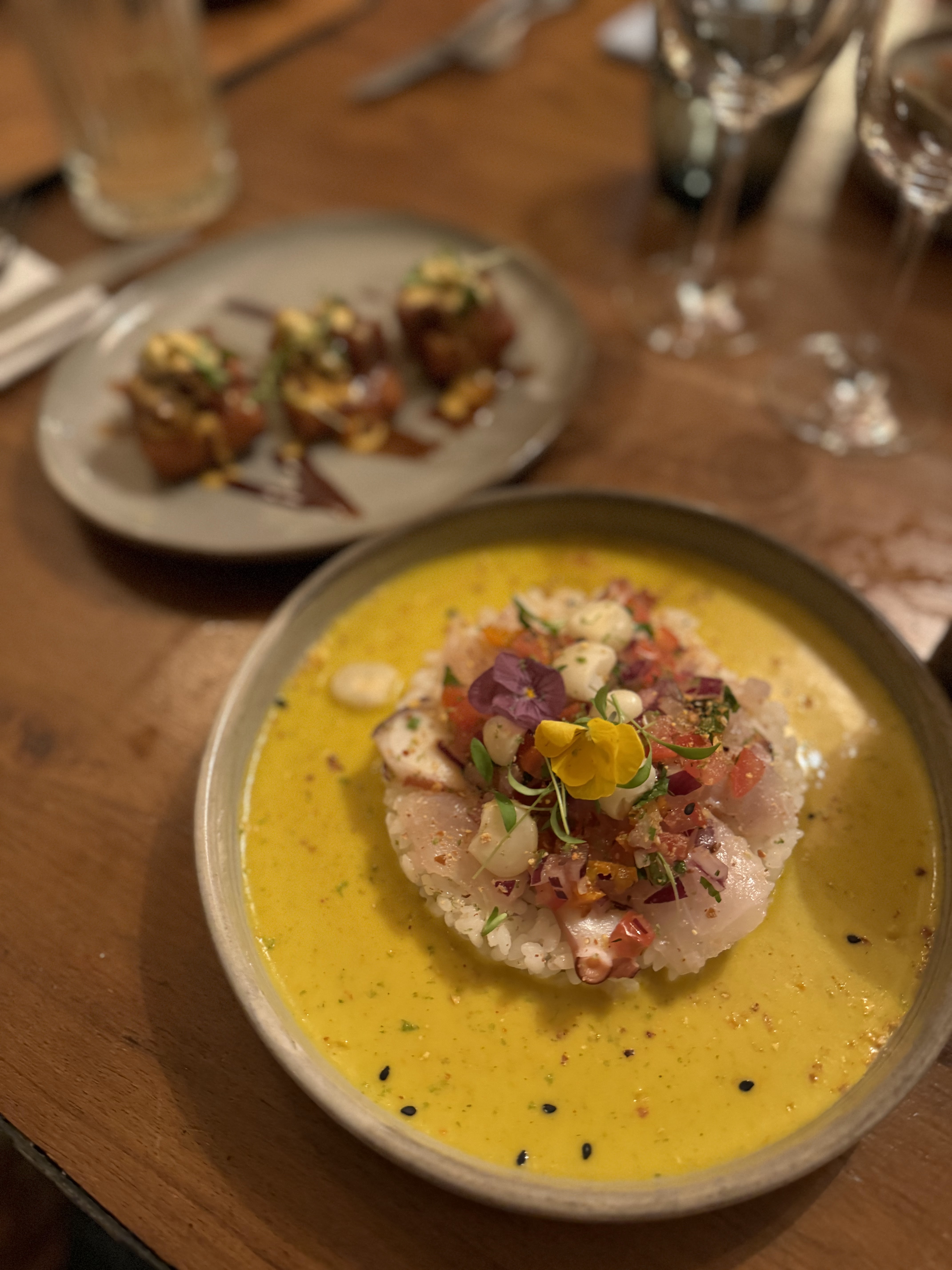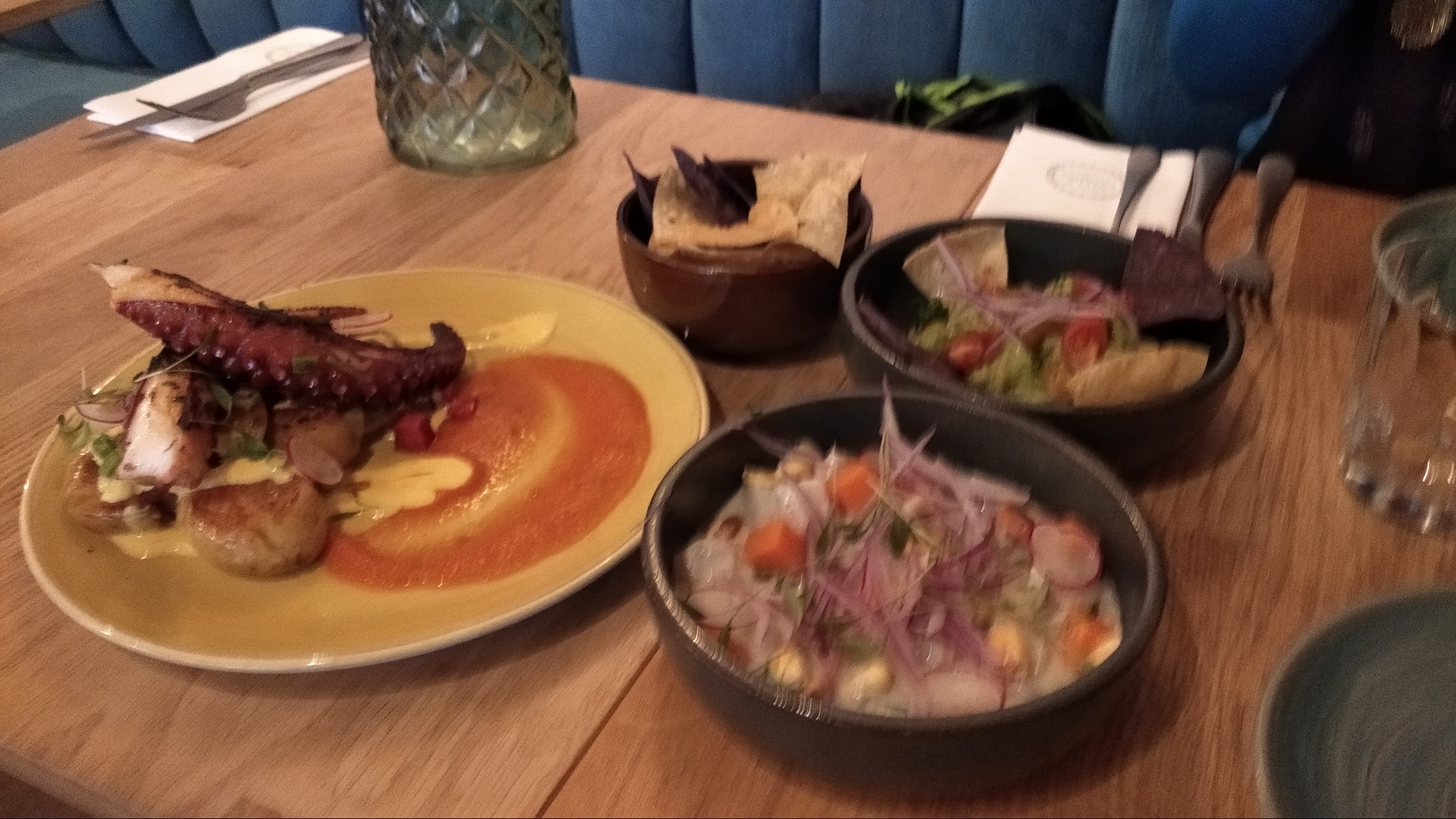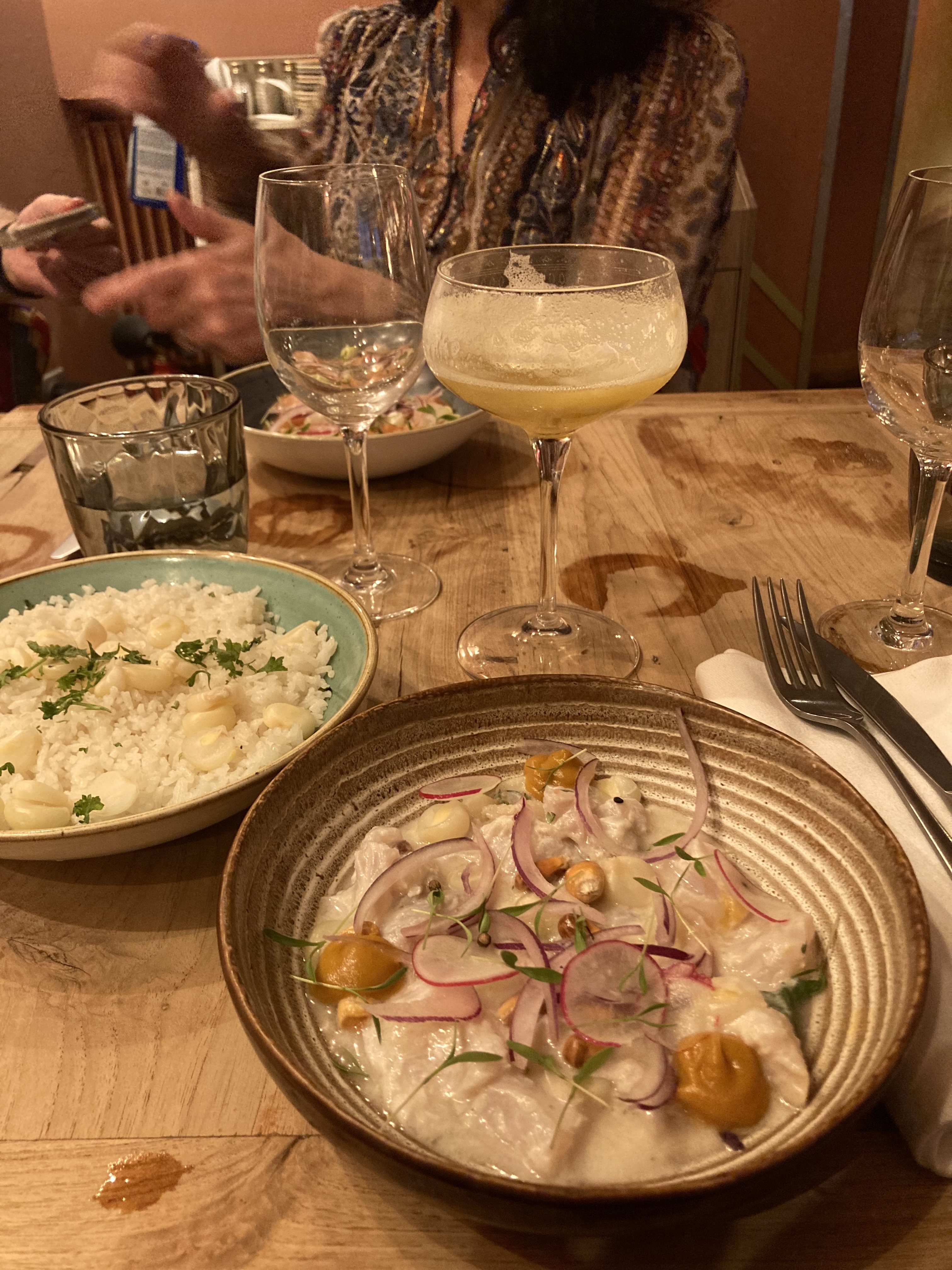 Les plats sont bons, bien assaisonnés. Nous avons pris du ceviche, du poulpe, et du risotto fruits de mer. Les fruits de mer étaient généreux, mais j’aurais aimé en voir autant pour le risotto en lui-même. Le cadre est sympa, mais la musique dans la salle bar était un peu forte, néanmoins on recommande l’adresse ^^