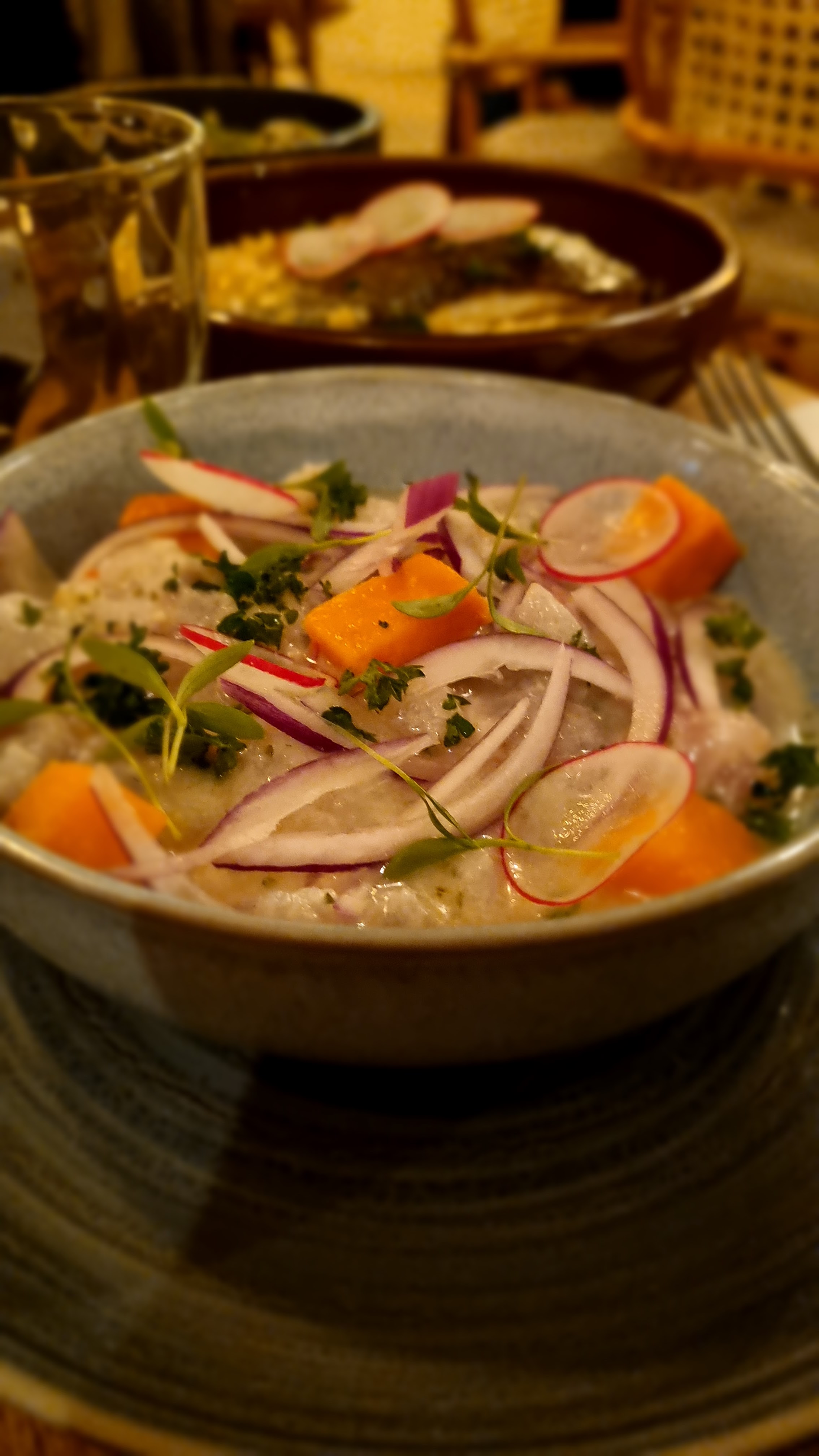 Bien mangé mais sans entendre ses convives. Nous avions réservé au restaurant. Les plats sont très bons (attention si vous n'aimez pas la coriandre elle n'est pas notée sur la carte mais est présente dans beaucoup de plat). Le prix est élevé pour les plats, petit conseil: commandez plusieurs entrées à partager pour votre repas, les ceviches sont excellents. Bémol de la soiree: la salle ambiance. La musique est trop forte. La chanteuse présente ce soir la chante très bien mais la bande son est beaucoup trop forte. On ne s'entend pas... Un cran de volume en dessous et cela aurait été parfait. Sinon précisez bien lors de la réservation que vous désirez une table à la salle restaurant en insistant (notre réservation concernait le restaurant...)