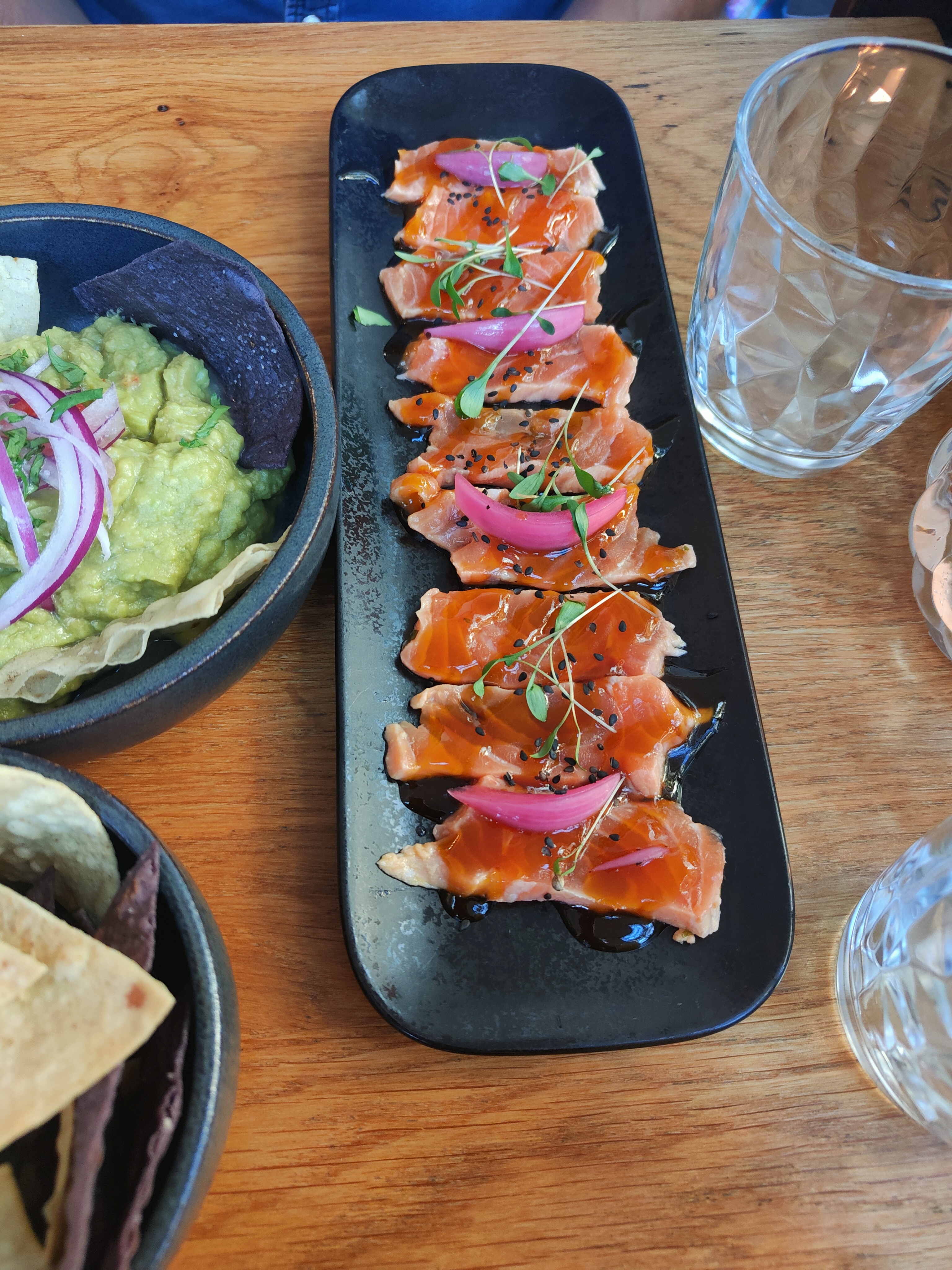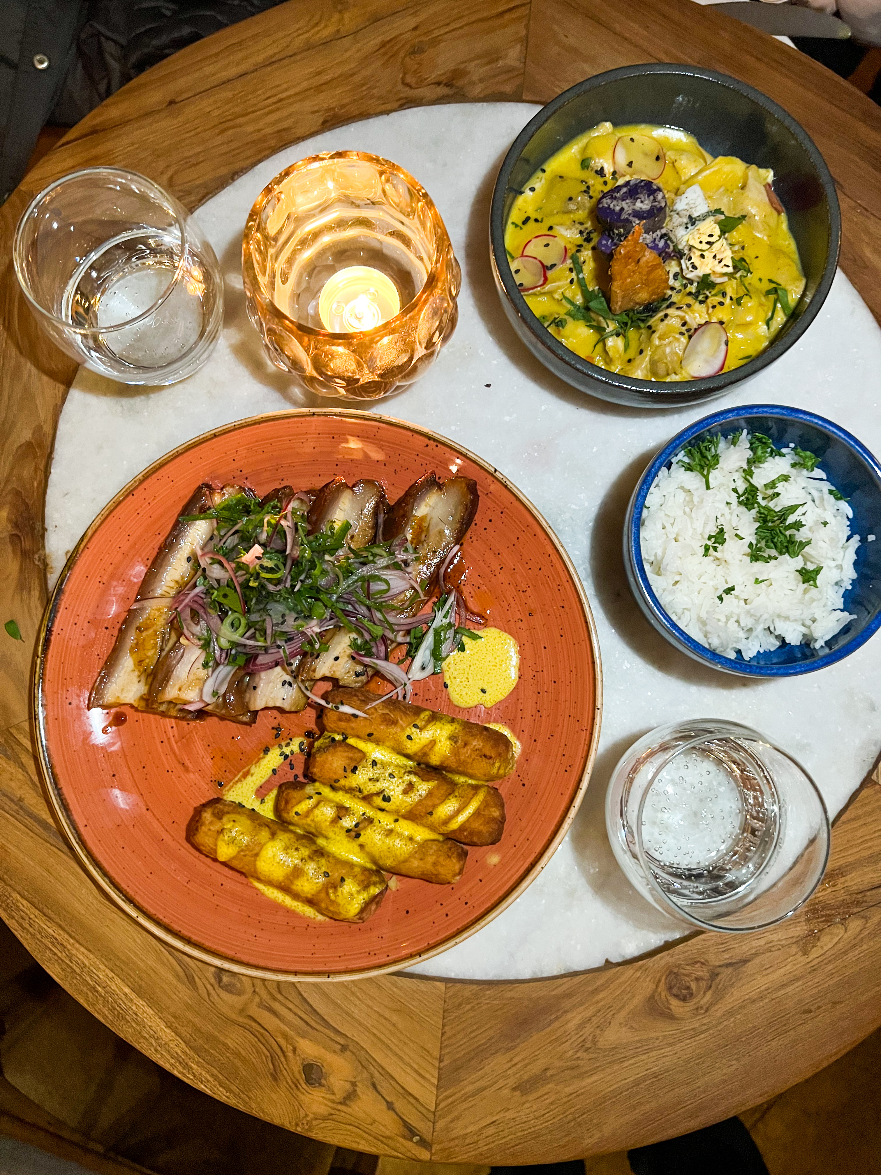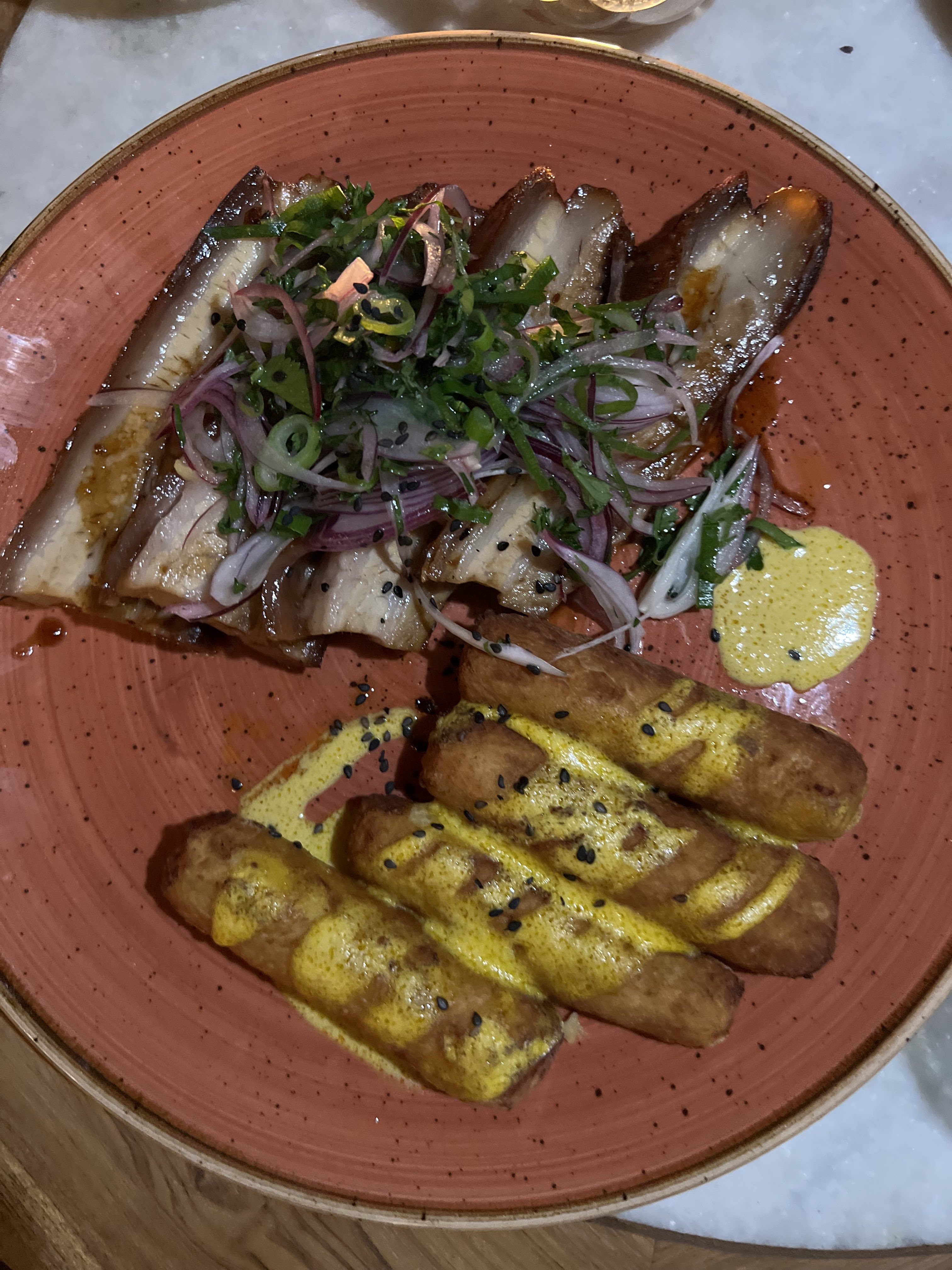 Un RÉGAL et les portions sont GÉNÉREUSES pour les plats. 1 étoile en moins par rapport au riz au lait trop cannelé et riz pas cuit. Le poulpe est très subtile ✅ Le plat de poitrine de porc bien garni ✅ Le Guacamole très bon✅ Tranches de saumon sans + mais bon.