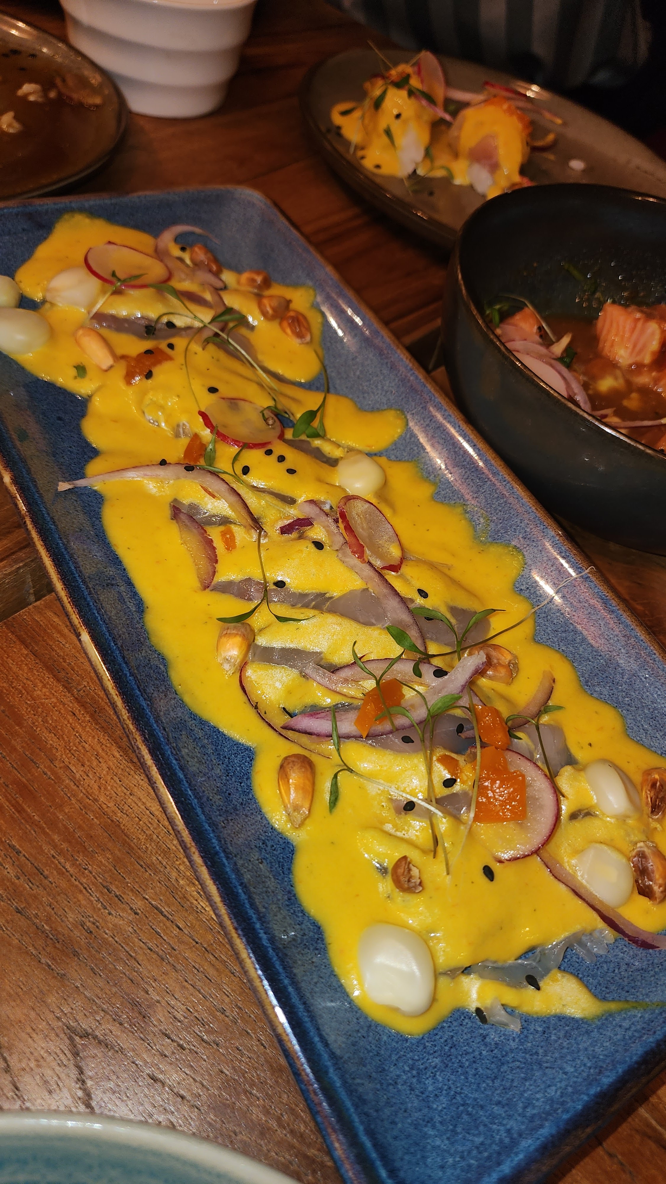 Probablement le meilleur restaurant où j'ai mangé de ma vie ! Tous les plats sont excellents ! Notamment les ceviches et le poulpe ! J'avais réservé un samedi soir pour l'anniversaire d'une proche. Il y a eu un concert ce soir-là, donc la salle était assez bruyante, mais le seul vrai reproche que j'ai, c'est que la pièce était très sombre, on ne distinguait presque pas les plats. Au delà de l'éclairage beaucoup trop tamisé, la soirée était vraiment superbe. Le prix est élevé, mais pour les occasions spéciales, cela vaut le coup de se faire plaisir, car les plats sont incroyables.