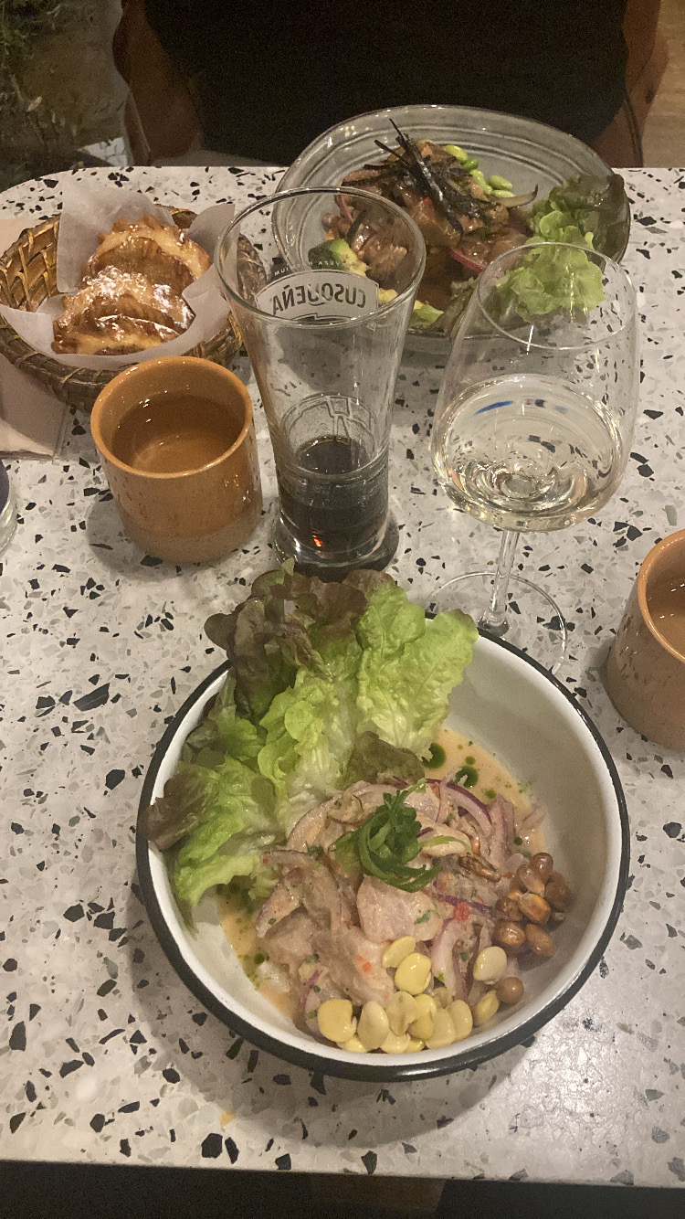 Cocktails très bons. Ceviche excellents (nous avons goûté les 2 recettes) mais attention assez pimentés pour ceux qui craignent. Les portions ne sont pas énormes si vous avez une grosse faim il fait prendre une entrée. Le biscuit tres leches est très léger et épicé à la cannelle, vanille, très bien pour finir le repas.
