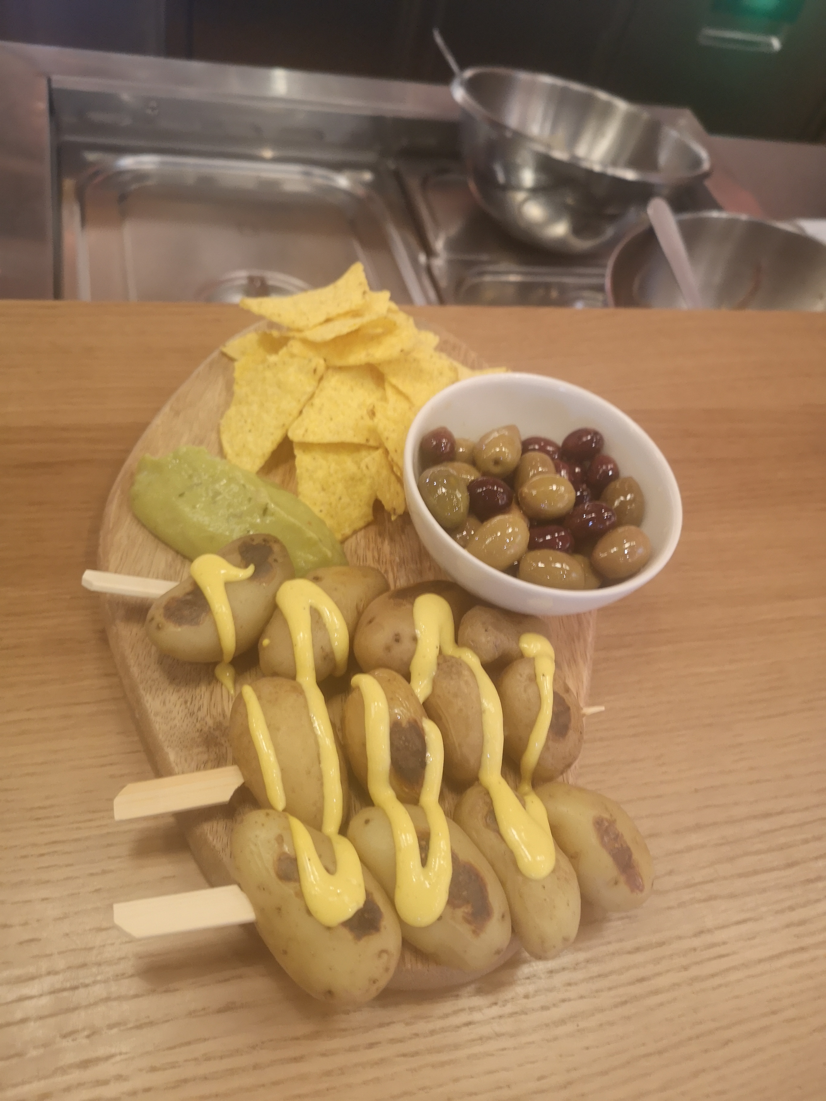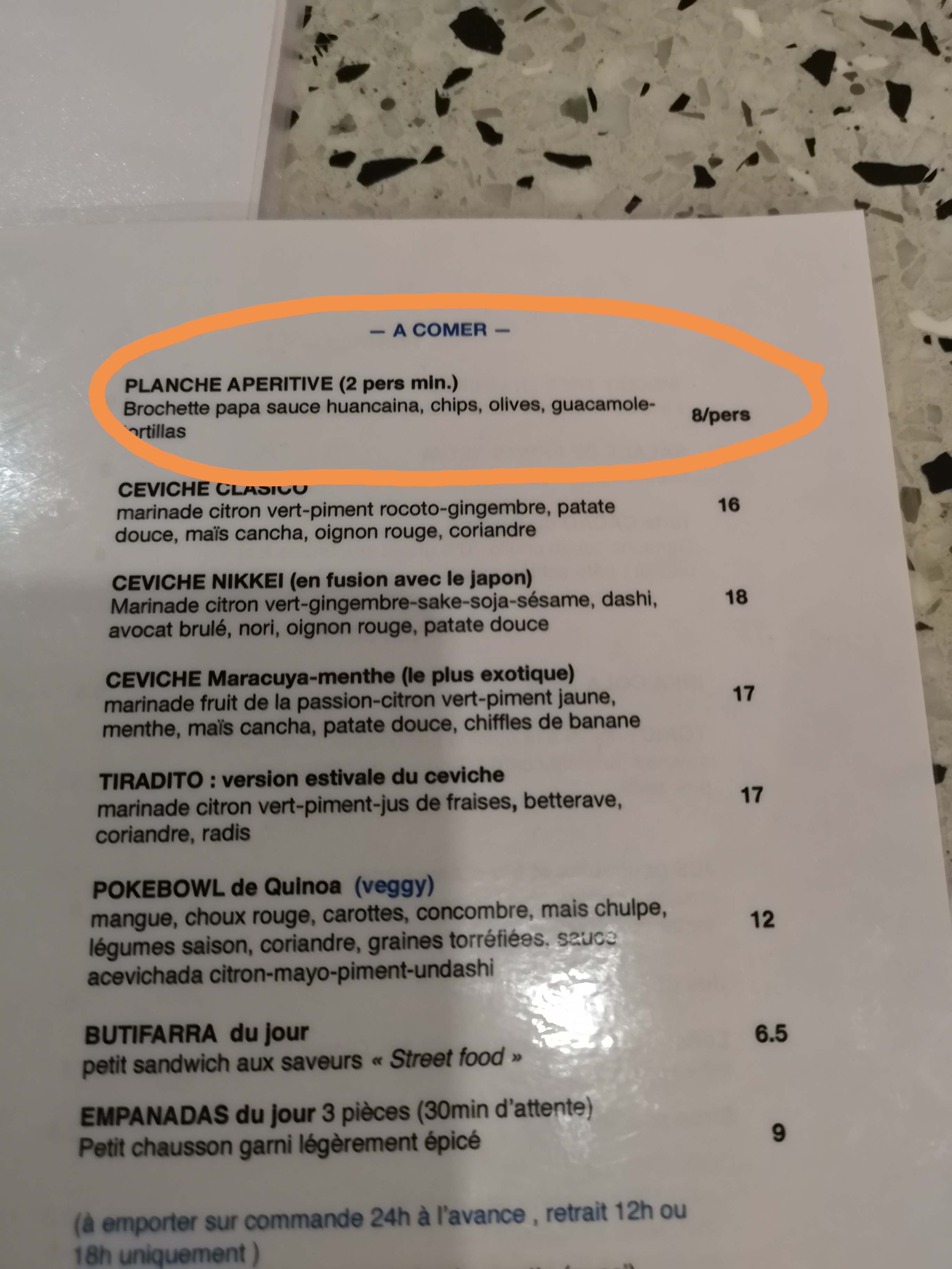 En premier lieu je me permets de remercier le professionnalisme de la responsable du lieu qui témoin de ma déception, malgré ses explications douteuses, à corrigé l'addition vers un prix honnête. Sans cela et en ayant été pris de haut par le serveur je mettais 1 étoile. Bierre au maïs sympa, la carte des ceviches me paraît dans des prix corrects, mais nous sommes là pour un verre rapide en terrasse. Nous commandons des planches apero pour 6, au descriptif alléchant (voir 1ere photo). Ce qui arrive est surprenant, voir deuxième photo. Car c'est une planche pour 3 personnes à 24 euros !! La brochette 'papa' est en fait une brochette de pomme de terre. Quelque soit l'épice utilisée pour la sauce (qui apparemment est rare), le résultat est tout à fait quelquonque en bouche. Les nachos, olives et guacamole qui complètent cette planche ne ratrappent en rien cette impression de vol, même si 'en ce moment les avocats sont chers'. Bref, étant friand du ceviche, j'espère avoir la motivation d'y retourner afin de tordre le cou à mon propre commentaire.