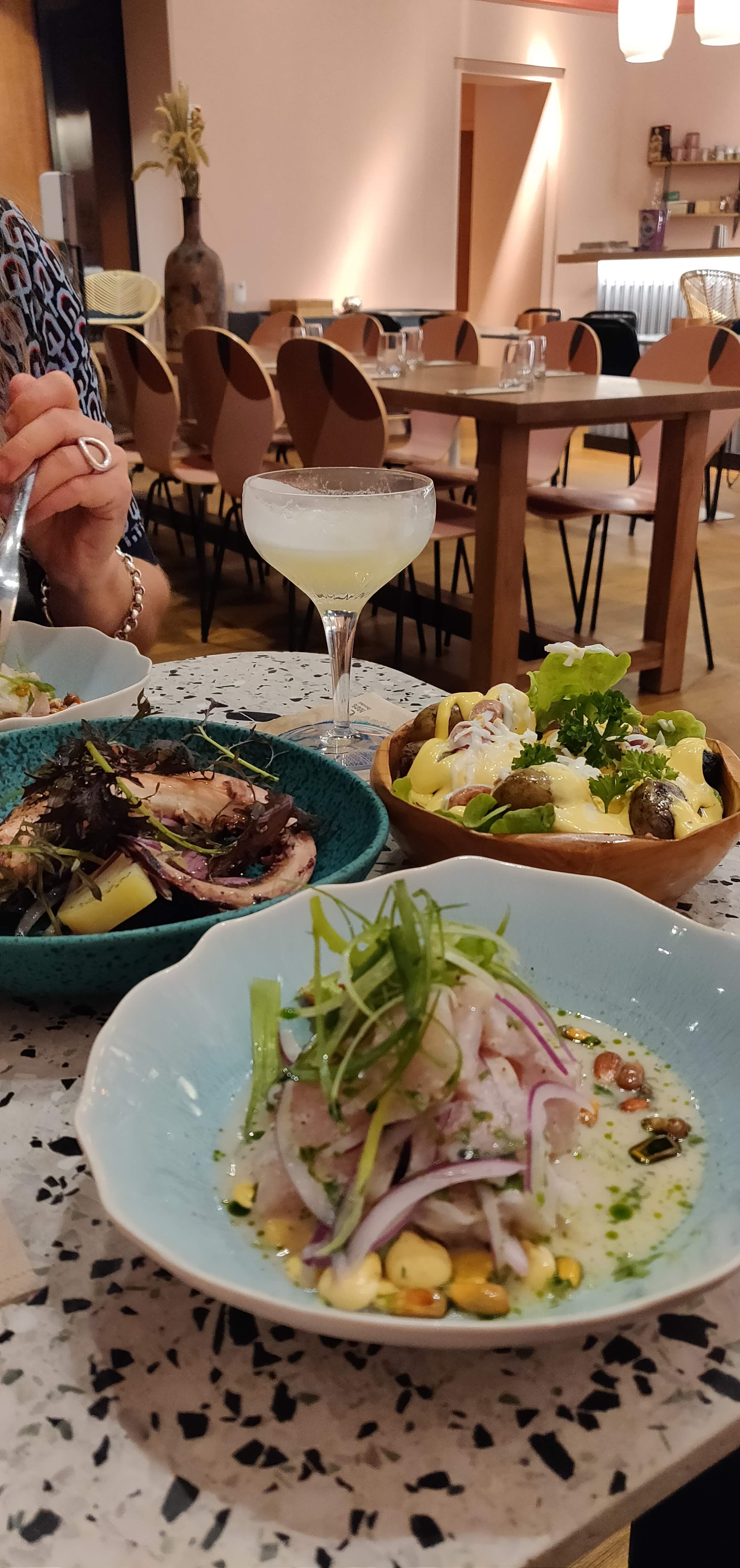 Lieu sympa mais pas de quoi s'extasier non plus. Nous n'avons pas testé les cocktails qui semblent être de belle facture (d'aspect...et de prix). La carte est appétissante mais la désillusion arrive avec la quantité dans l'assiette, inégale selon le plat. Le poulpe Al Olivvo notamment: 3 quartiers de pomme de terre, 2 de betteraves pour accompagner le Poulpe. Le ceviche nikkei relève un peu la note: plat bien relevé et parfumé. Le vin est trop cher payé même s'il est bon. Idem pour le dessert. La tarte choco a l'air appétissante mais se révèle trop sèche. On s'en sort pour plus de 40€ par tête avec un goût d'inachevé et de déception. Le serveur, fort aimable au demeurant, tente de se rattraper en nous offrant un café. Cela ne suffira pas pour enlever cette sanction. Je ne recommande pas cette adresse, à regret car la cuisine péruvienne se démarque de nos lyonnaiseries habituelles. Je ne mets pas de photos, il y en a déjà plein sur d'autres avis.